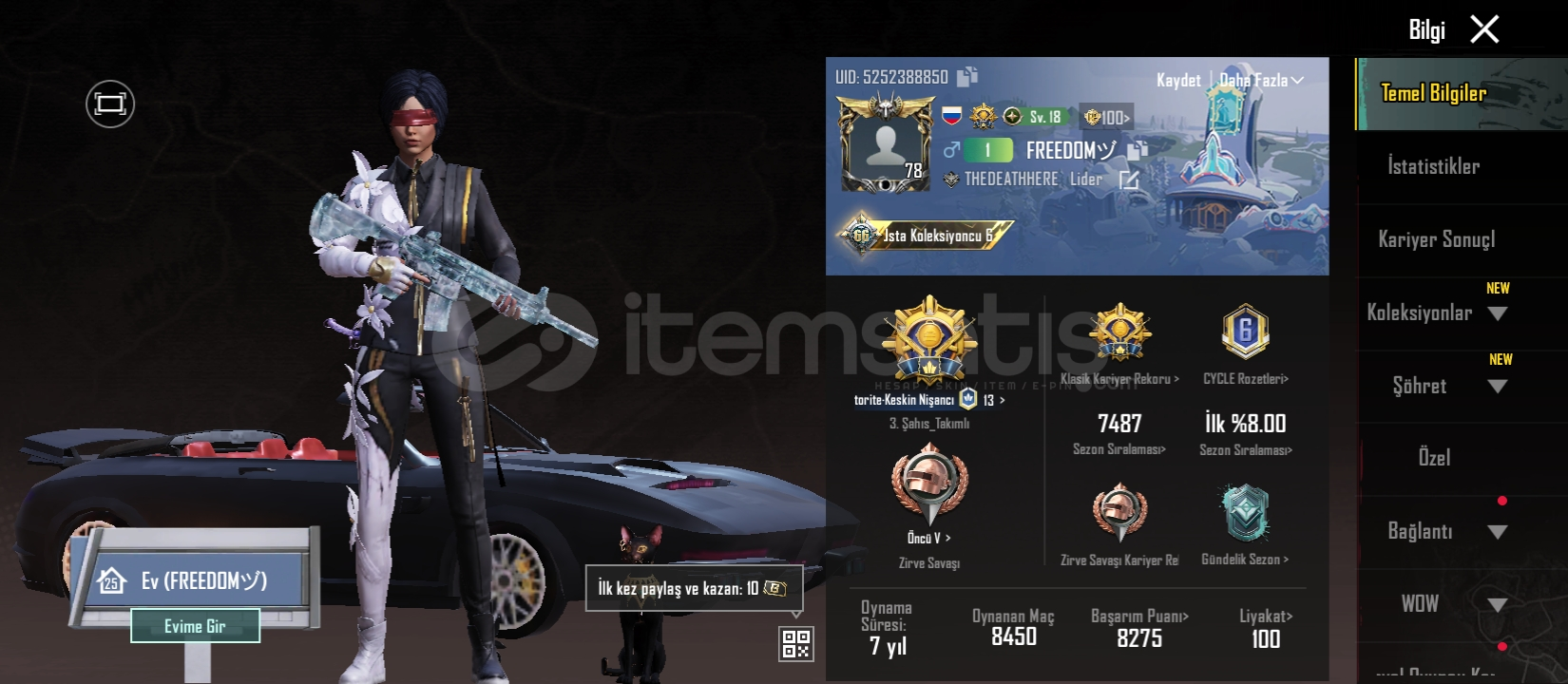 Hesap 66 koleksiyon buz m4 7 seviye mavi forma var s2 koruyucu seti var 54 geliştirilebilir silah spor araba malesef yok 149 destansı hesap firavun hariç bütün x-suit ler var hesabı t@kas üzerinden salıcam standoff ya da bu hesaba eş değer bi pubg hesabı karşılığında salıcam gelip bos yapanın mesajına bakmam