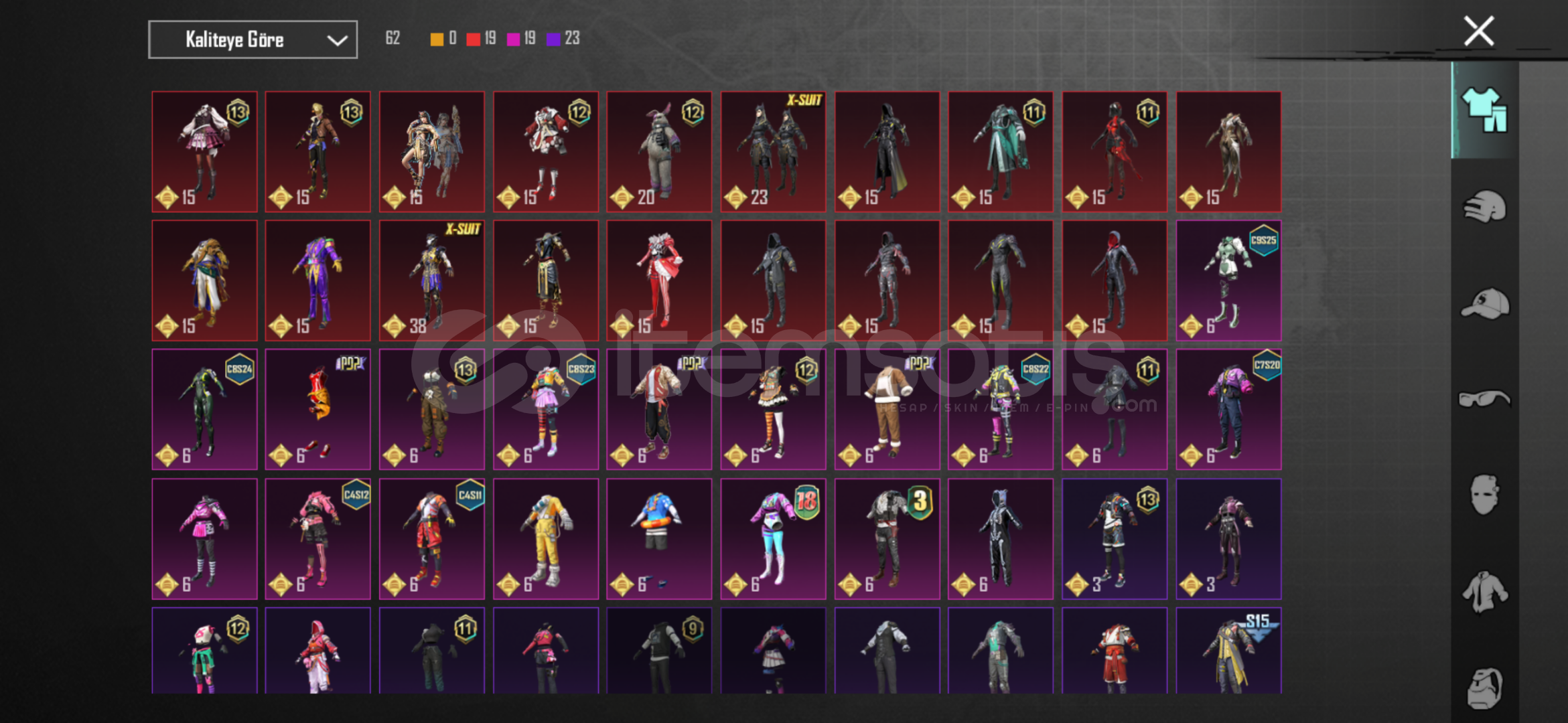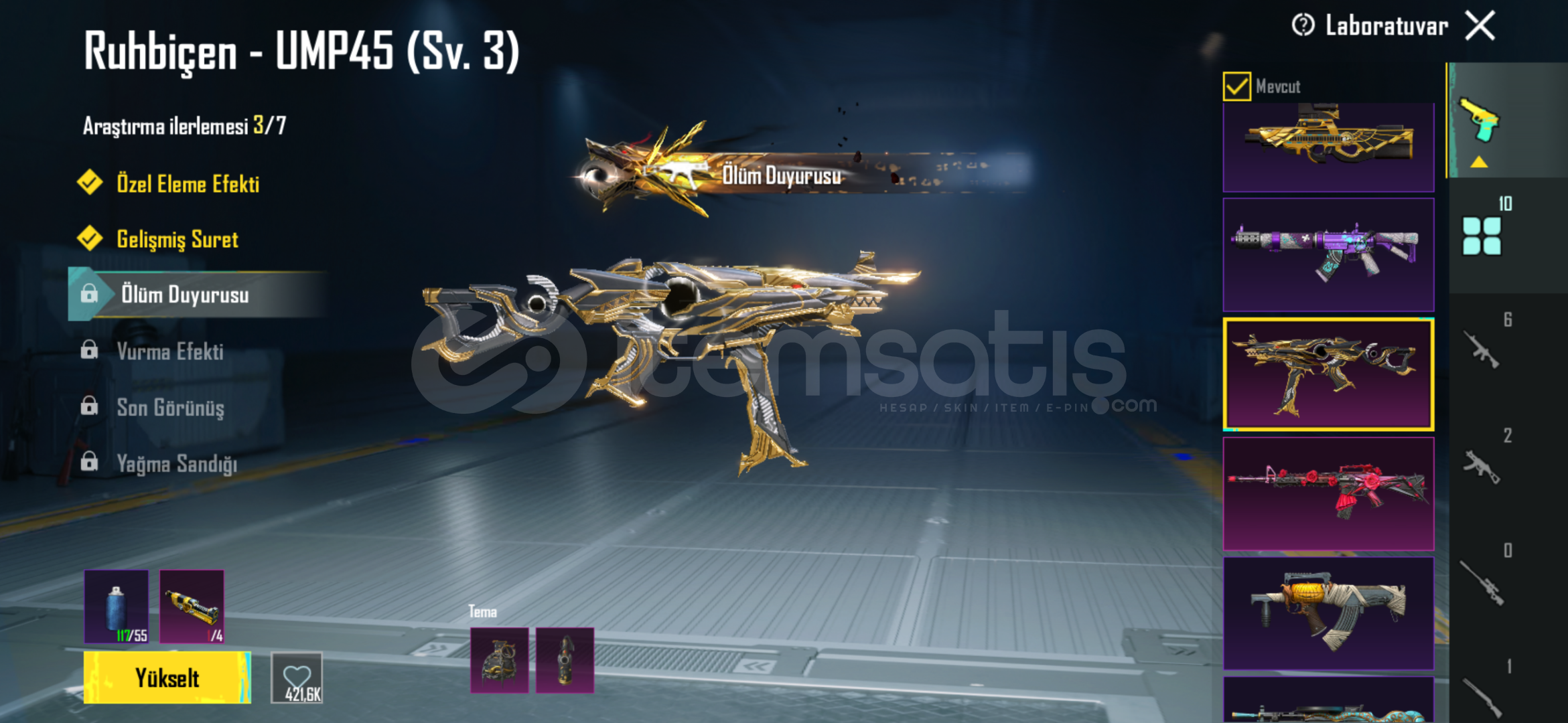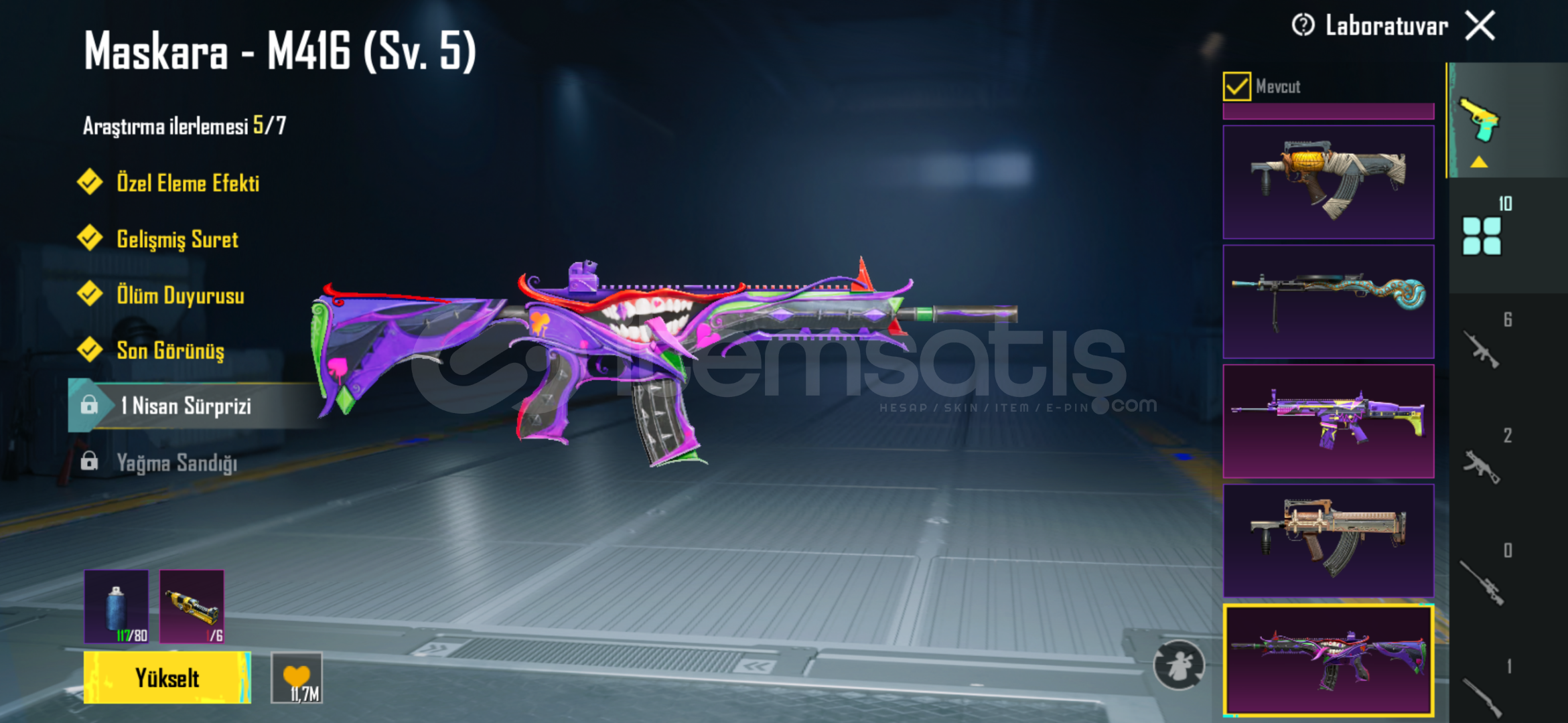 Pazarlık Ederince Olur!!!Acil Satılık!Yükseltilebilir Silahlar:Maskara 5Sv - M416Gecenin Şarkısı 1Sv - GrozaYüksek Ses 1Sv - ScarL (Maskara)Yaldızlı Yeşil Ejderha 1Sv - Dp28Katil Balkağı 2Sv - GrozaDikenli Şafak 3Sv - M16A4Ruhbiçen 3Sv - UMP45Yamalı Tavşan 1Sv - MK47Altın Pençe 1Sv - P90Bakır Gezgin 1Sv - NS2000VE DAHA FAZLASI….