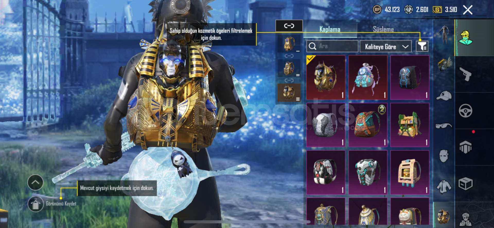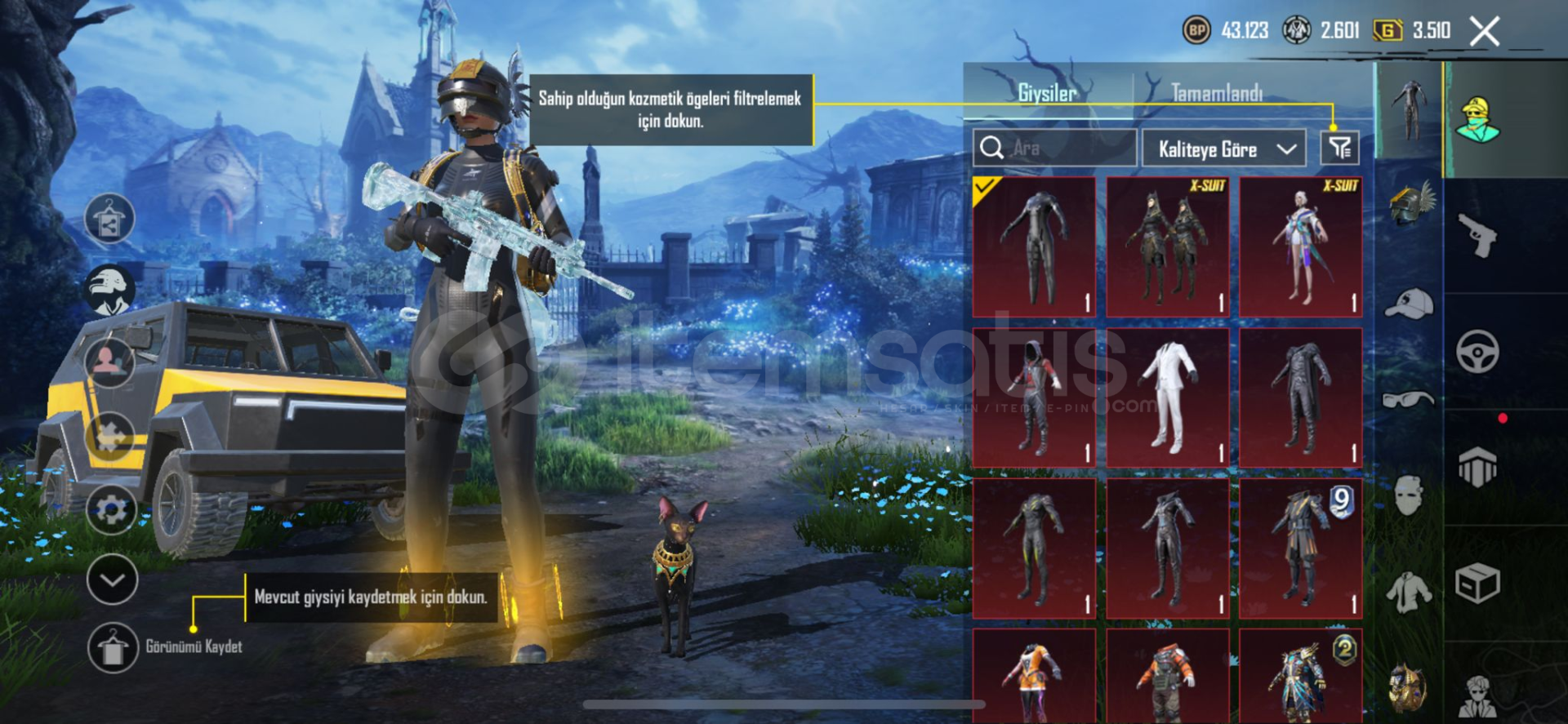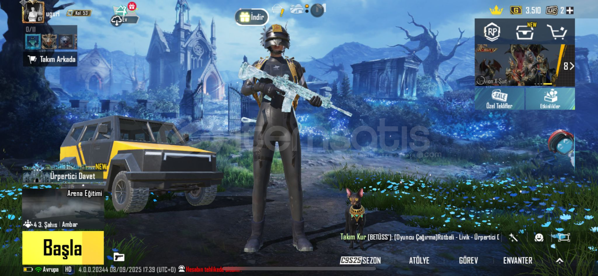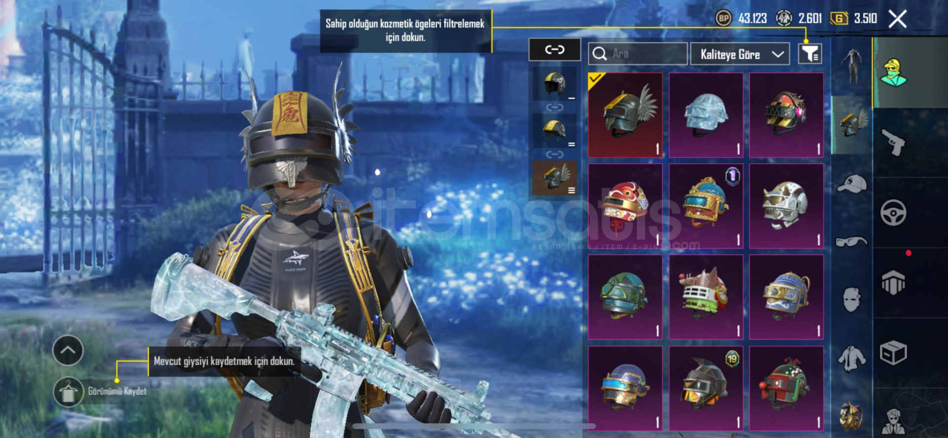 Hesap hakkında bilgiler:67 Seviye, En yüksek kademe As Otoritesi, s19 Hesabı, 54 Koleksiyon Seviyesi, 74 Destansı ve Destansı Gösteriş, 17 Geliştirilebilir Silah.Hesaptaki Önemli İtemler:Xsuit: Anukhra, Galadria.Önemli Silah: Buz Diyarı m416 (6 seviye), Altın Pençe P90 (3 seviye), Ruhbiçen Ump (3 seviye), Midilli M762 (4 Seviye Ölüm duyurusu), Vahşet Uzi (2 seviye)Önemli Set: Dalg...
