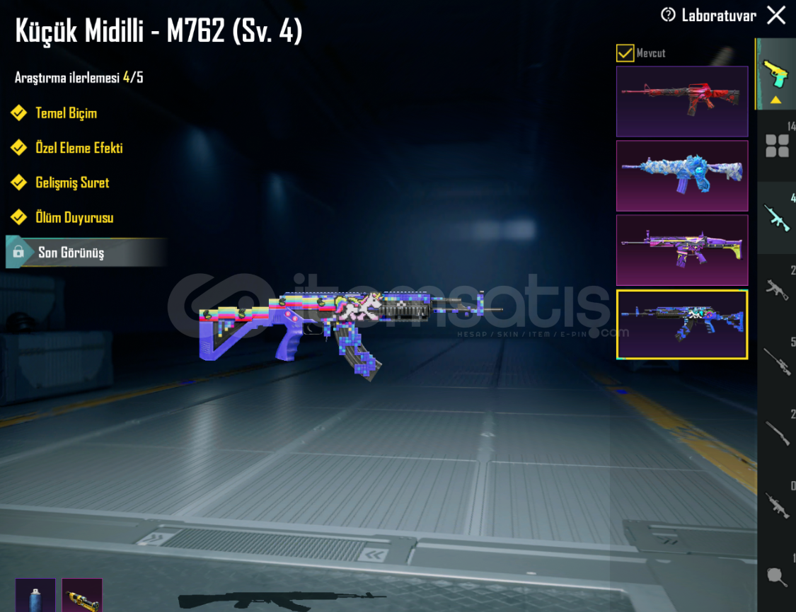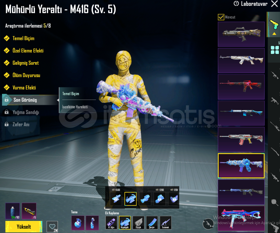 Yükseltmeli SilahlarMumya M416- 5sv(eklentili)Mor İntikam Awm- 4sv(eklentili)Küçük Midilli M762- 4sv(killchat)Denizler Evrimi Ump- 3sv(killchat)Kanlı Diş Vector- 2svYüksek Ses ScarL- 2svEjder Katili Pala- 2svDikenli Şafak M16A4- 1svBakır Gezgini NS2000- 1svNarin Tetik SKS- 1svDeniz Rüyası Melodisi SLR- 1sv Atomik Tetik S12K- 1svBüyü Patlaması- 1svYedi Denizler M24- 1svMumya El bombası (killchat)Mumya Molotof (killc...