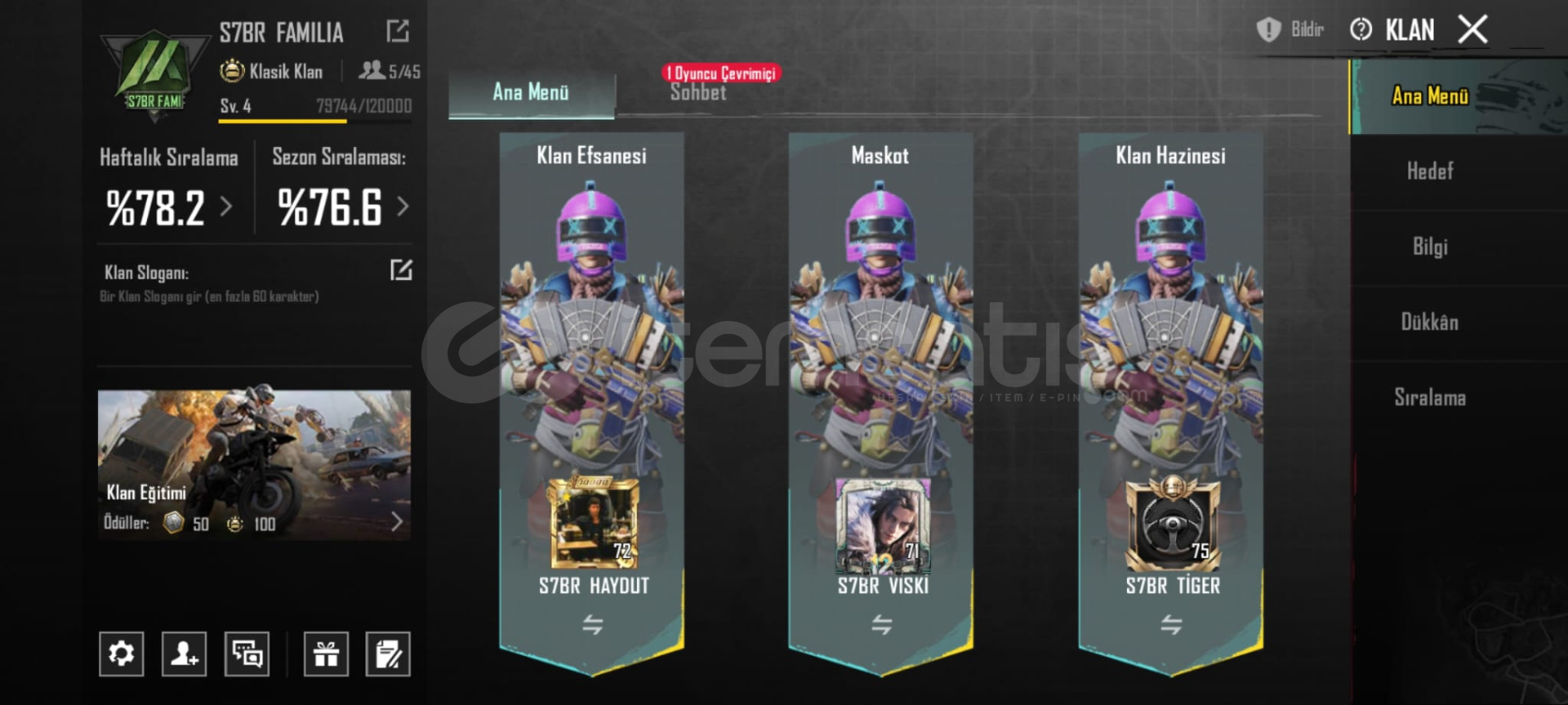 54 koleksiyon 63 Destansı 14 Yükseltilebilir 6 Tanesin Ölüm Duyurusu Açık Hesabın İçinde 5 seviyeye Çok Az kalmış KLAN verilecektir 2. Sezon itemleri mevcuttur