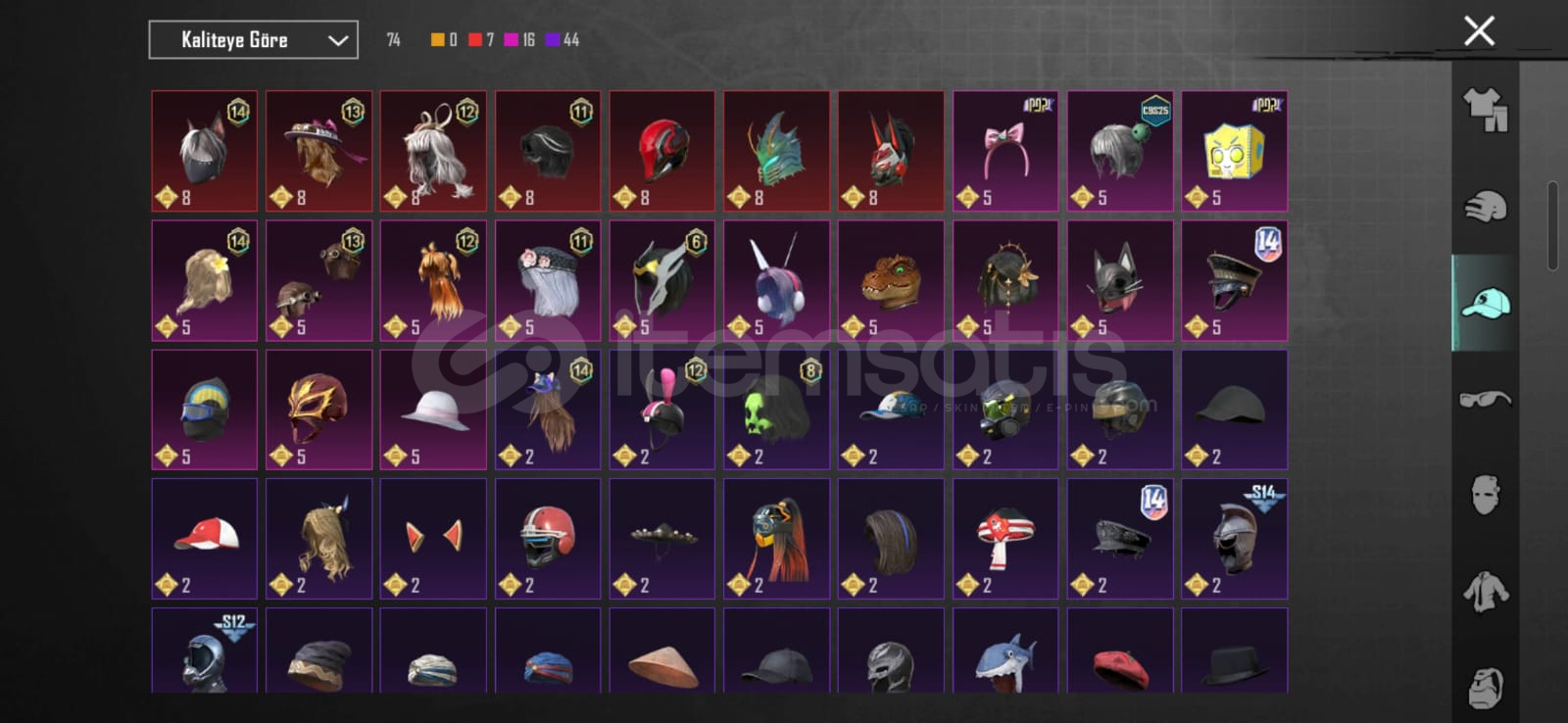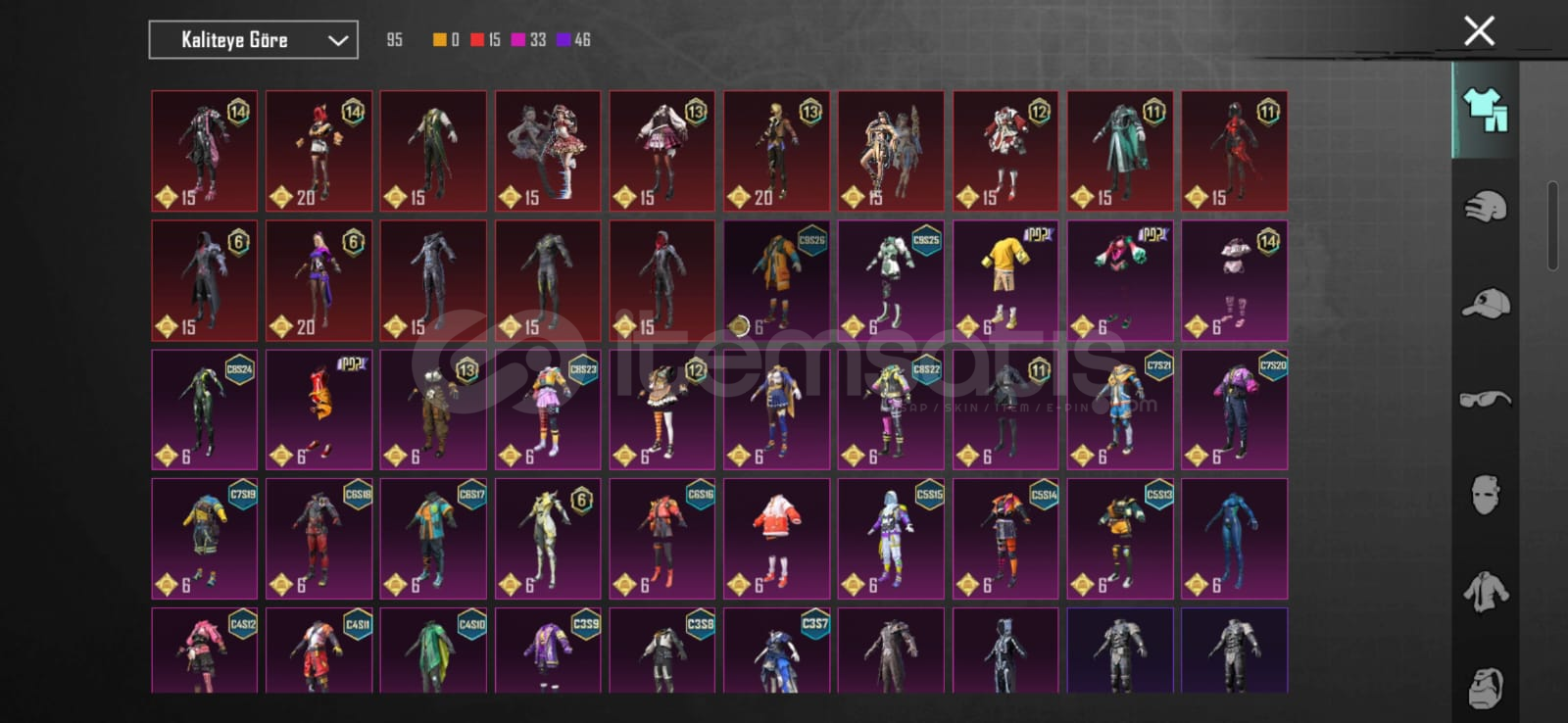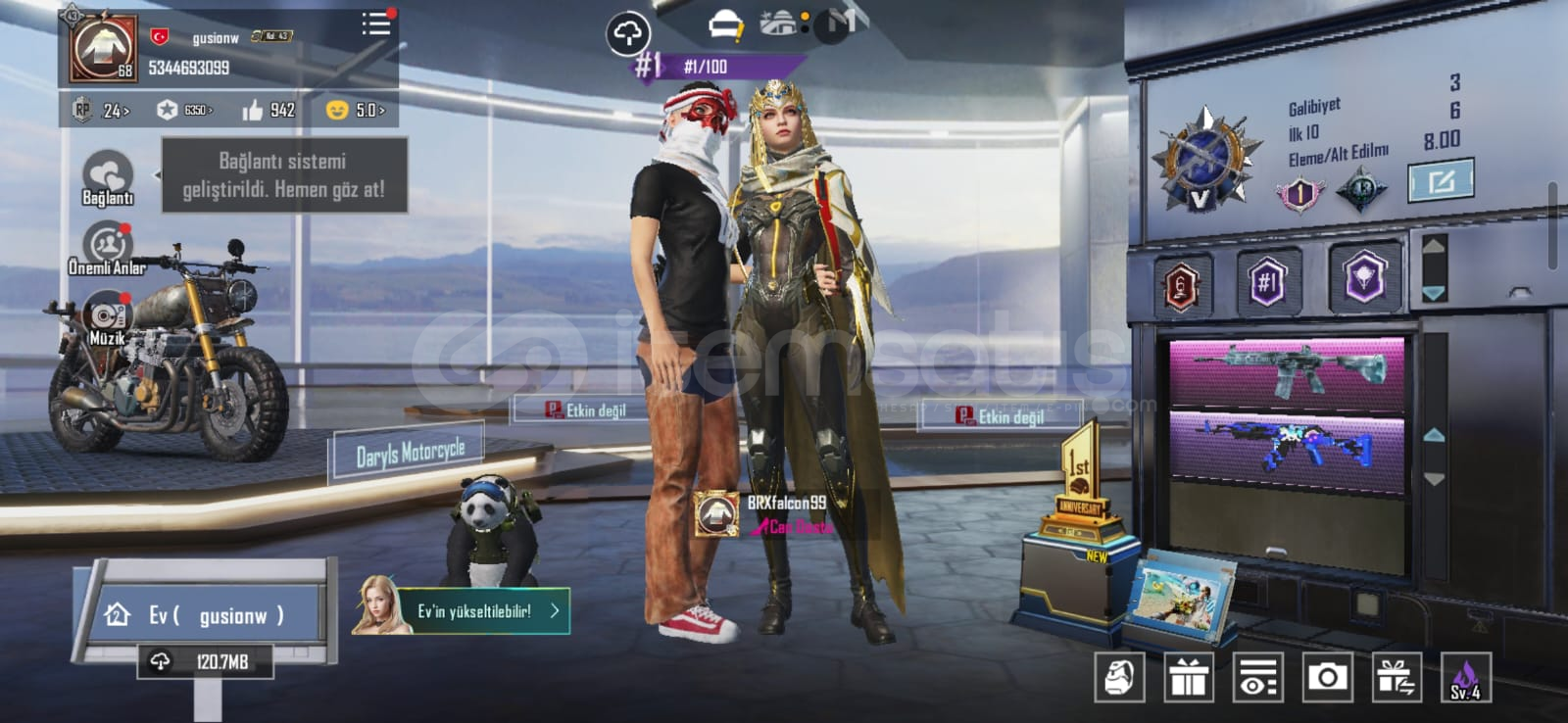 Toplam 25 destansı vardır+Yeni gelen xsuit seti +İşgalci +Seri KatilBuz Diyarı M416 4LVL + Midilli M7 4LVL +Maskara Scar-l 1 level +8 yükseltilebilir silah mevcutturThe Walking Dead Siyah tişörtü mevcuttur + Daryls Motorcyle vardırToplam 5 sezon royale pass açılmıştır a14+a13+a12+a11+a6 a12 95 leveldirFiravun bombası +Firavun sis bombası +3 Upgrade molotof vardır