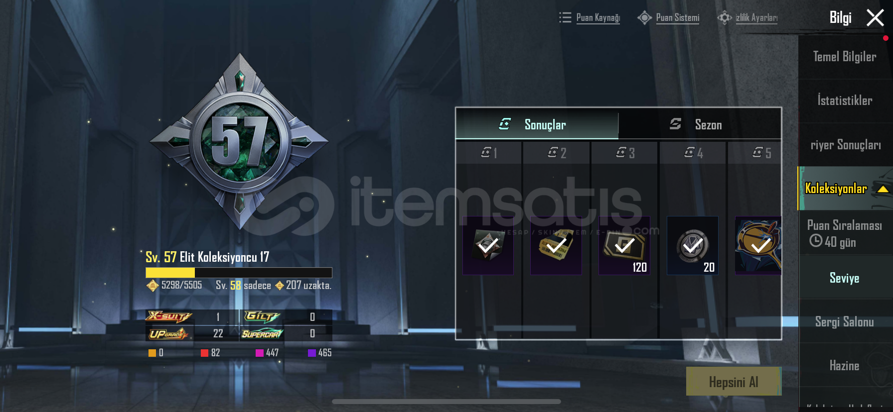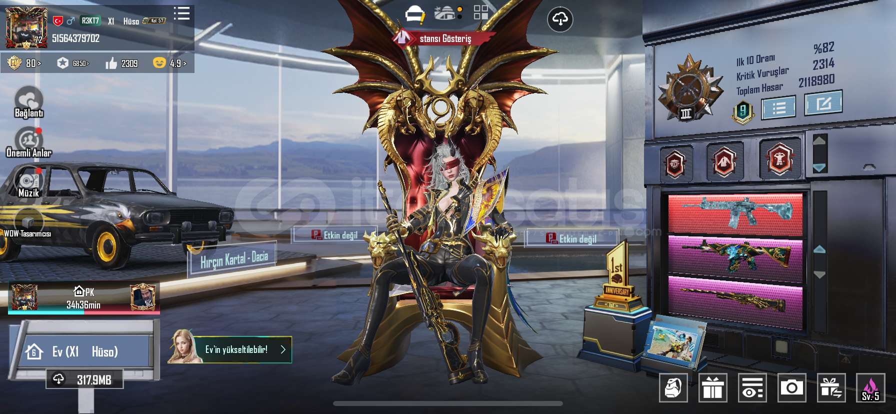 72 level 57 koleksiyon 82 destansı X suit (1) Dravion X suit 2 lvl 22 yükseltirilebilir BUZ M416 MAX YAKAN KÜKREME M416 4lvlmg 3 m7 Midilli 3 ump max pala max geri kalanlar 1 ve 2 lvl falan + 8 meteryal + 6 nihai parçomen var