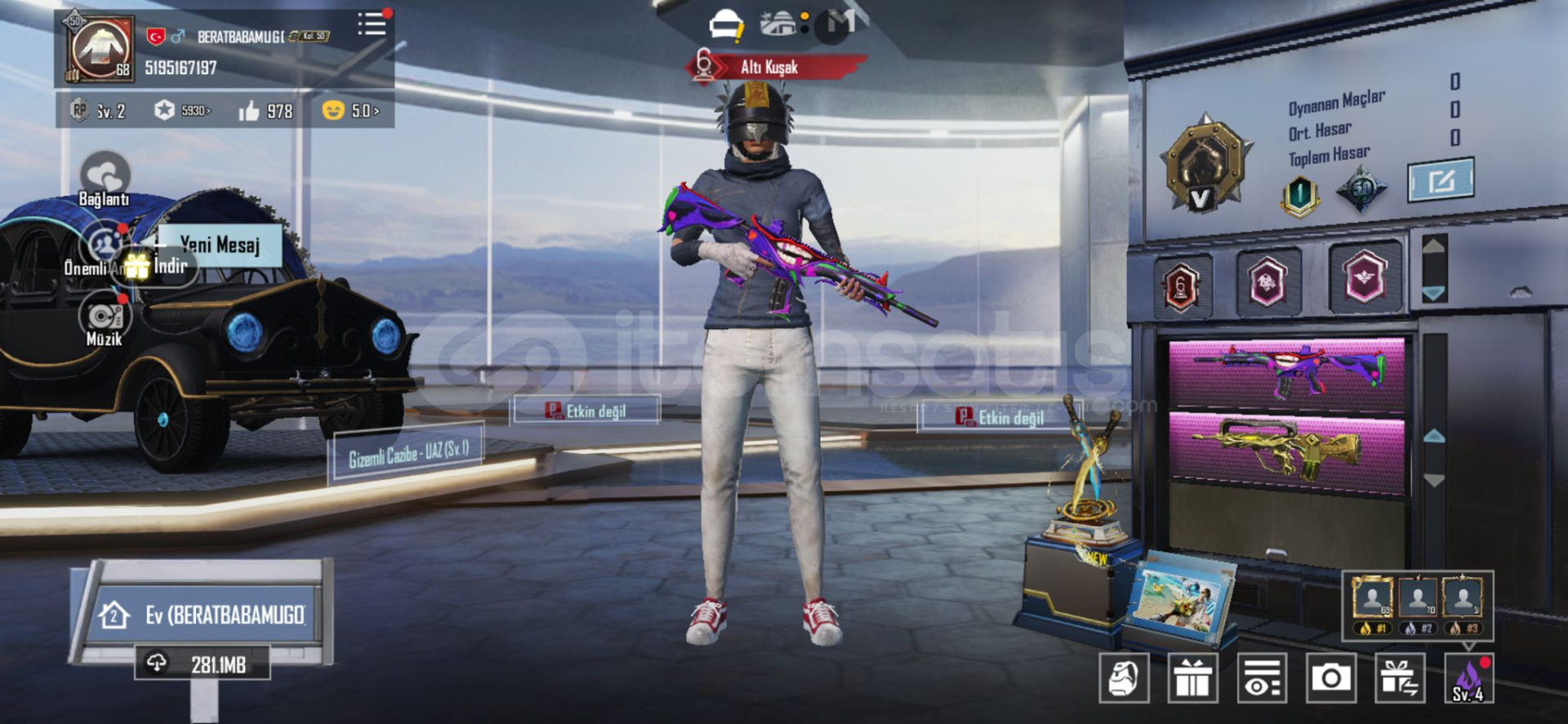 PUBG MOBİLE 7 YILLIK TERTEMİZ HESAPTIR.EMEK HESABIDIR İLK SAHİBİYİM.42 DESTANSI MASKARA M4 6 SEVİYEDİR. 5930 BAŞARI PUANI VARDIR.68 SEVİYEDİR.KOLEKSİYON SEVİYESİ 50'DİR.YÜKSELTİLEBİLİR 11 ADET SİLAH VE 2 ADET ARAÇ VARDIR BİRİ TOROS BİRİSİ UAZ.EKSTRADAN KOMUTAN ALTI VE CREW ÜSTLÜĞÜ VARDIR.MASKELİ MEDYUM SETİ VE BAŞLIĞI VAR...