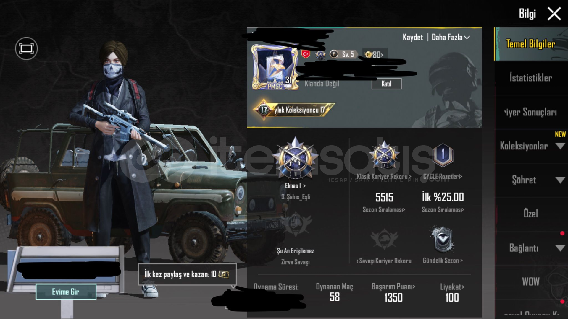 Hesaba total 1000 uc kadar yatırılmıştır.Başlangıç için güzel hesaptır.Şuanda elmas kademesinde.bilgileri üzerinize devredilecek.