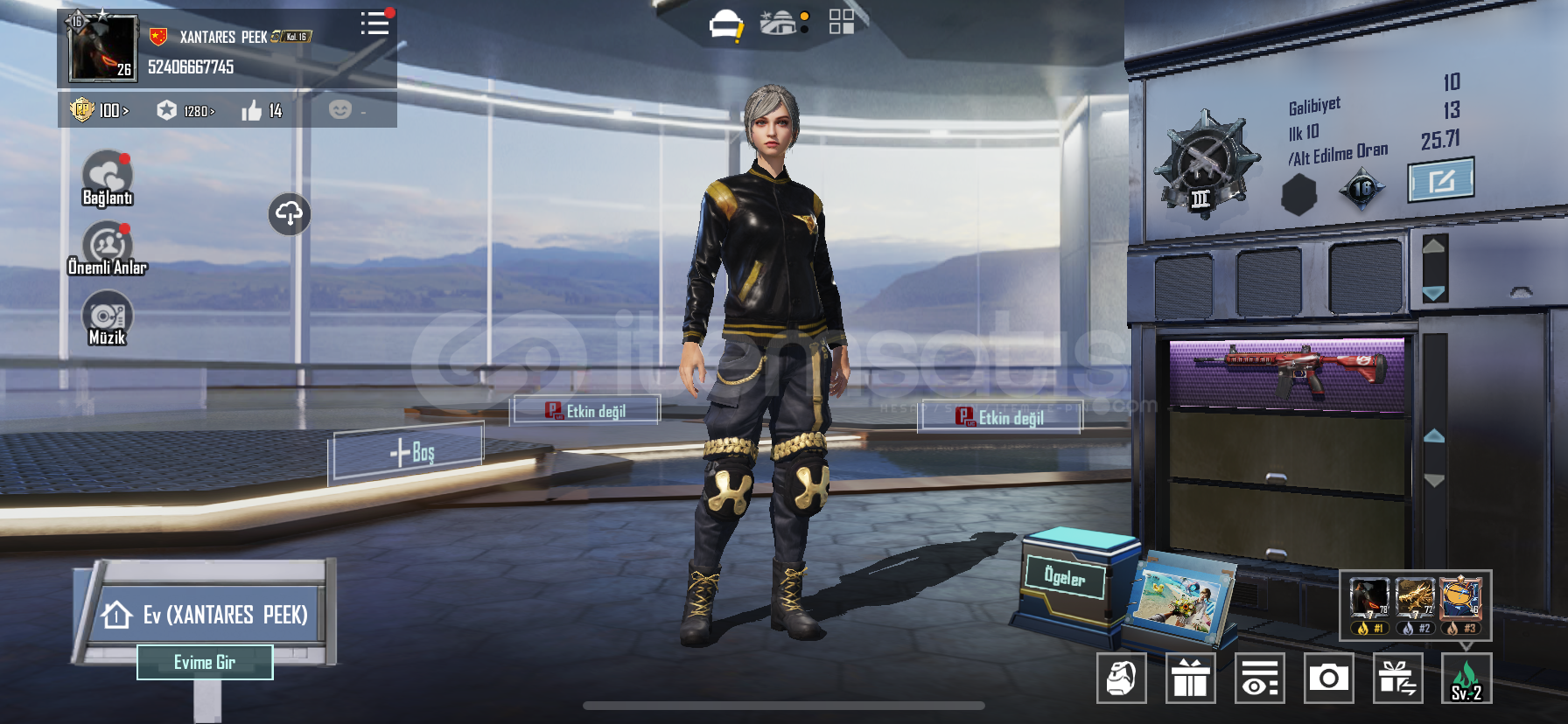 52406667745Hesabın ID si yukarıda olup detaylı bir şekilde koleksiyona bakabilirsiniz.Koyu altı, şapkası ve ayakkabısı vardır.1 aylık Prime açıktır.Ekstra olarak hesapta 100 uc vardır.Tek bağ e posta değişim aktif..