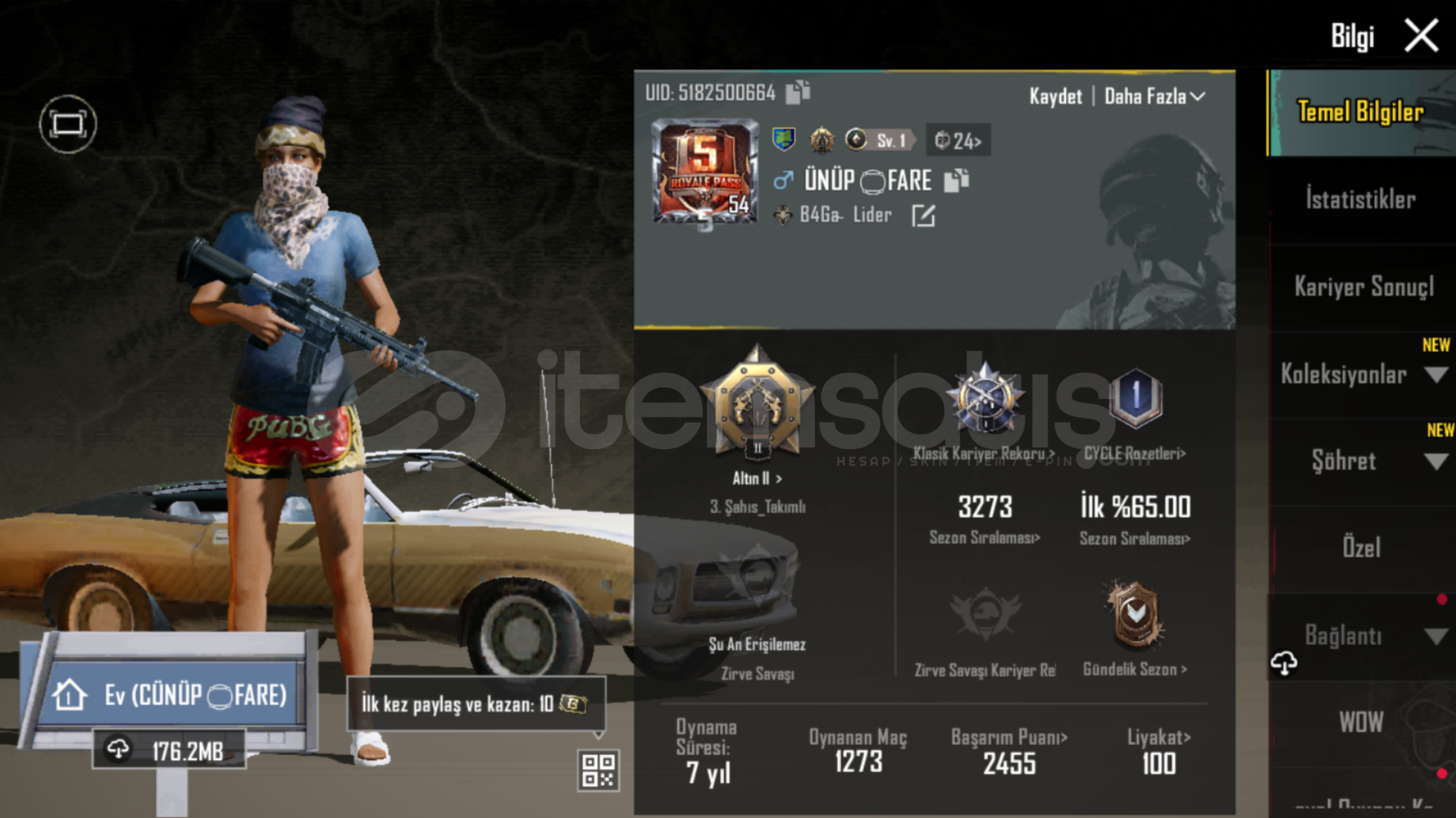 Hesapta isim değiştirme kartı mevcuthesap sezon 5 hesabıdırnadir öğeler bulunur (leopar maskesi mumya üst)hesabı alıcak kişiye direk mail verilicek eposta şifre telefon ile değişim yapılcakHESAP İD:5182500664Hesapta twitter bağlı kaldırıldı şuan 2 gün sonra hesaptan bağı kalkıcak
