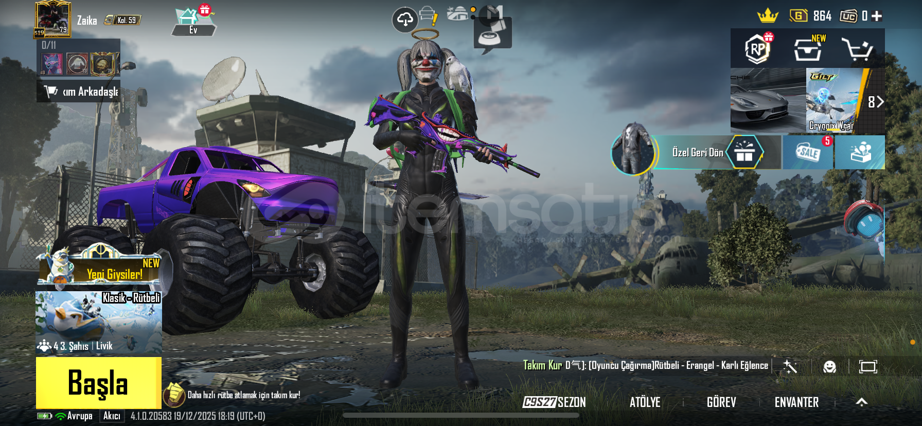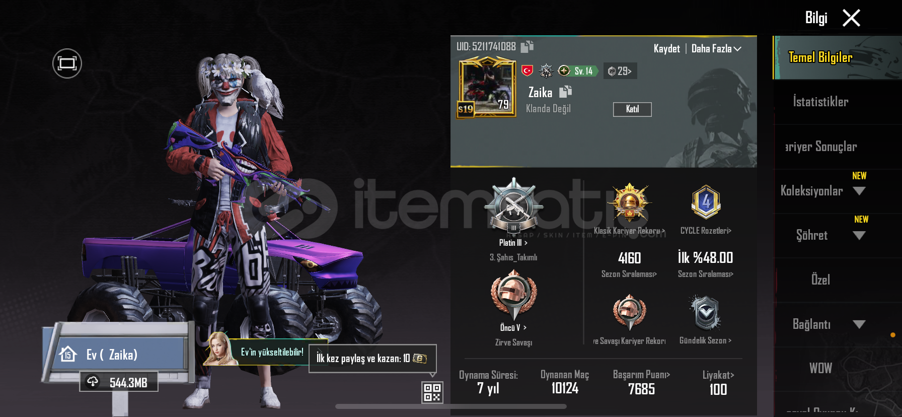 s19 fatih s3 hesabı s5 ten beri rp si açık 73 destansılı 17 yükseltilebilir silah mevcut Maskara 5 vb silahlar var Dm üzerinden detaylı video atılır numara ekli değil e posta twiter apple bağlı ve devredilir temiz hesap kendi main hesabım başka kulanıcısı yoktur para ihtiyacından ve oyunu bıraktığımdan satıyorum