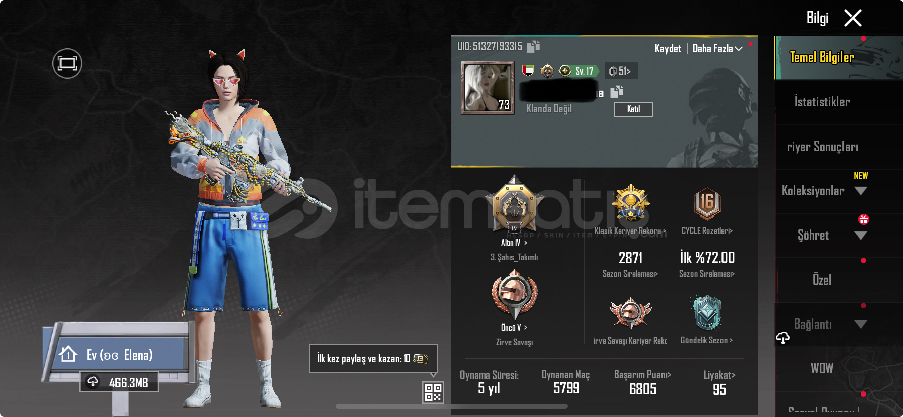 Öncelikle selamınaleykümDüşük olmasının sebebi uc bni bulunmasıdırsadece rütbeli maç oynayamazsınız geri her modu oynayabilirsiniz zirve kasabilirsinizHesap 55 KoleksiyondurHesap Tek BağdırForm geçmişi bulunmamaktadırÖmür boyu kefilizDaha Fazla Detay İçin Dm