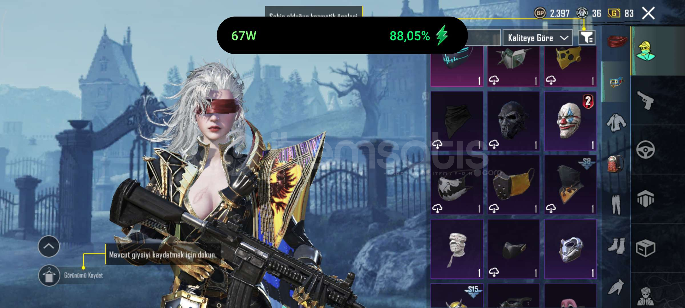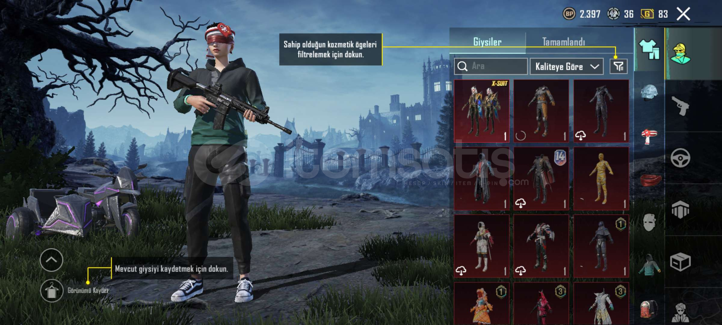 pazarlık payı vardır sezon 2 maskesi sarı mumya x suit buz diyarı kask vardır midilli m7 yukseltilebilir silahları vardır bazısı fullanmiştir 70 lvldir hesap sorunuz varsa yazabilirsiniz alıcısına ho