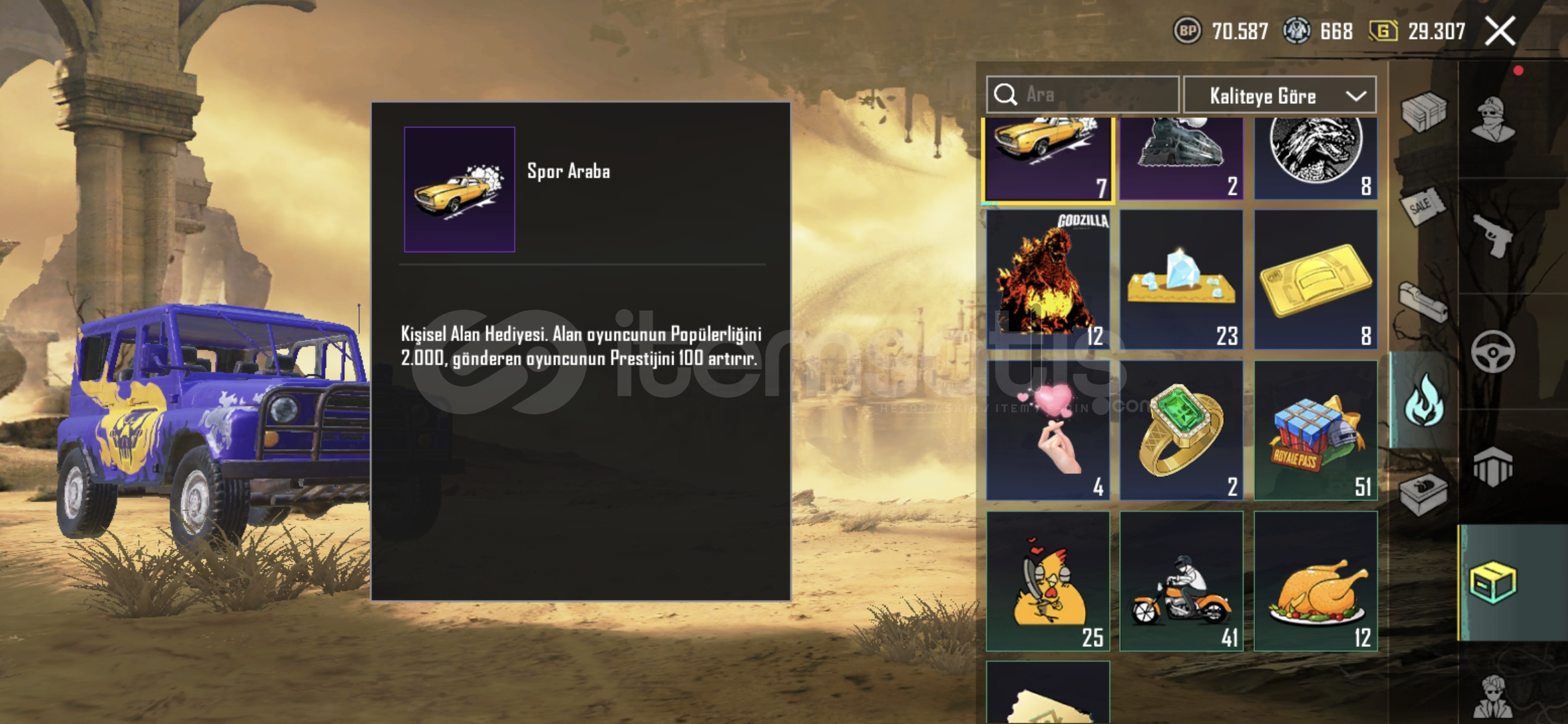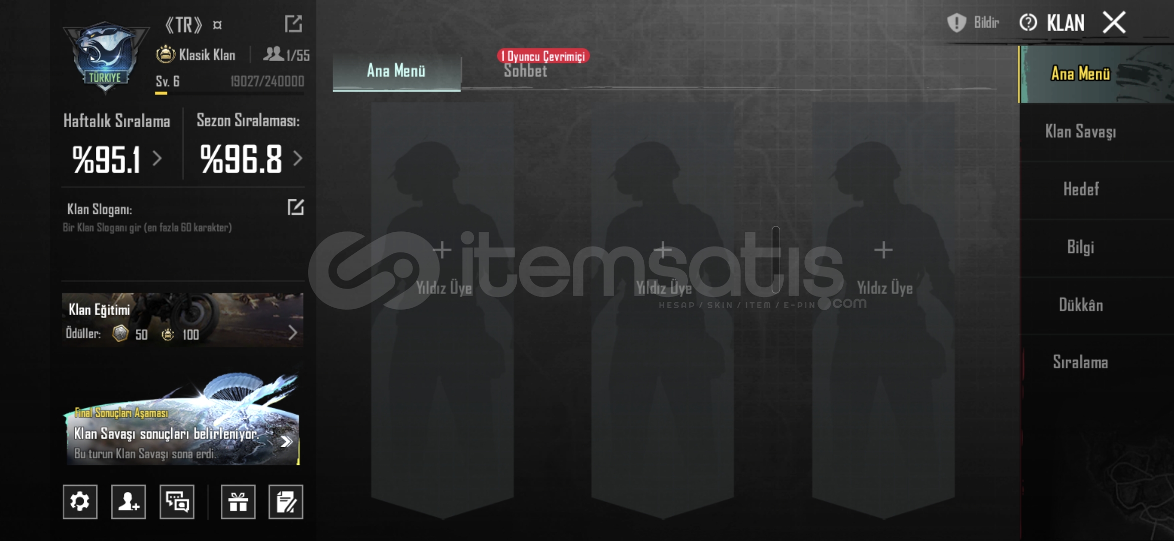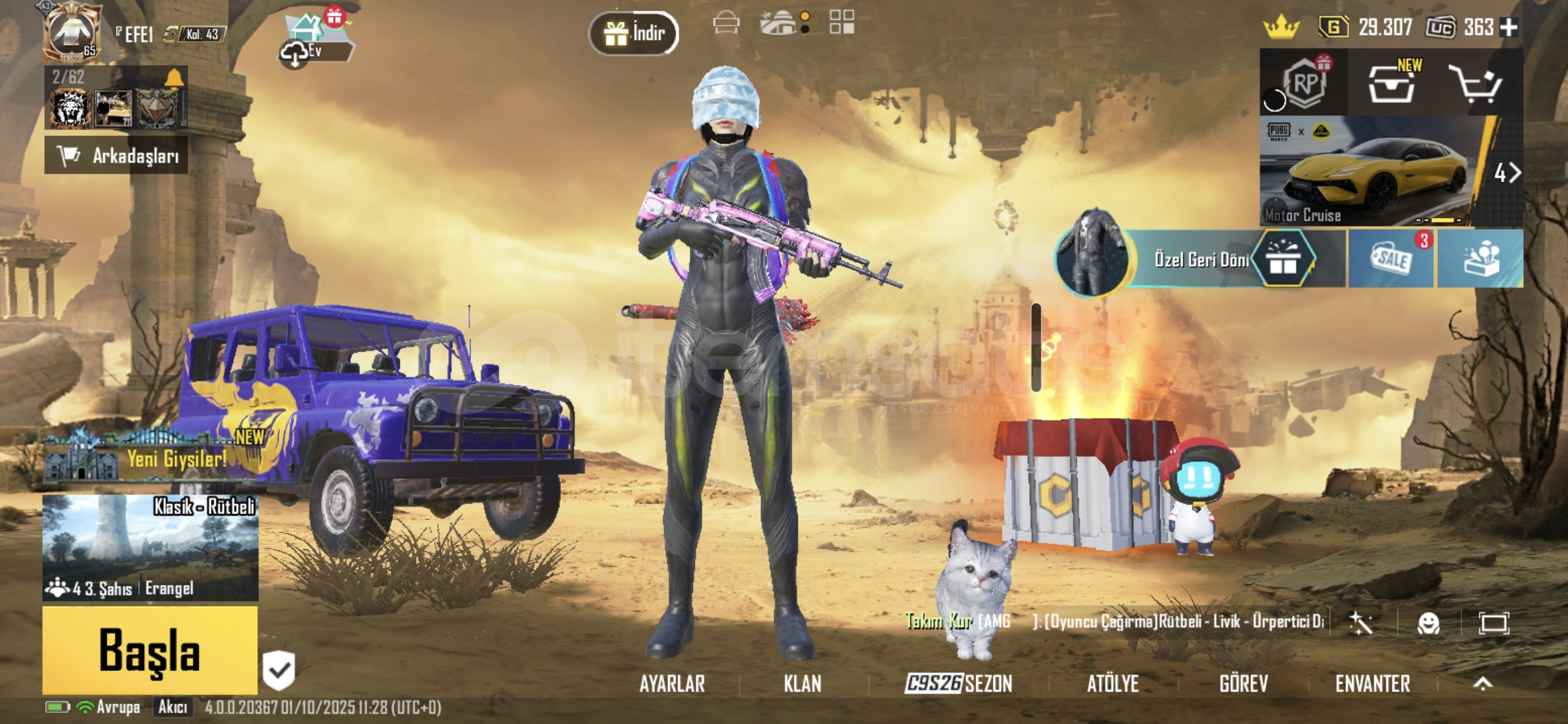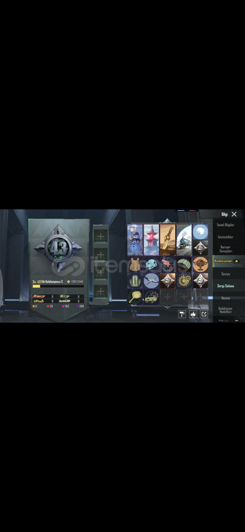 6.sezondan beri bende olan hesabımda 43.seviye koleksiyon 23 desatnı 8 yükseltiebilir silah 2 yükseltilebilir araba 7 sezon royale pass açılmıştır hesapta atilabilir 60.360 pöpülerlik vardır 6 seviye klan lideridir ve hesapta şu anda 360 UC ve 29.000 AG vardır alıcıya şimdiden hayırlı olsun instagram hesabım:efe_b0