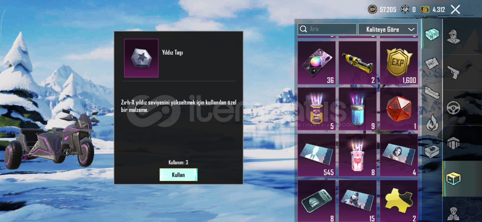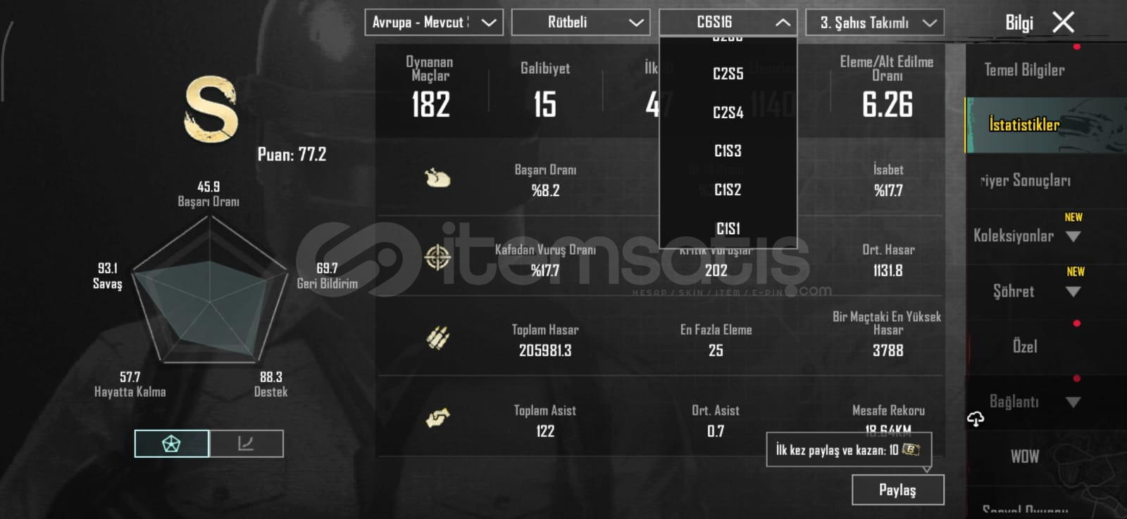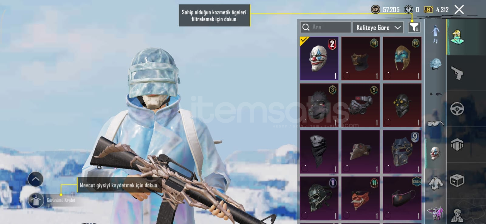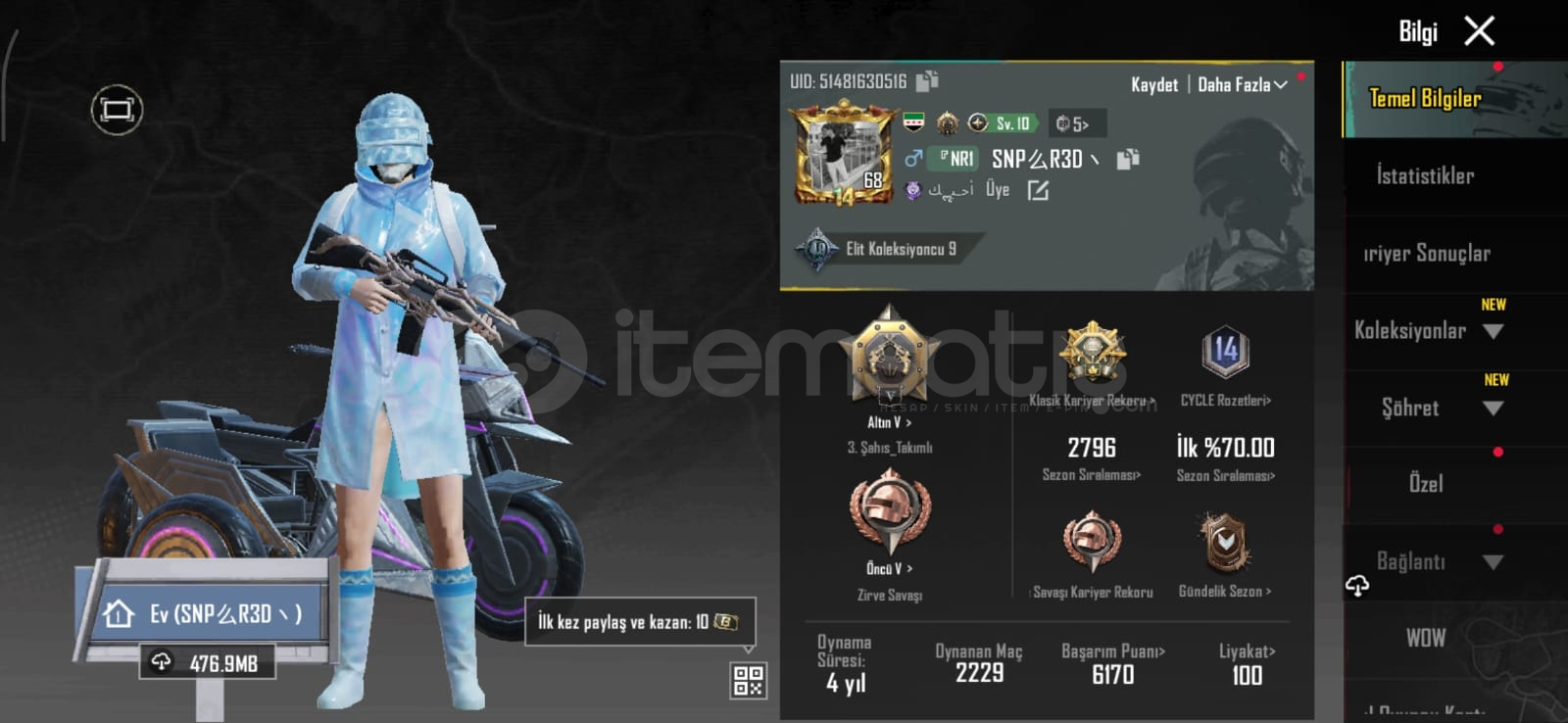 •6 tane geliştirilebilir silah.•avrupa sunucusu.•en yüksek kademe as ustası.•iki modifikasyon malzemesi (materyal) mevcut.•popülerlik 188k•2 adet id (isim) kartı mevcut.• mükemmelliyetçi, eşsiz başarı ve üstün başarı ünvanları.Diğer detaylar fotoğraflarda bulunmaktadır. İletişim için instagram: edoynixPazarlık yapılır :)