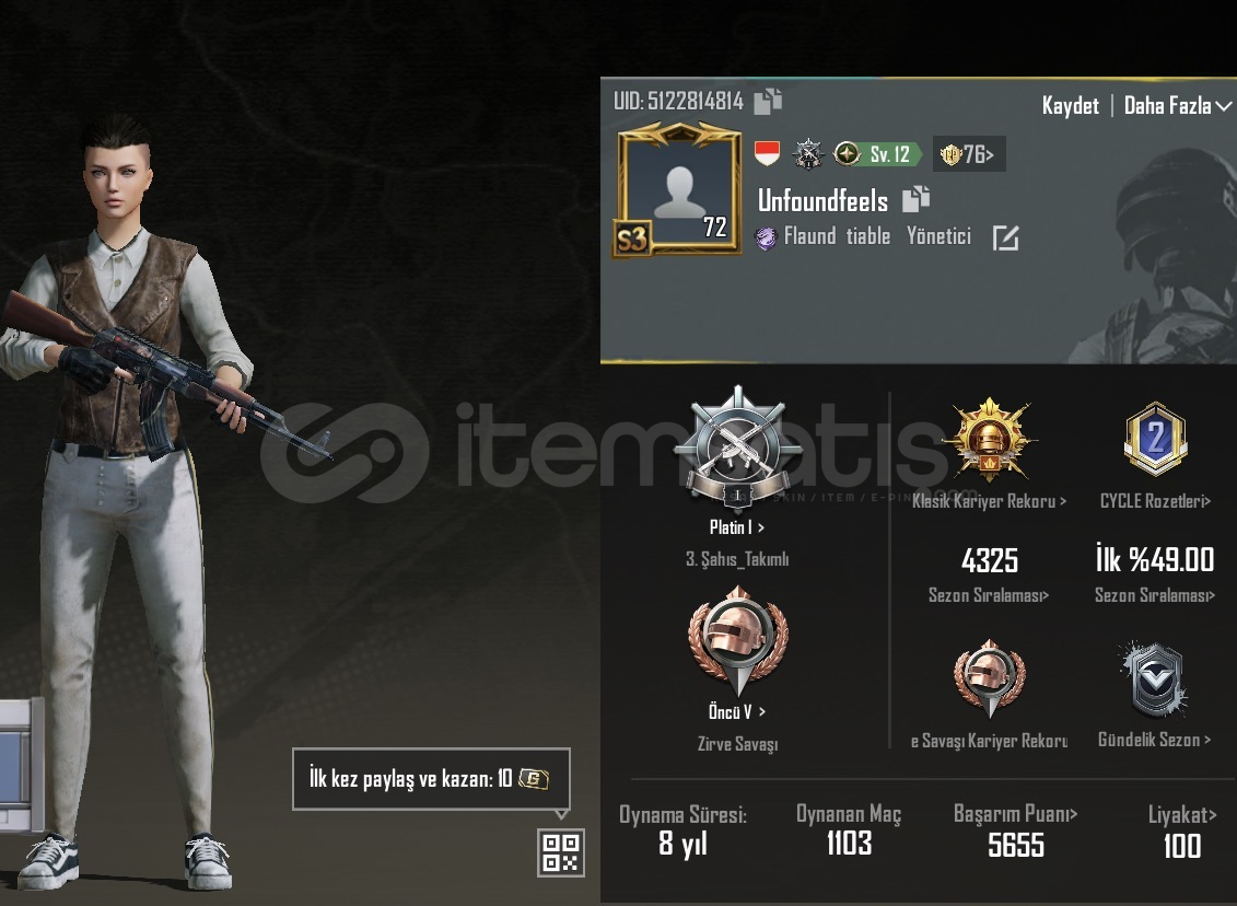 merhaba öncelik le yaptığım işlemler ve değerlendirmelerime bakarak gönül rahatlığıyla işlem yapabilirsiniz İYİ ALIŞVERİŞLER DİLERİMeski sezon royalpass ları açıktır Sezon s-3 FATİH ÇERÇEVE Nadir!!! KOVBOY ÜST KOMUTAN FULL MOT SPORCU ÜSTÜ MAVİ CREW ÜSTÜ KOMBİNLİK KOMBİN DELİSİ T...