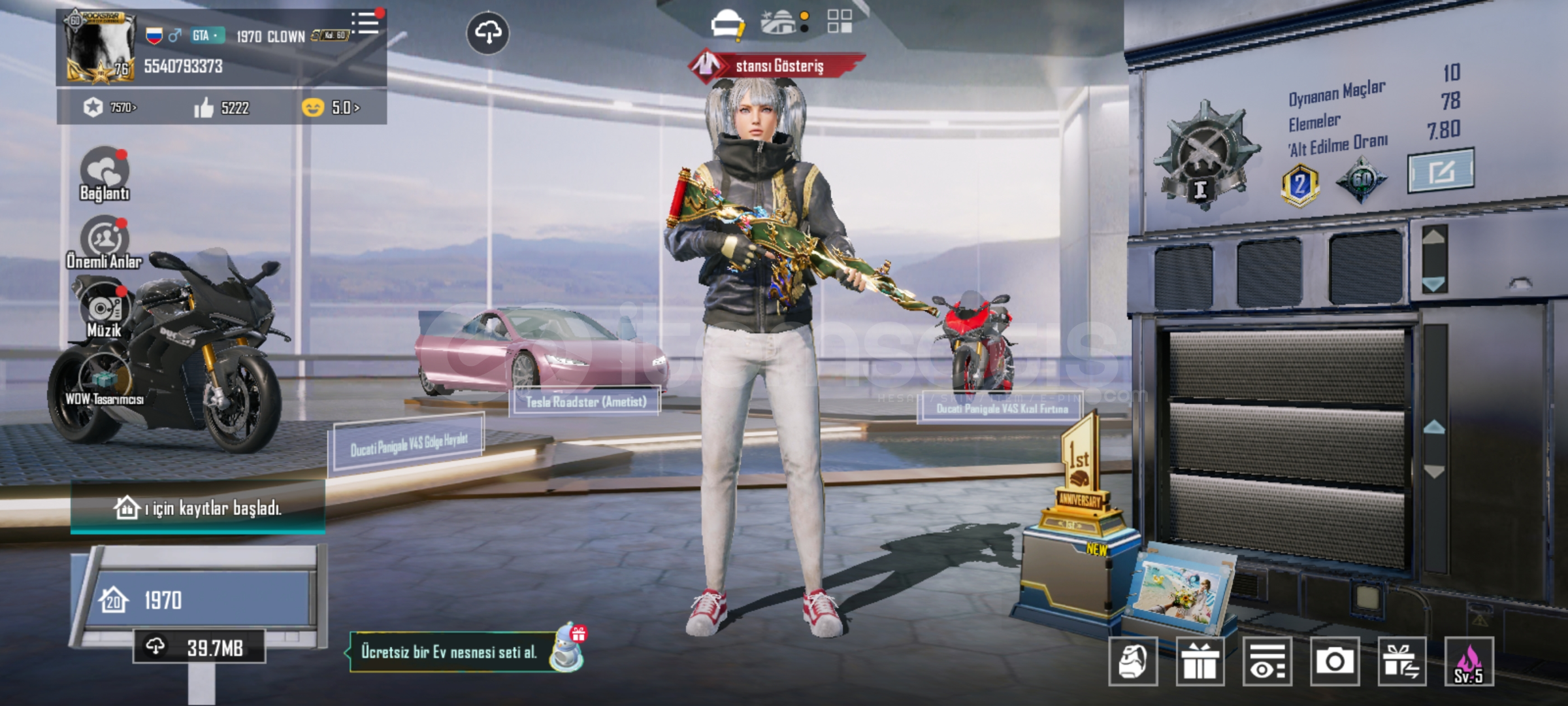 Hesabımız 60koleksiyon nadirlik abidesidir sitede tek olan yüce savaşçı seti var, asil maskeli seti var, beyaz mumya, mavi mumya, mytick forge setleri var. Çok nadir olan ametist moru teslamız var, iki tane biri destansı ducati motorlar var. Dikenli kaskta mevcut, binbir çeşit değerli kombinlik ögeler var, s5 saç yeni gelen saçlardan birtanesi ve s4yüz var hesap on numara ömürlük hesaptır hesabın bağ değişimleri daha açılmadı isteyene bilgileri şifreleri veririm kendisi oynar değişir isteyen biraz bekler değişim açılınca komple devir yaparım hesapta sorun olmaz kimlik onaylı satıcı güvencesi vardır, diğer hesap sattığım kişilerede sorabilirsiniz.ıd5540793373 ALANI ÜZMEYECEK FIRSAT HESABI