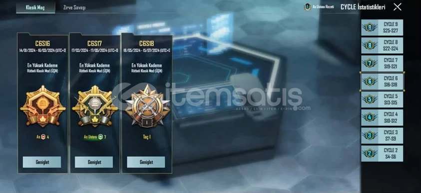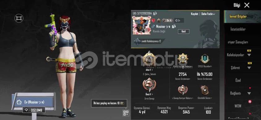65 Leveldir Daha Önce Birkaç Defa As Ustası As Gibi Ranklara ÇıkmıştırToplam 41 Tane ÖNEMLİ Silah Skini 4 Tane Kask Skini 7 Tane Çanta Skini 3 Tane Araba 24 Tane Paraşüt 10 tane bomba Skini Bulunmaktadır Çoğu Kutulardan Çıkmadır Ve Daha Fazlası Skinler Vardır Bunlar Önemli Olanlardır.Birsürü Battlepass Ve Kutudan Destansı Gizemli Skinler Vardır Ç...