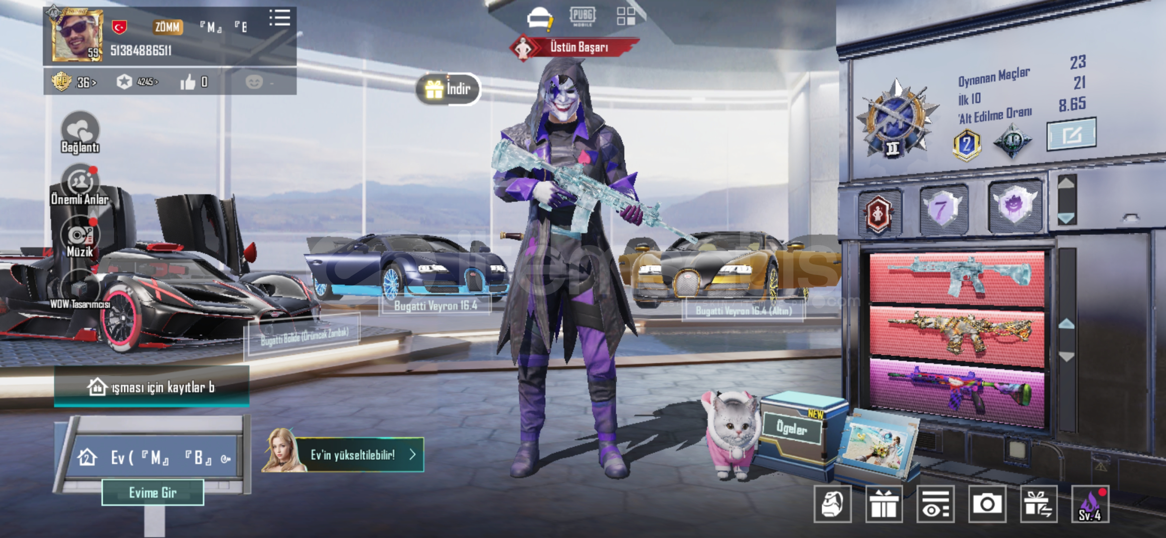 SİLAHLARBuz M4 (7/7)Yakan kükreme M4 (4/8) Gümüş guru M4 (7/8) Maskara M4 (4/7)Yüksek Ses SCAR (2/7)Kumlar Kralligi AK47 (2/8)İskelet Cevlat M762 (2/8)Ruh Biçen UMP (4/7)Yıldızlı Yesilcam anatcisi DP (1 seviye)Yesil Ejderha DP (1 Seviye)Yamalı Tavsan MK47 (2/.3) Dikenli Safak M16 (2/.3)Gizemli Parıtım M16 (1 seviye)Katil Balkabagi Groza (1 seviye)Gecenin Sarkisi Groza (1 seviye)Yer Alti Hadaleti QBZ (1 seviye)...