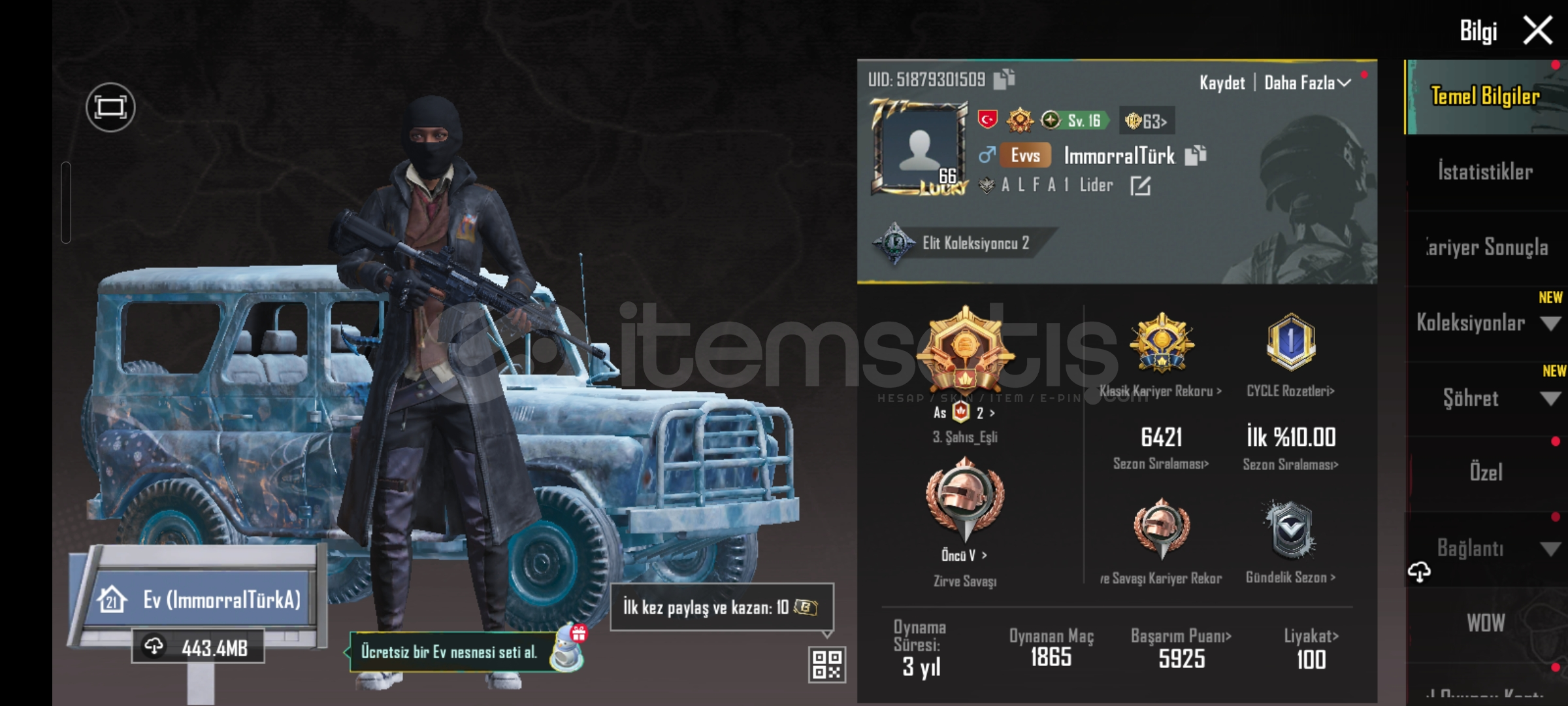Hesab 66 Seviye,Royalpassi açık ve 63 seviyede,Güncel Olarak As 2 Max As Otoritesi Olmuştur,Toplam 35 Destansı,17 Adet Destansı Köstüm,1 Adet Destansi Kask,Kafalıklarda 15 Adet Destansı,Maske 1 adet destansi,1 adet canta destansi,Buz Diyarı Uaz Vardır Hesapta,10 Det gelistirilebilir Silah Vardır,Öğrenmek İstediğiniz Birşey Varsa Yazabilirsiniz Asla Geri Çekme Vb. Durumlar Olmaz.