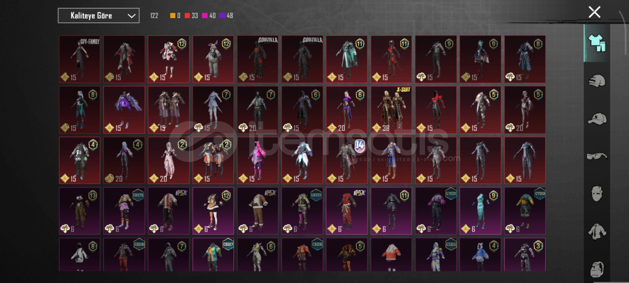 X-suit:2 seviye21 adet yükseltilebilir silahRoyal pass 4 kere üst üste açılıp fullenmiştirŞanslı hesapSezon 4 saçıDirekt ölüm duyurulu ve leş sandığı olan ump mevcuttur ilgilenen alırBağlar ; Facebook Telefon E-Posta