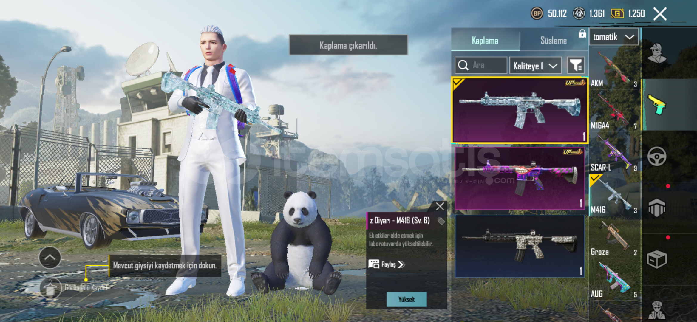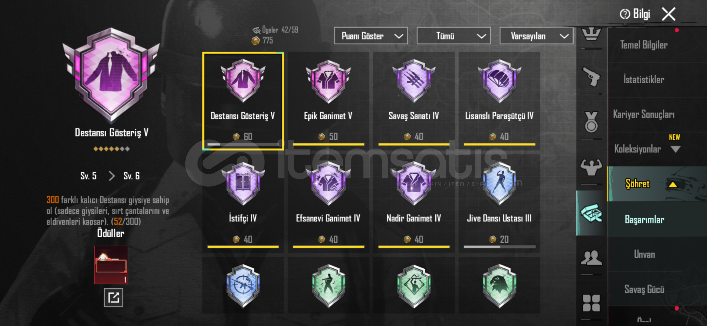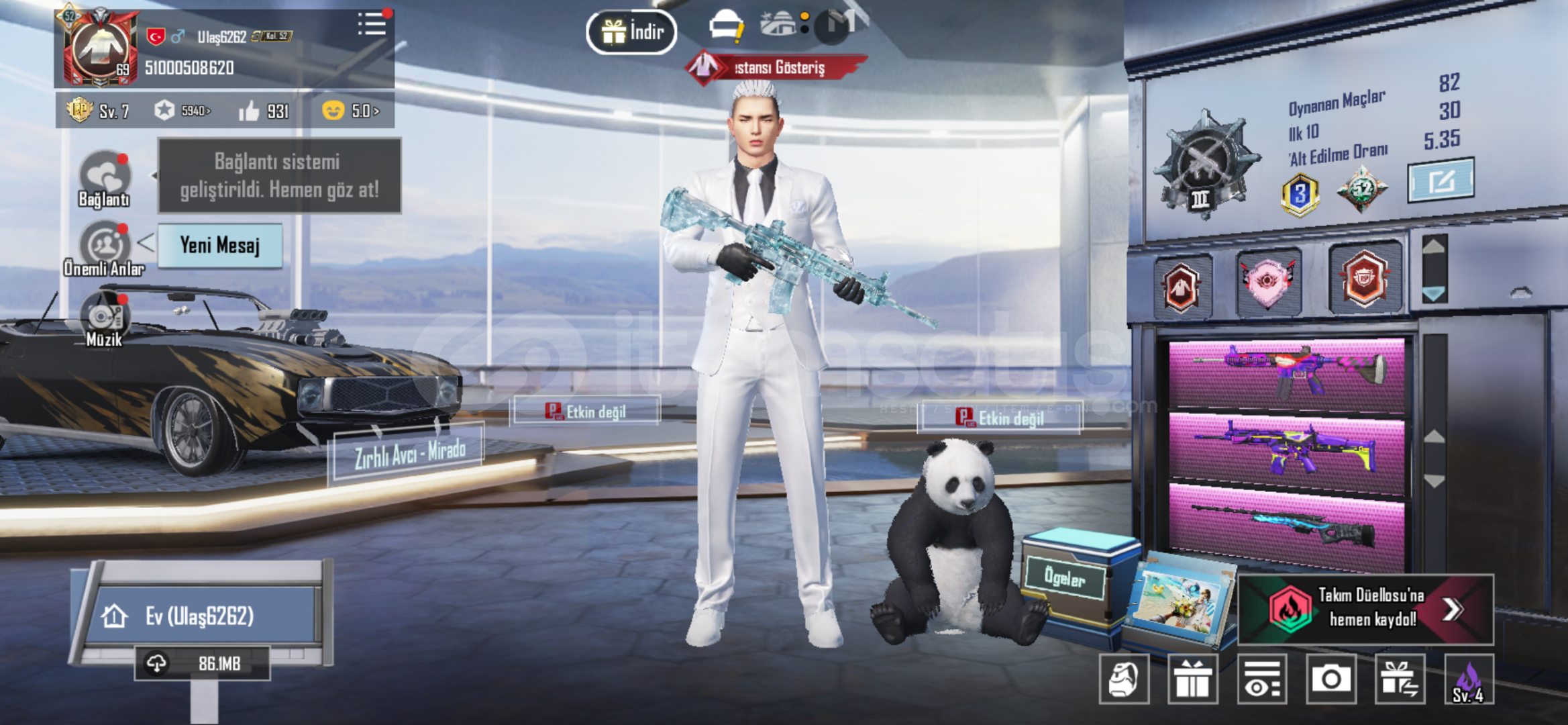 Hesapta 52 destansı bulunuyor x suit 2 level ve yoldaş olarak panda var 17 yükseltilebilir silah var buz m4 6 level maskara scar 2 level hesapta yükseltilebilir toros ve üçlü motor bulunuyor hesanın detaylı videosunu özelden yazarak alabilirsiniz hesbın max rankı as otoritesi hesap 5 yıllık ve 69 level hesabı oyunu bıraktığım için satıyorum ve pazarlık yapılır.