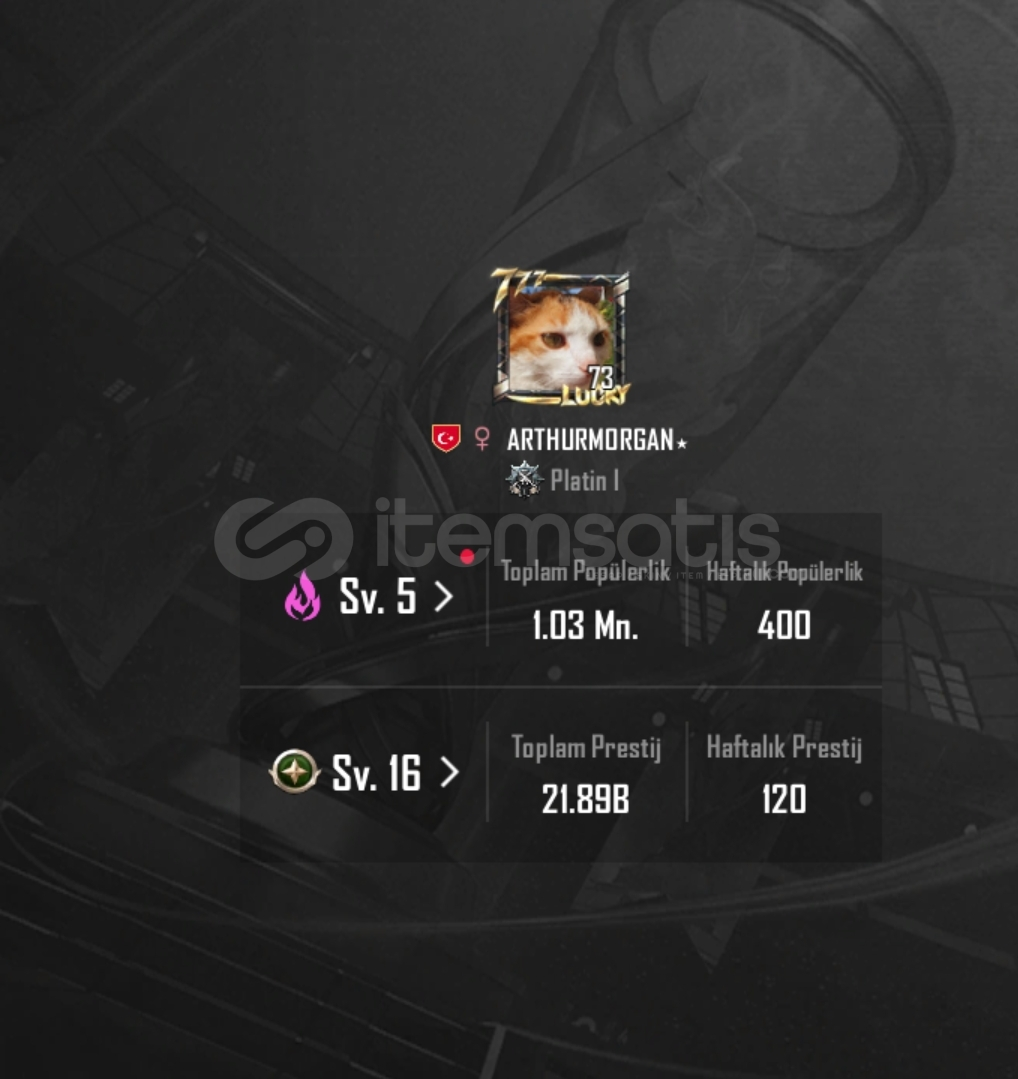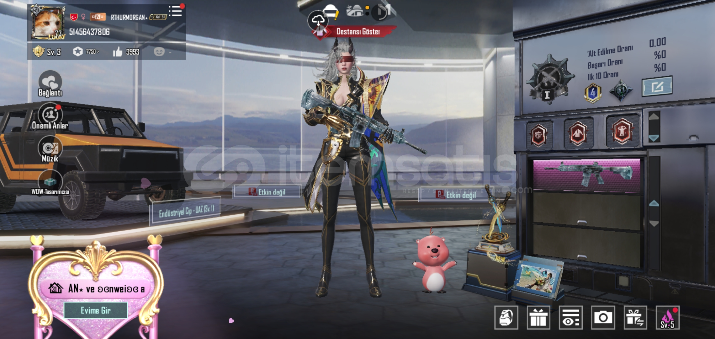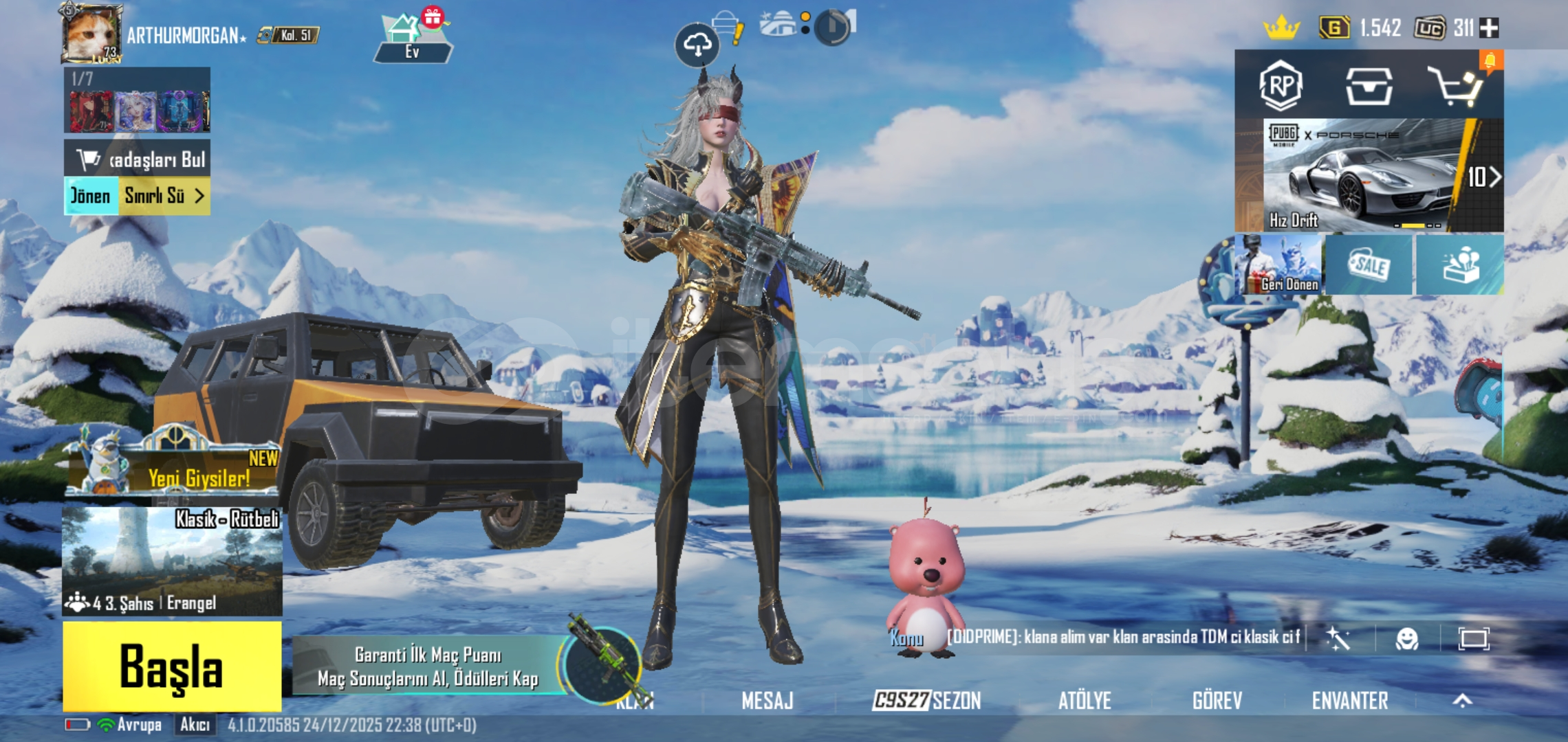 BUZ DİYARI 4 SEVİYEDRAVİON X SUİT 51 KOLEKSİYON SEVİYESİ73 OYUNCU SEVİYESİ14 GELİŞTİRİLEBİLİR SİLAHDESTANSI GÖSTERİŞ ÜNVANI30 DAN FAZLA DESTANSI EMOJİ3-4 İMTİHAN ÜNVANI11 SEZON RP'Sİ 192 BOYA331 UC4 UAZ,2 SEDAN,4 BUGGY,1 MOTOR, VE BİRKAÇ ARABA DESENİ DAHA