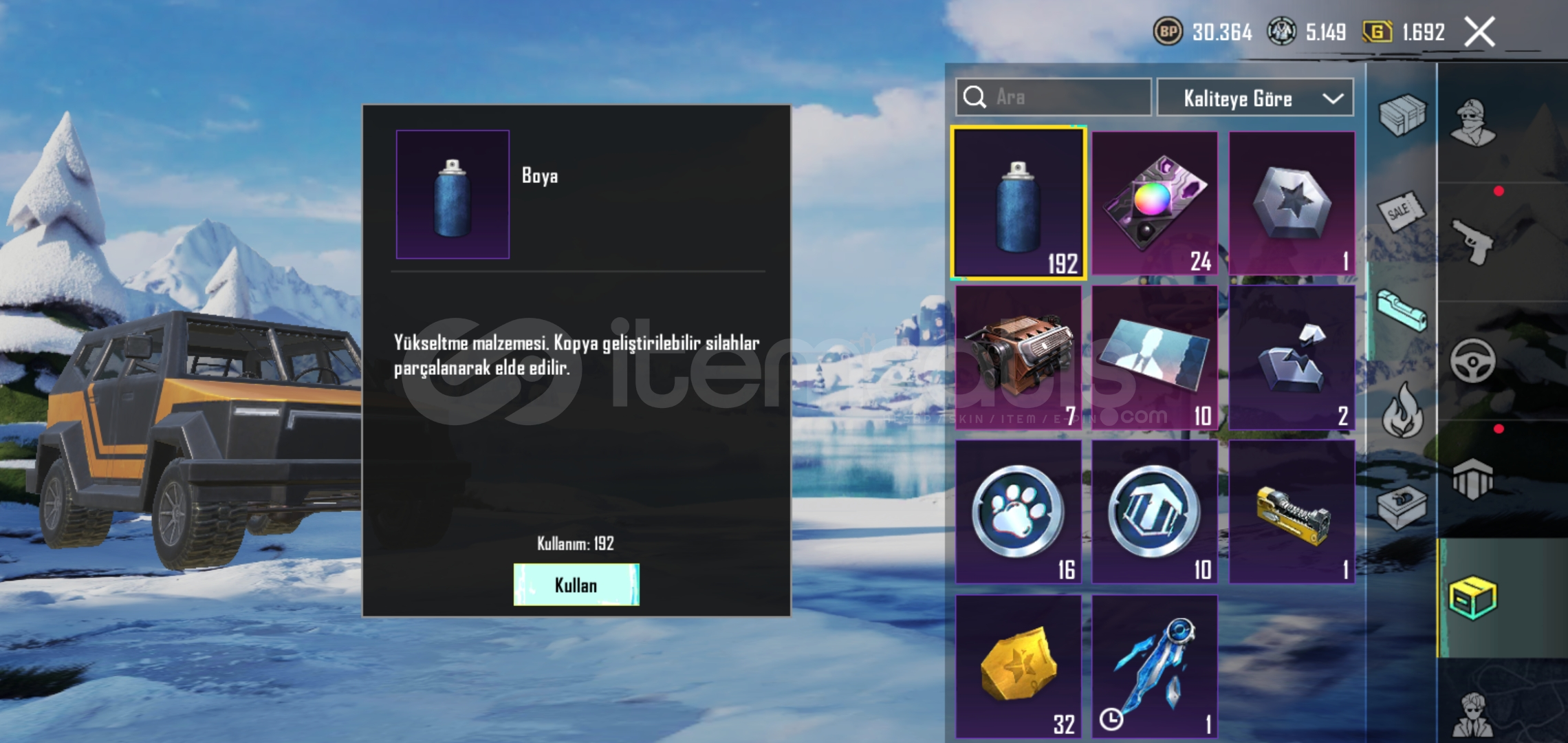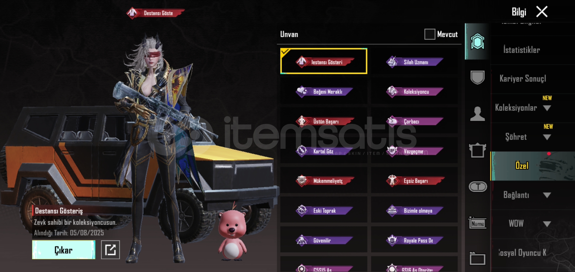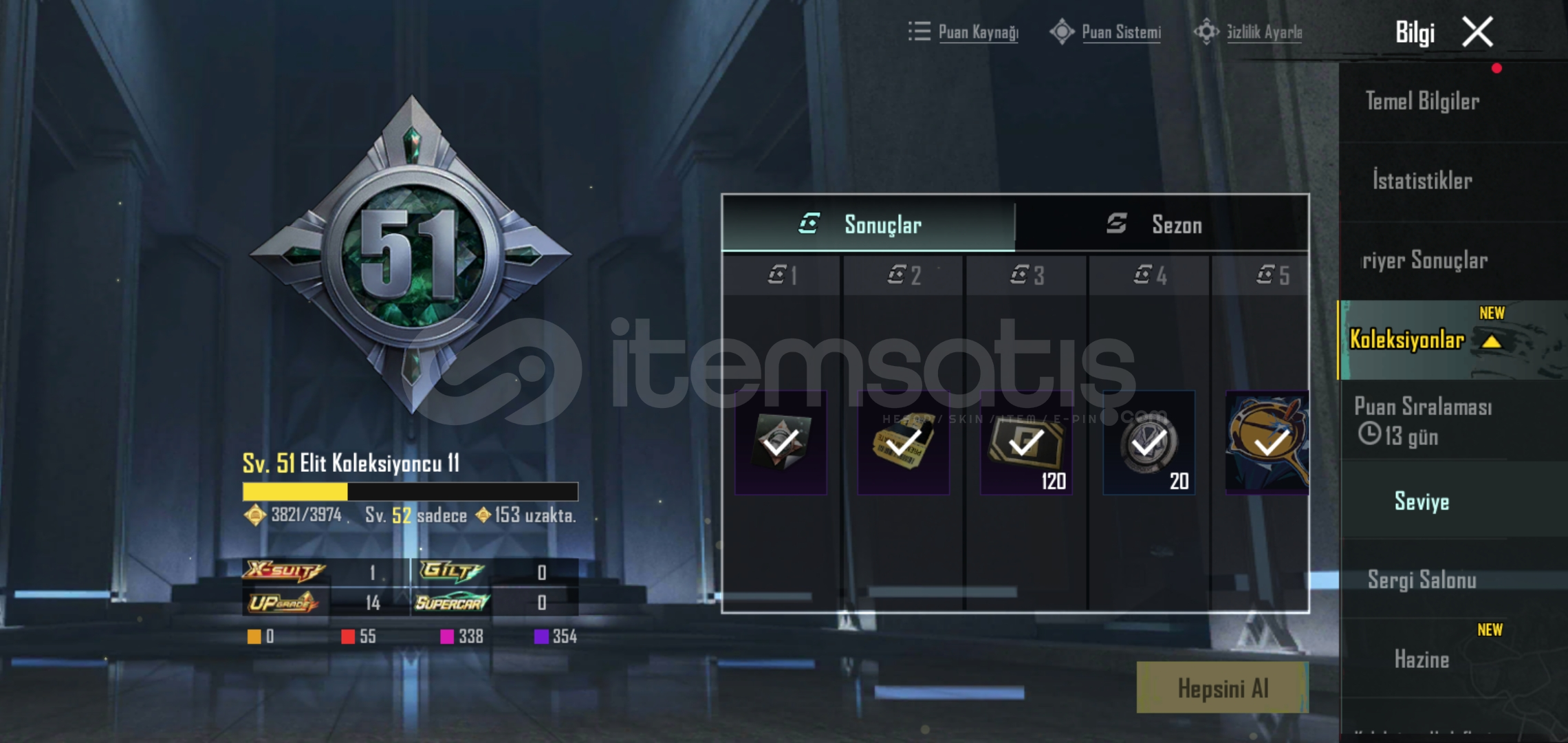 BUZ DİYARI 4 SEVİYEDRAVİON X SUİT 51 KOLEKSİYON SEVİYESİ73 OYUNCU SEVİYESİ14 GELİŞTİRİLEBİLİR SİLAHDESTANSI GÖSTERİŞ ÜNVANI30 DAN FAZLA DESTANSI EMOJİ3-4 İMTİHAN ÜNVANI11 SEZON RP'Sİ 192 BOYA331 UC4 UAZ,2 SEDAN,4 BUGGY,1 MOTOR, VE BİRKAÇ ARABA DESENİ DAHA