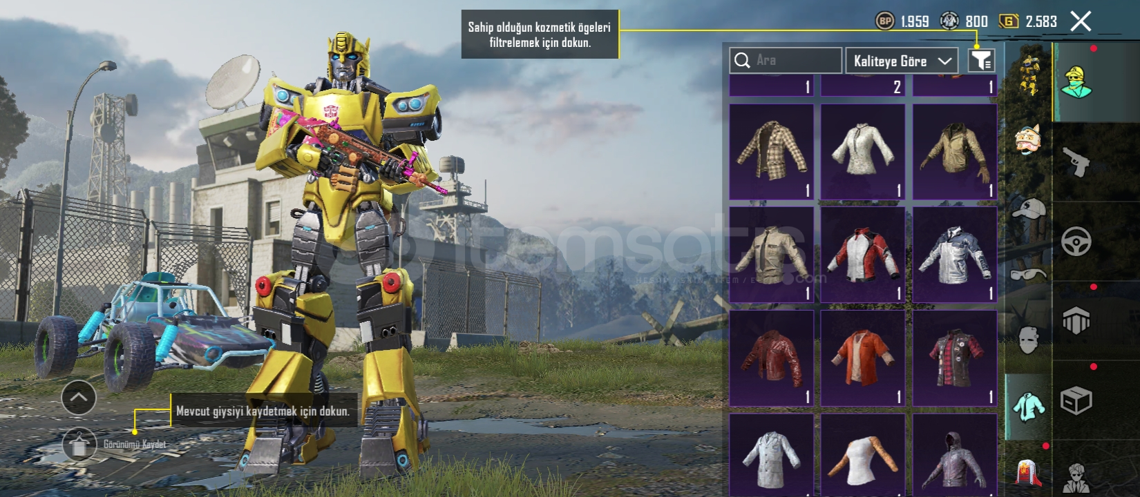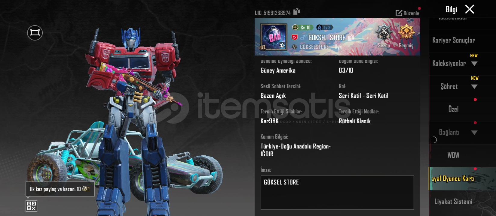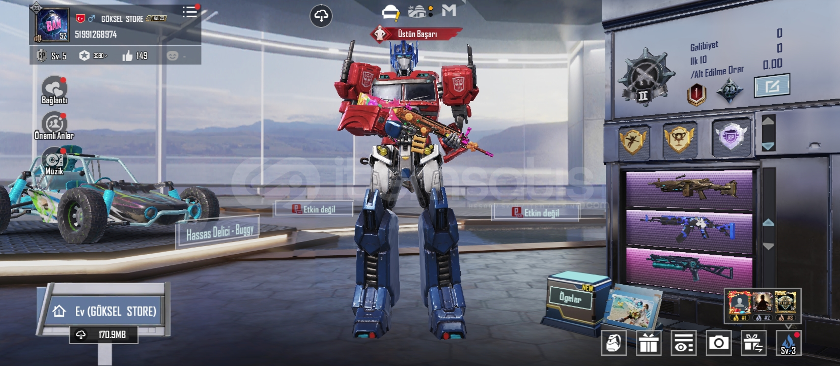 52 seviye 10 destansı 5 geliştirilebilir silah 29 koleksiyon Midilli (1 seviye)Bizon (3 seviye)M249 (1 seviye) SCAR (2 seviye)Bağları değişime açıktır 1 ödül yolu açılmıştır Videohttps://youtu.be/NC0oJAk8T1g?si=m2cjGvaFppjJ2q9QDaha fazla bilgi için yazabilirsiniz.