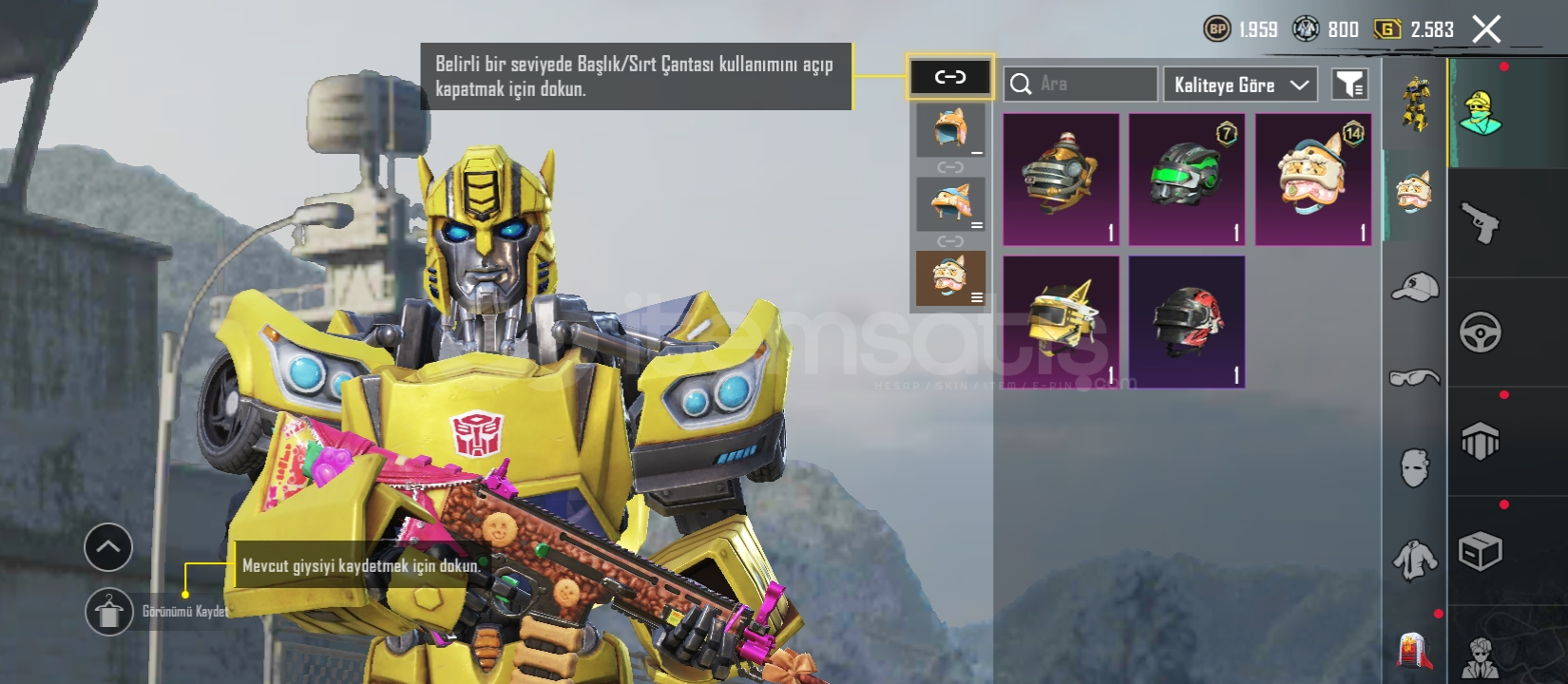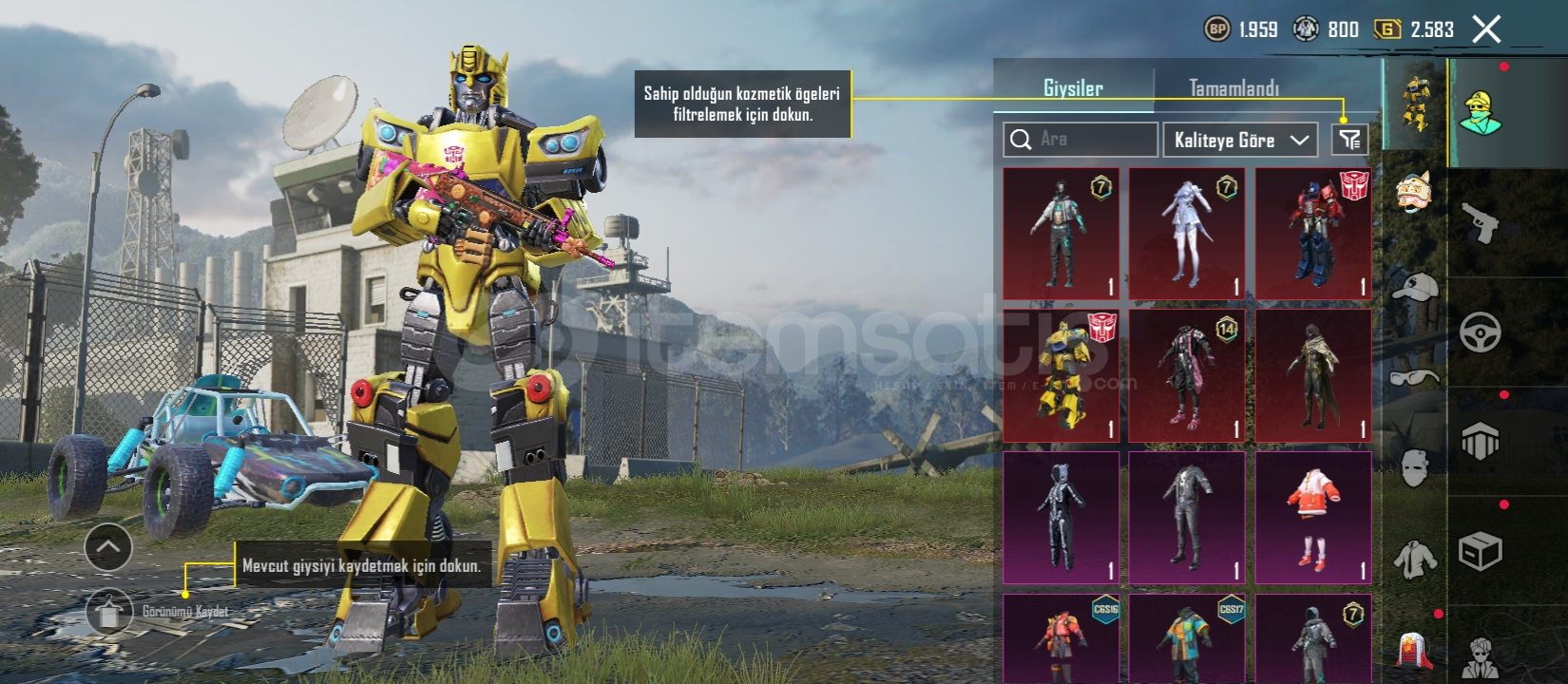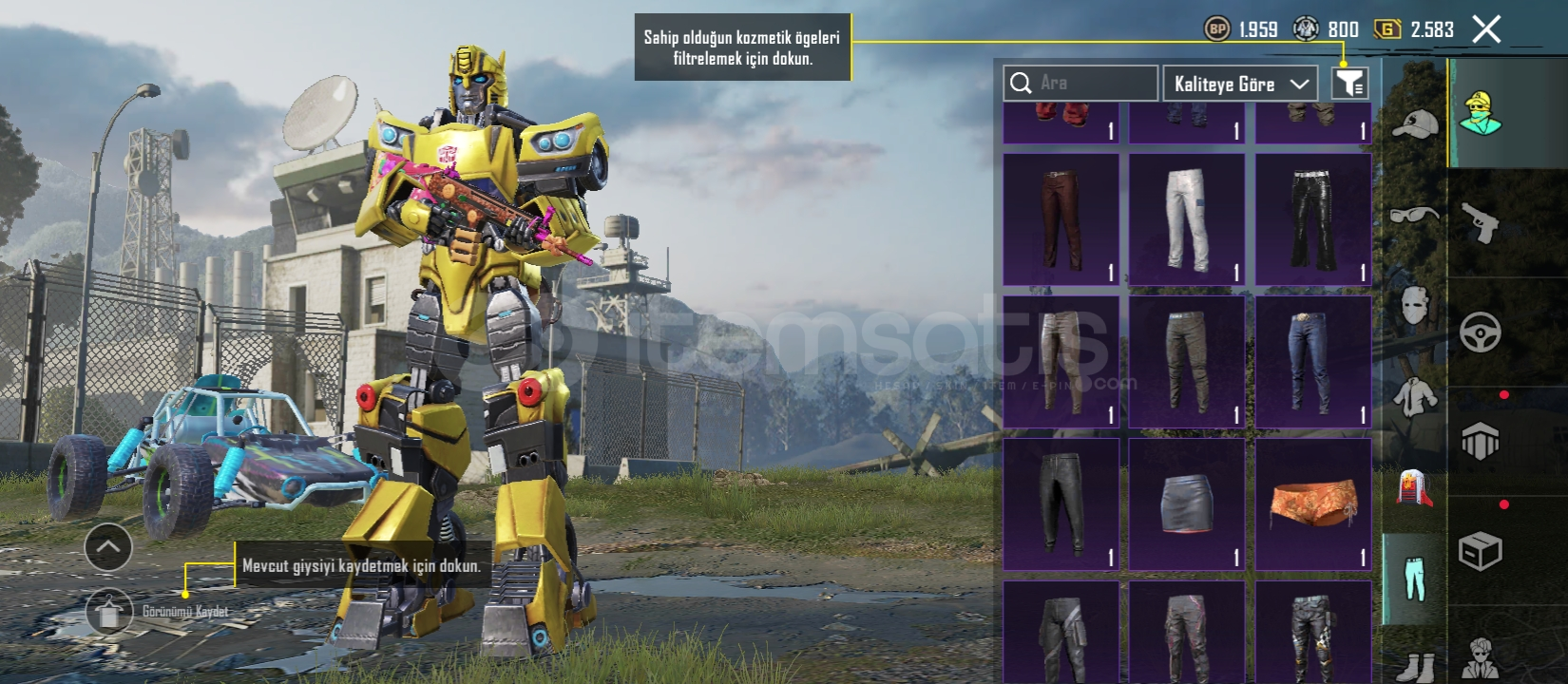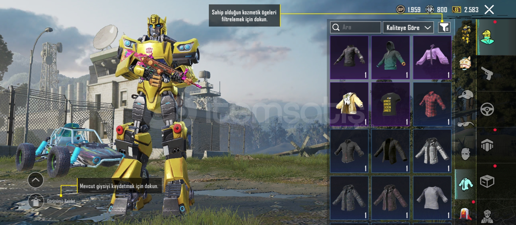 52 seviye 10 destansı 5 geliştirilebilir silah 29 koleksiyon Midilli (1 seviye)Bizon (3 seviye)M249 (1 seviye) SCAR (2 seviye)Bağları değişime açıktır 1 ödül yolu açılmıştır Videohttps://youtu.be/NC0oJAk8T1g?si=m2cjGvaFppjJ2q9QDaha fazla bilgi için yazabilirsiniz.