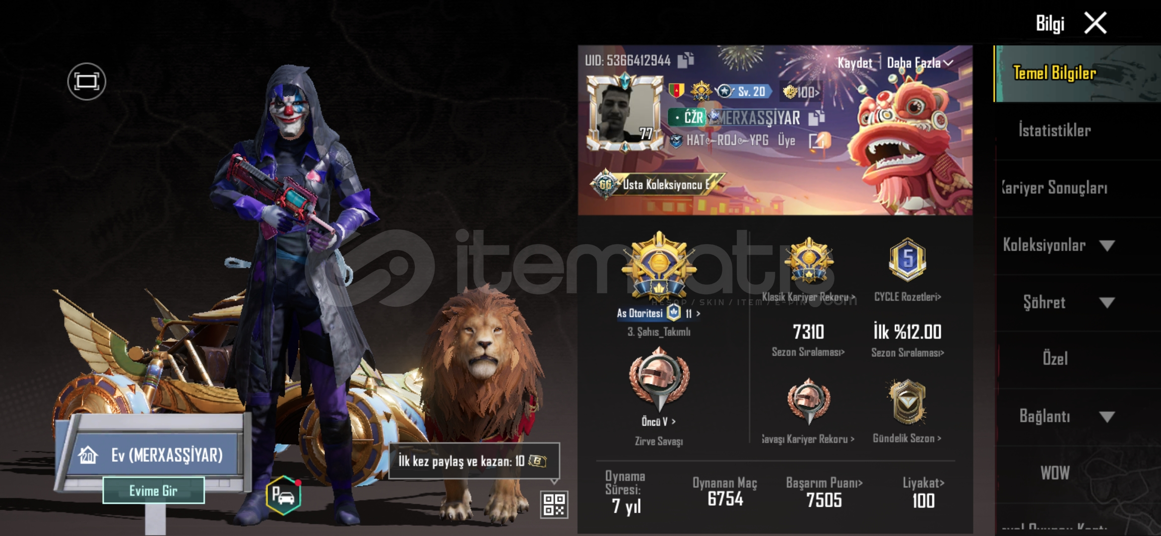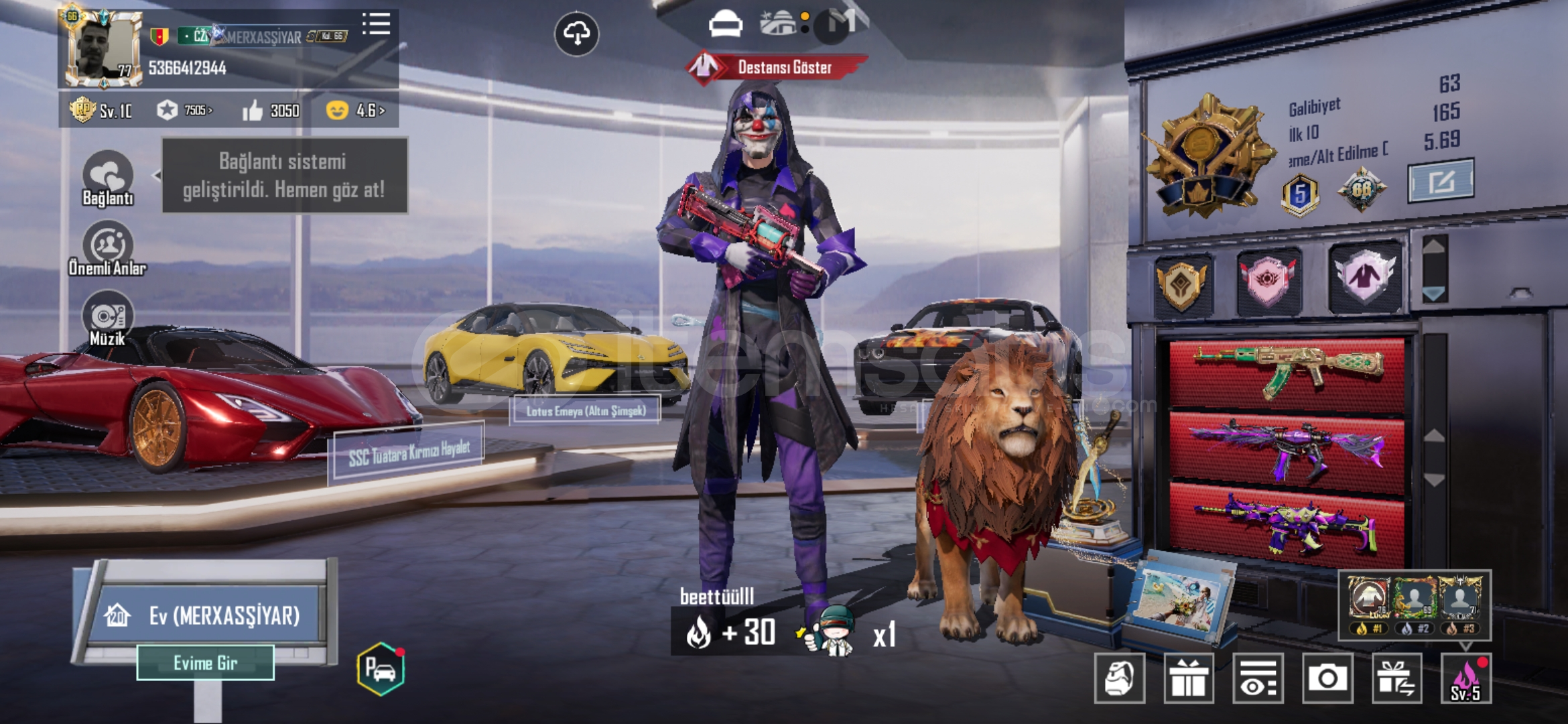 Hesap 9 yıllık emek hesabı olup 77 seviye 67 seviye koleksiyondur m416,akm,scar-l 7 seviye ve dier birçok silah 5 seviye yükseltilmiştir 4 adet spor araba vardır geri kalan bilgileri 5366412944 ıd üzerinden bakabilirsiniz alıcısına hayırlı olsun.
