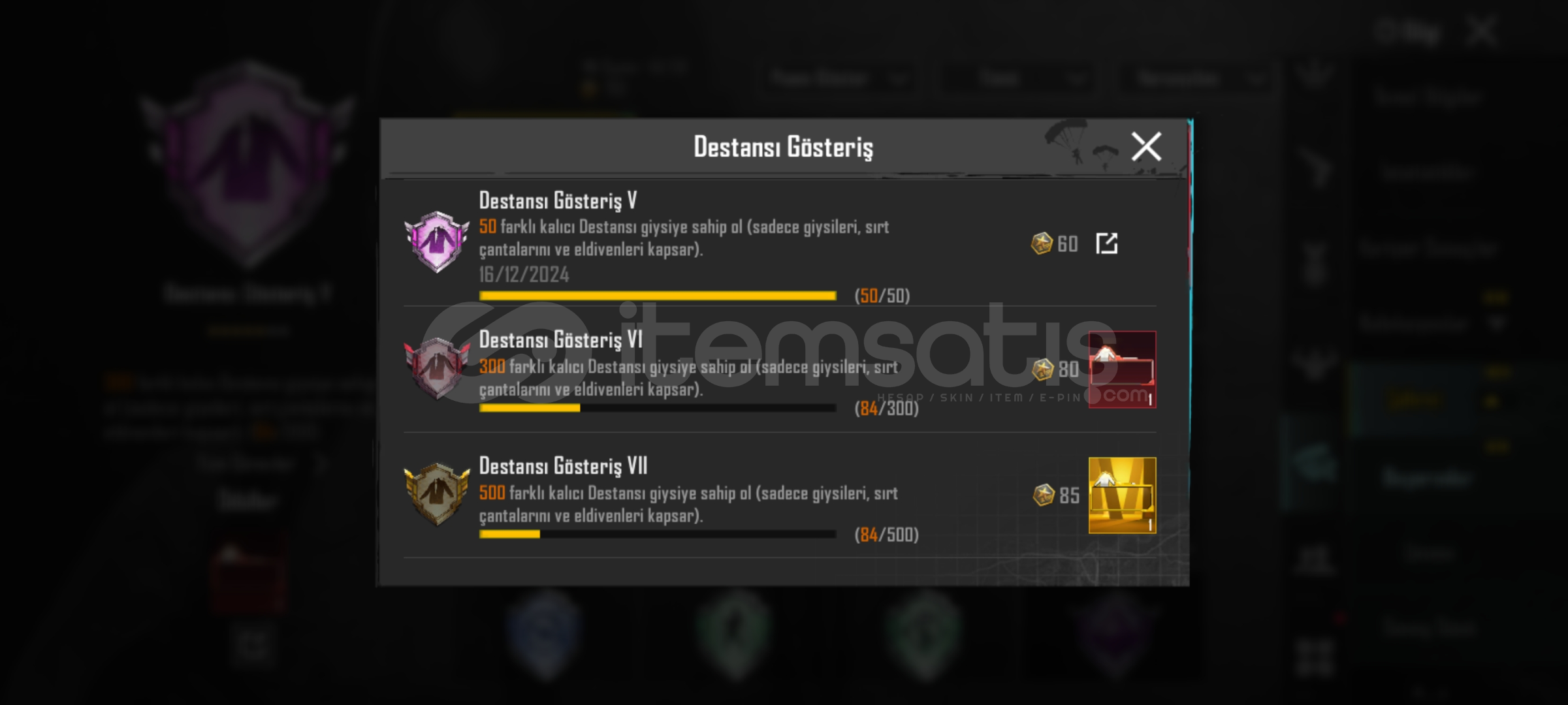 Hesapta 84 destansi vardır.Hesap üstünüze devredilecektir.Pazarlik payı vardır,4 adet destansı amblemi vardır