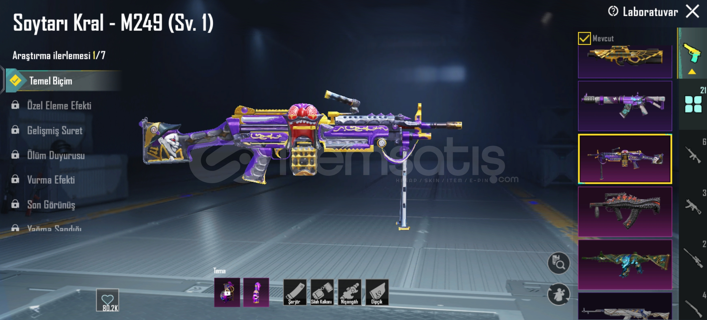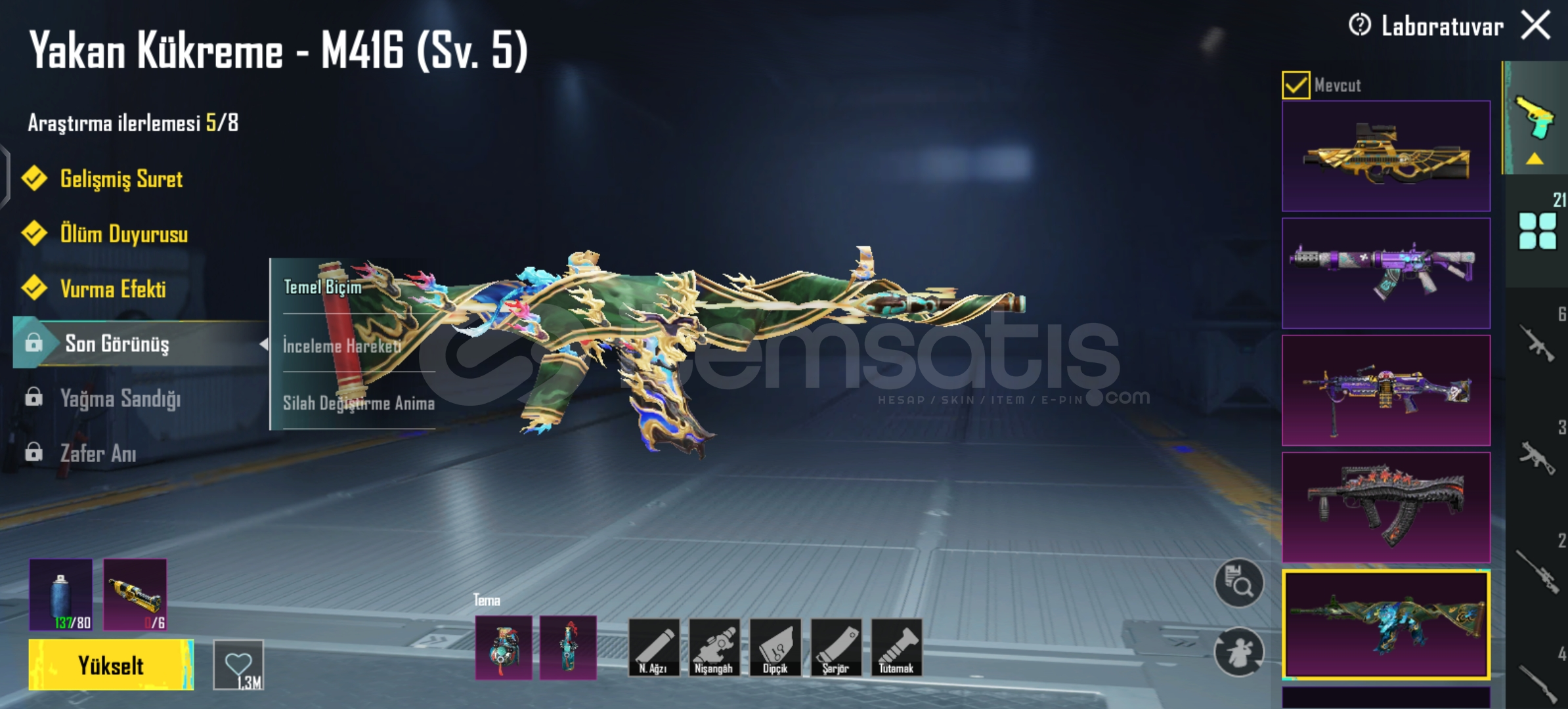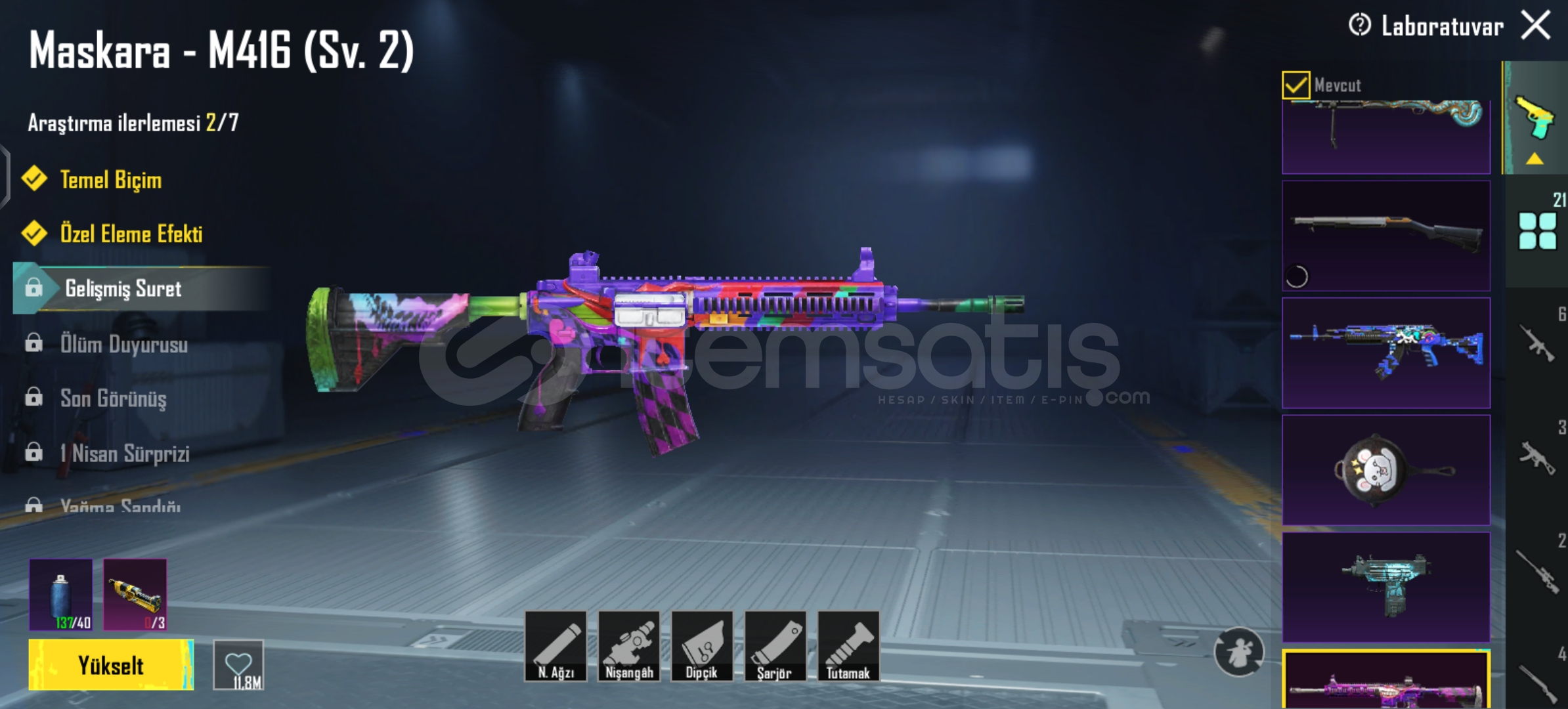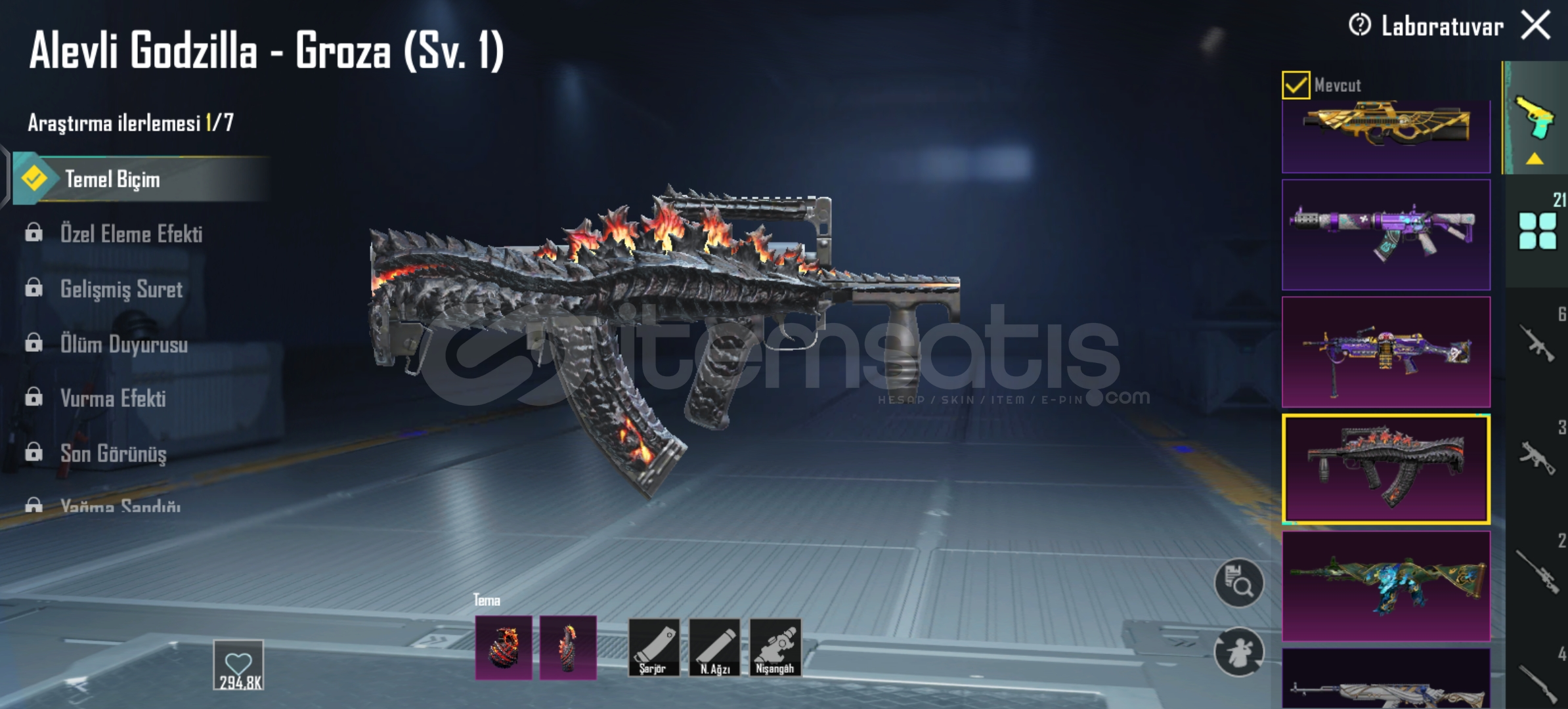 Yakan Kükreme 5 Sv / Bombasi Ve Molotofu VarMaskara M416 2 SvAltın Pençe P90 1 SvSoytarı Kral M249 1 Sv / Molotofu VarAlevli Godzilla Groza 1 Sv / Bombasi Ve Molotofu VarAtomik Tetik S12K 1 SvYaldızli Yeşim Ejderha DP28 1 SvMidili M762 4 SvYakut Fırtına AMR 2 SvVahşet Uzi 1 SvToplamda 21 Yukseltilebilir Vardir Onemli Olanlari YaziyorFiravun Ve Anuhkra X SuitÇoğu Destansi Rpsizdir Hepsi Güzel