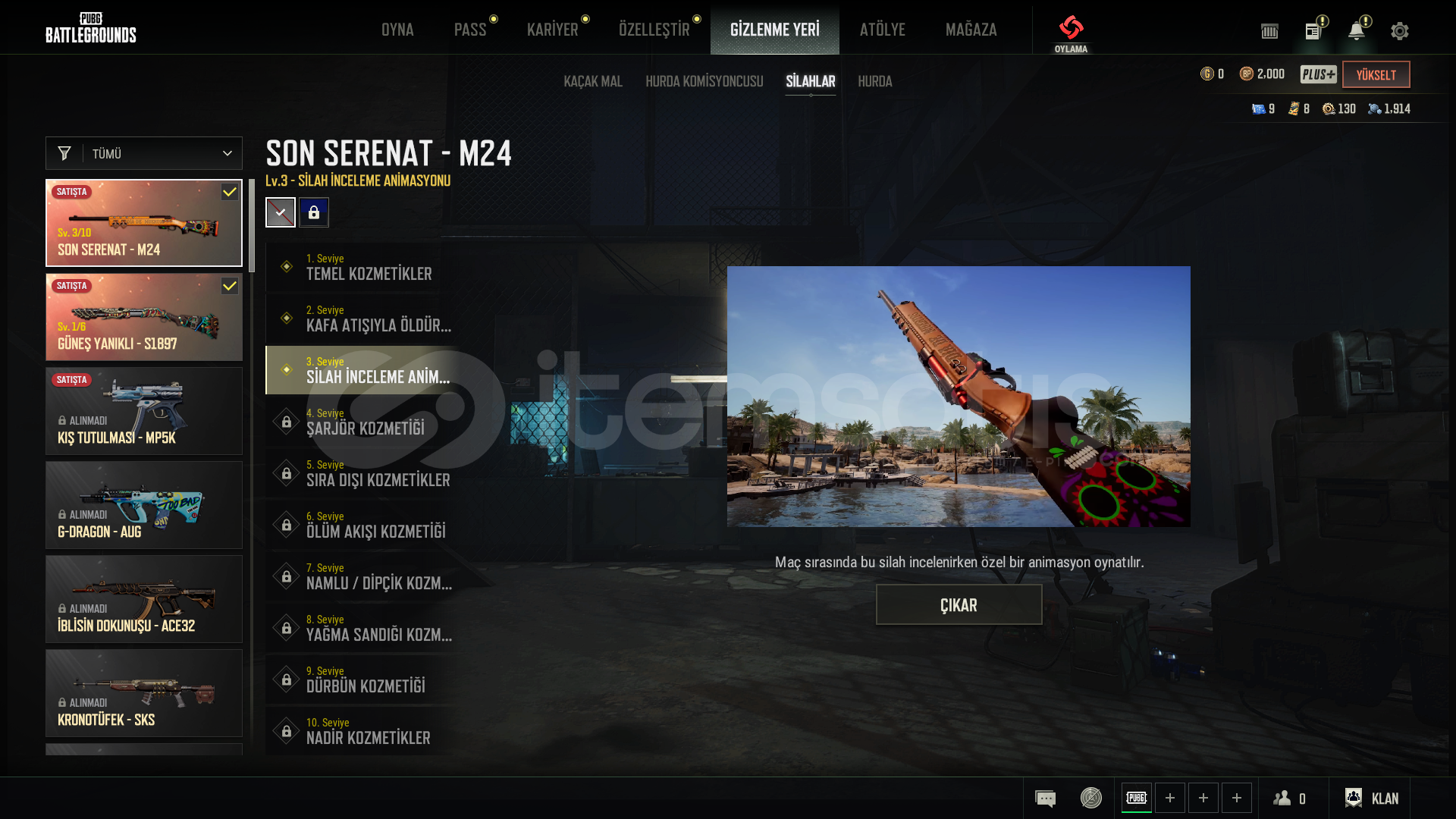 OYUNDAKİ TÜM SİLAHLARDA SKİN VARDESTANSI KARAKTER2 ADET GELİŞTİREBİLİR SİLAH1: SON SERENAT M24 3 SEVİYE2: GÜNEŞ YANIKLI S1897 1 SEVİYEHESABIN İÇİNDE 9 ADET ŞEMA VARDIR