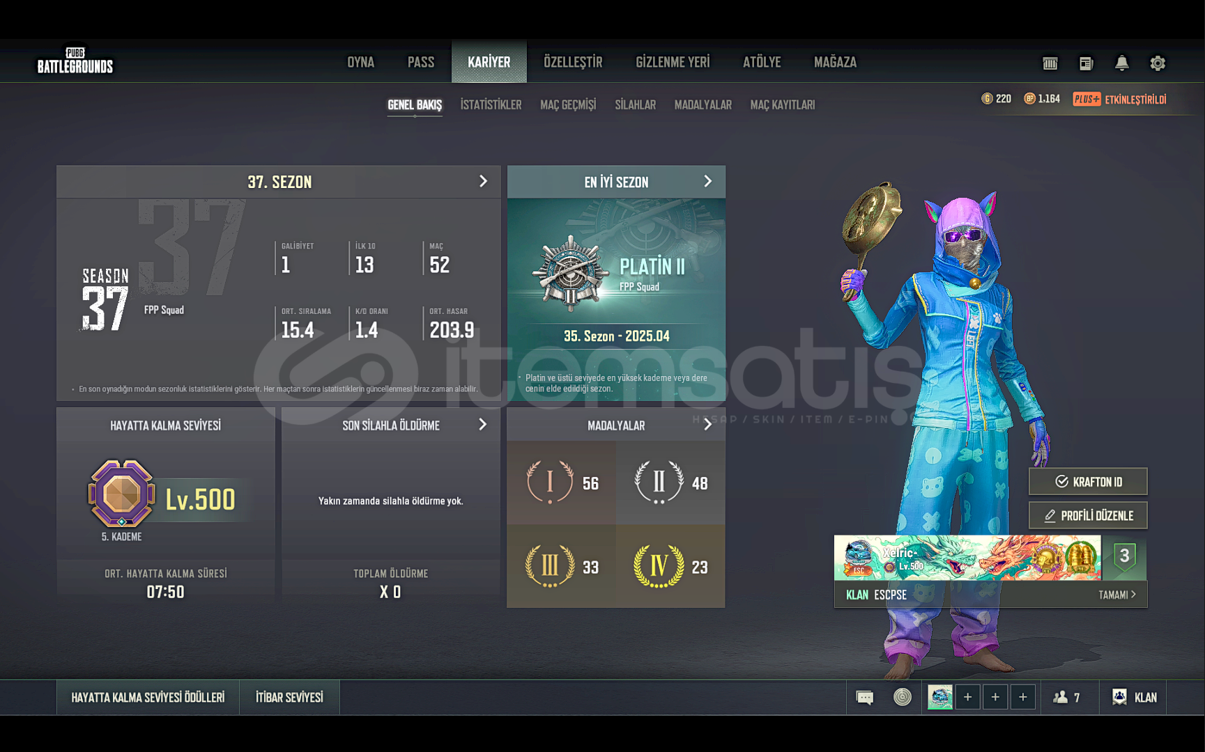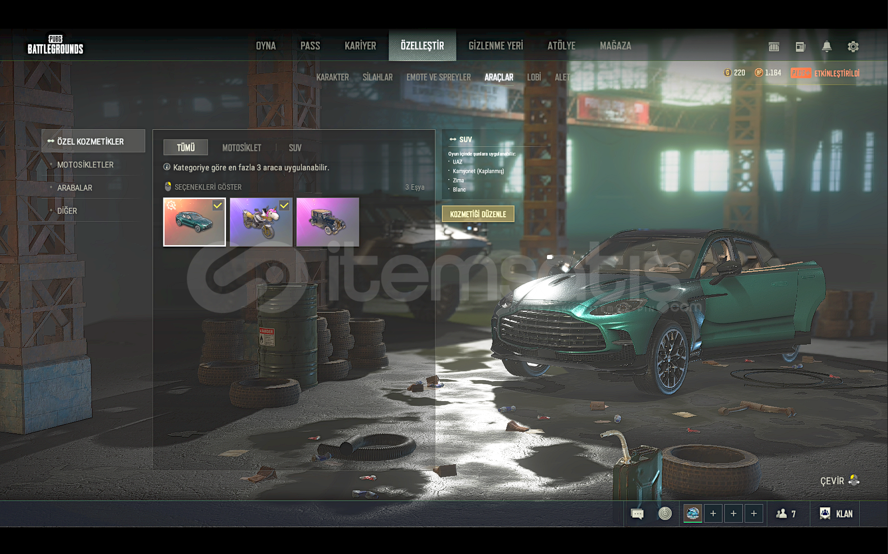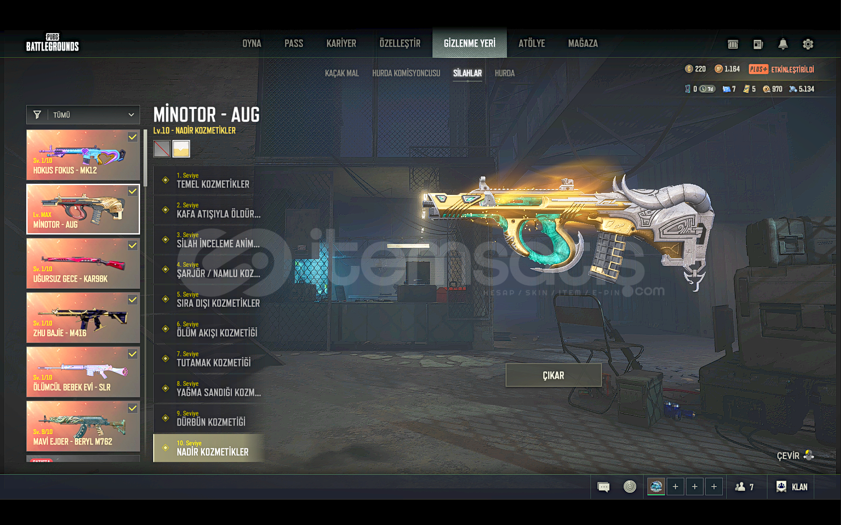İlan fiyatı dışı cevap vermiyorum tek fiyattır ; [ https://www.youtube.com/watch?v=LNYWE7w_1uA ] Tanıtım videosuHesabın içerikleri :{ 10 LVL ] MİNOTOR AUG DÜZ + CHROMA{ 9 LVL ] MAVİ EJDER BERYL DÜZ + CHROMA{ 1 LVL ] MK 12 DÜZ{ 1 LVL ] UĞURSUZ GECE KAR98 DÜZ RENK{ 1 LVL ] ZHU BAJİE M416 DÜZ RENK{ 1 LVL ] ÖLÜMCÜL BEBEK EVİ SLR DÜZ RENK { ARAÇ ] UAZ ASTON MARTİN JEEP...