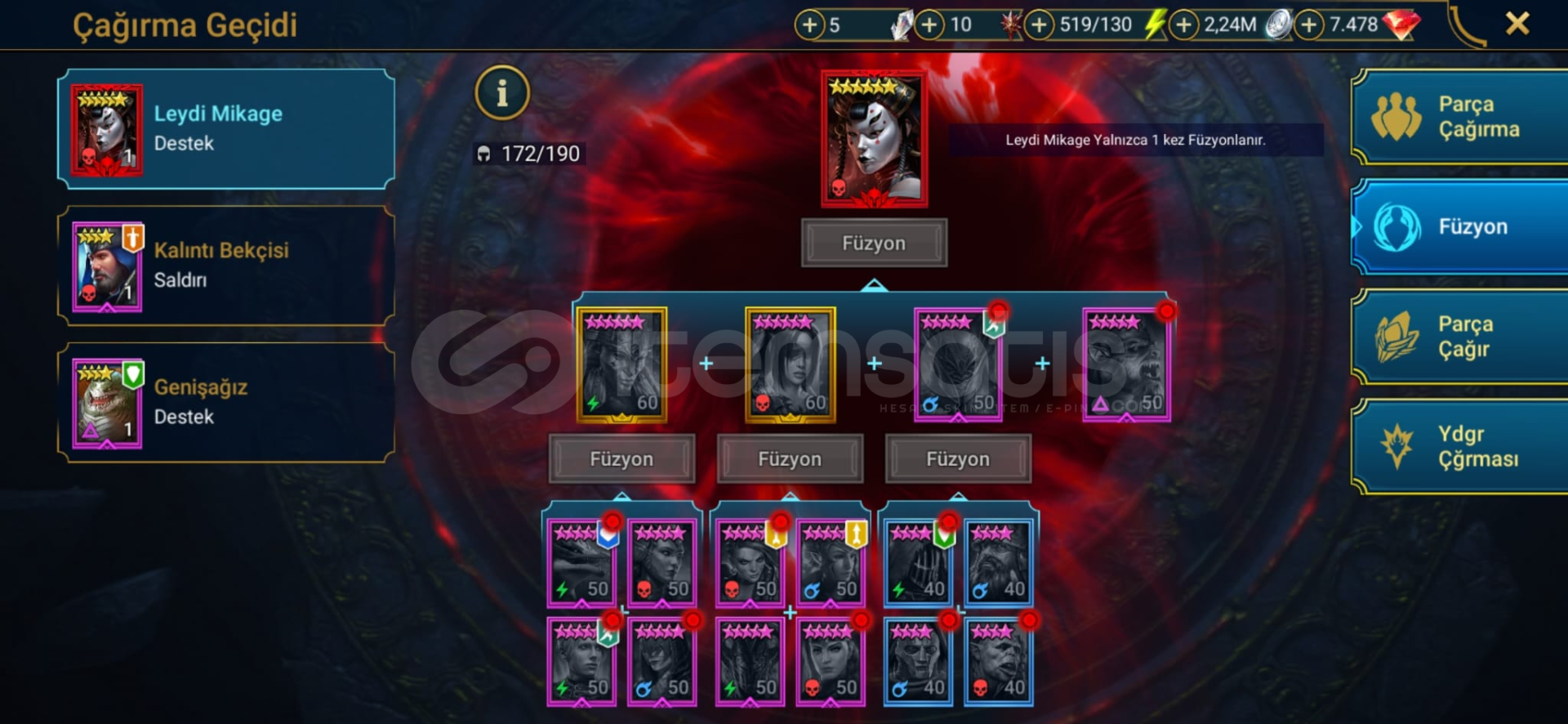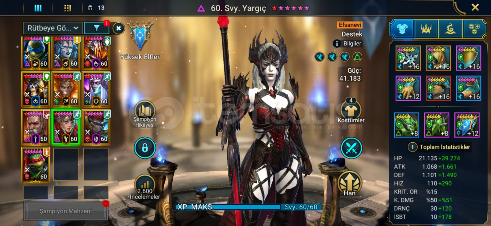 4 TMNT kasılmış halde mevcut.2 mitik + Vulkanos + Taras ...Yeni eklenen Venalicia + Maria mevcutMarius yapılıyor 135/180, bir iki haftaya alınır.Yargıç 400 hızPvp kalıntıları güzel.Depoda 1580 tane yükseltilmeyi bekleyen efsanevi mitik kalıntı var.Bütün zindanlar Zor 10Hydra bütün zorluklar tek key. Clash 0.8-1B civarı. Marius alınınca 2-3 kat arttırılabilir.Clan bo...