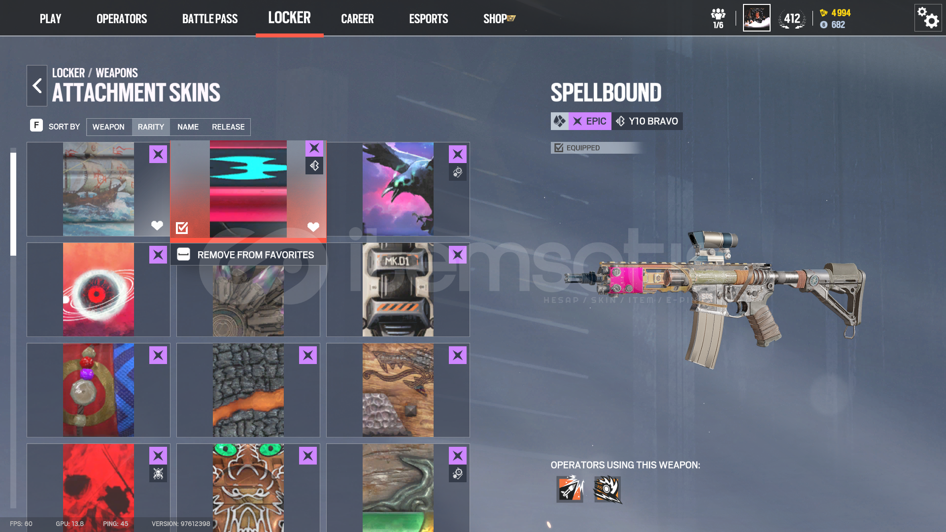 Attachment skinleri silah görünümünden daha nadirdir.Silah görünümüne göre 2–10 kat pahalı oluyorlar. Spellbound silah görünümü güncel olarak 136,000  kredi yaklaşık 944-1000 dolar arası fiyatı mevcut.Attachmentler daha pahalı olduğu için sadece hesaptaki bu kostüm pazarda binlerce dolardan işlem görebilir.Piyasayı bilmeyen olabilir r6 pazarında kontrol edebilirsiniz. Örnek chroma streaks 300 kredi attachmenti 2100 kredi , plasma pink silahı 300 kredi attachmenti 1100 kredi - watercolor splash ve benzeri pazarda kontrol edebilir diğerlerine bakabilirsiniz.