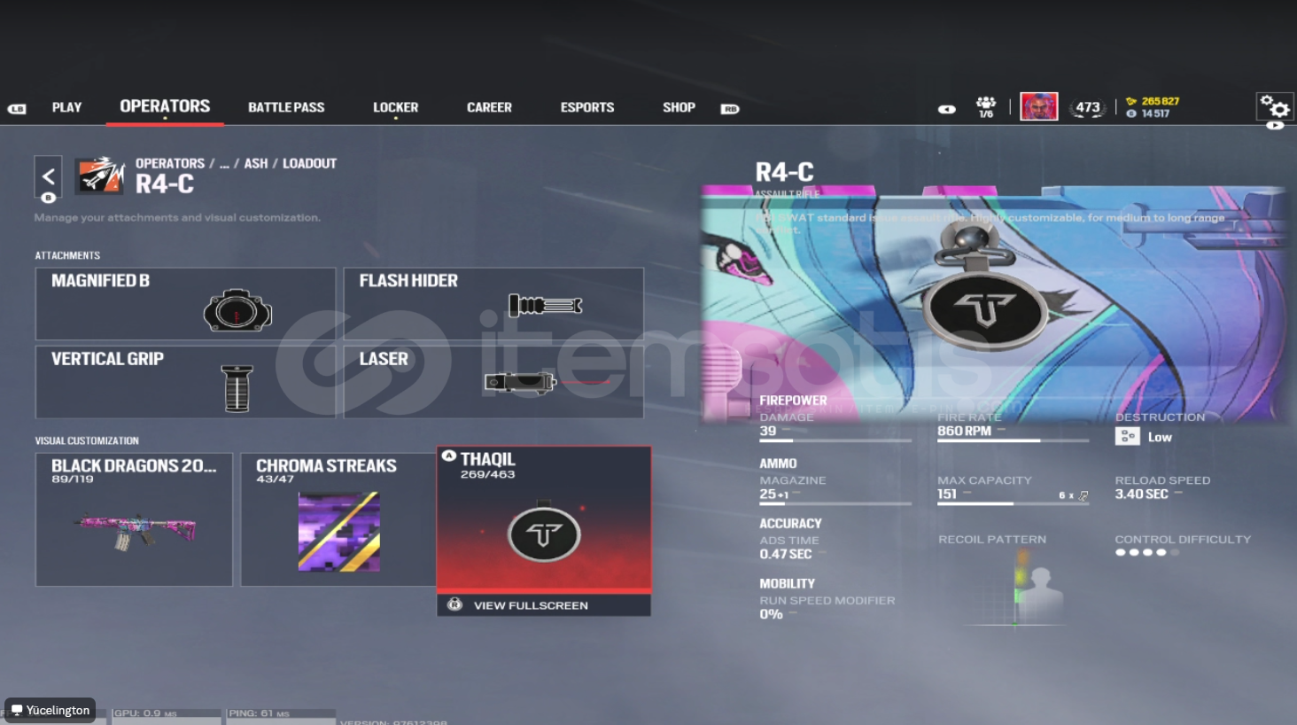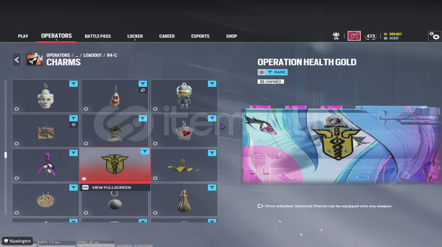 473 Level Operation Health hesabı. 2x Champ, 2x Diamond. Sayısız universal, seasonal, event, battle pass ve espor skinleri mevcut. 38x celebration premium pack(62k kredi değerinde), 2x celebration pack, 14k kredi, 265k renown vardır. Chroma Streaks, Onami, Nosferatu, Aki no tsuru, Azulejos, Loyalty, Leon Furiosso gibi değerli kozmetikler mevcut.https://r6skins.locker/profile/a442f392-180a-4700-b7de-5ccc7288f497