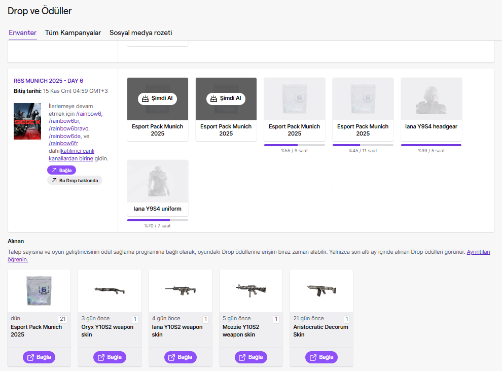 Twitch Envanter Drop sayfası: https://www.twitch.tv/drops/inventory