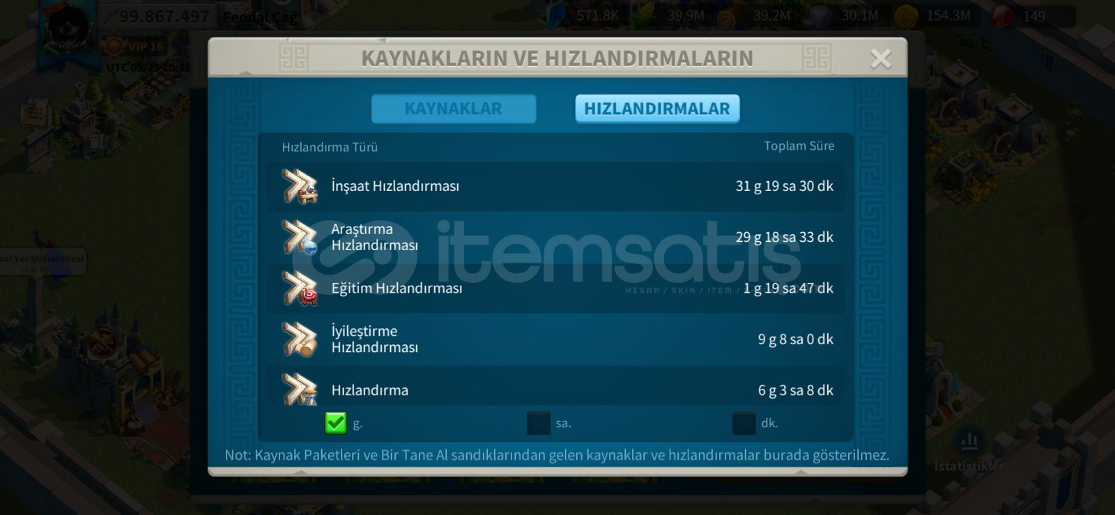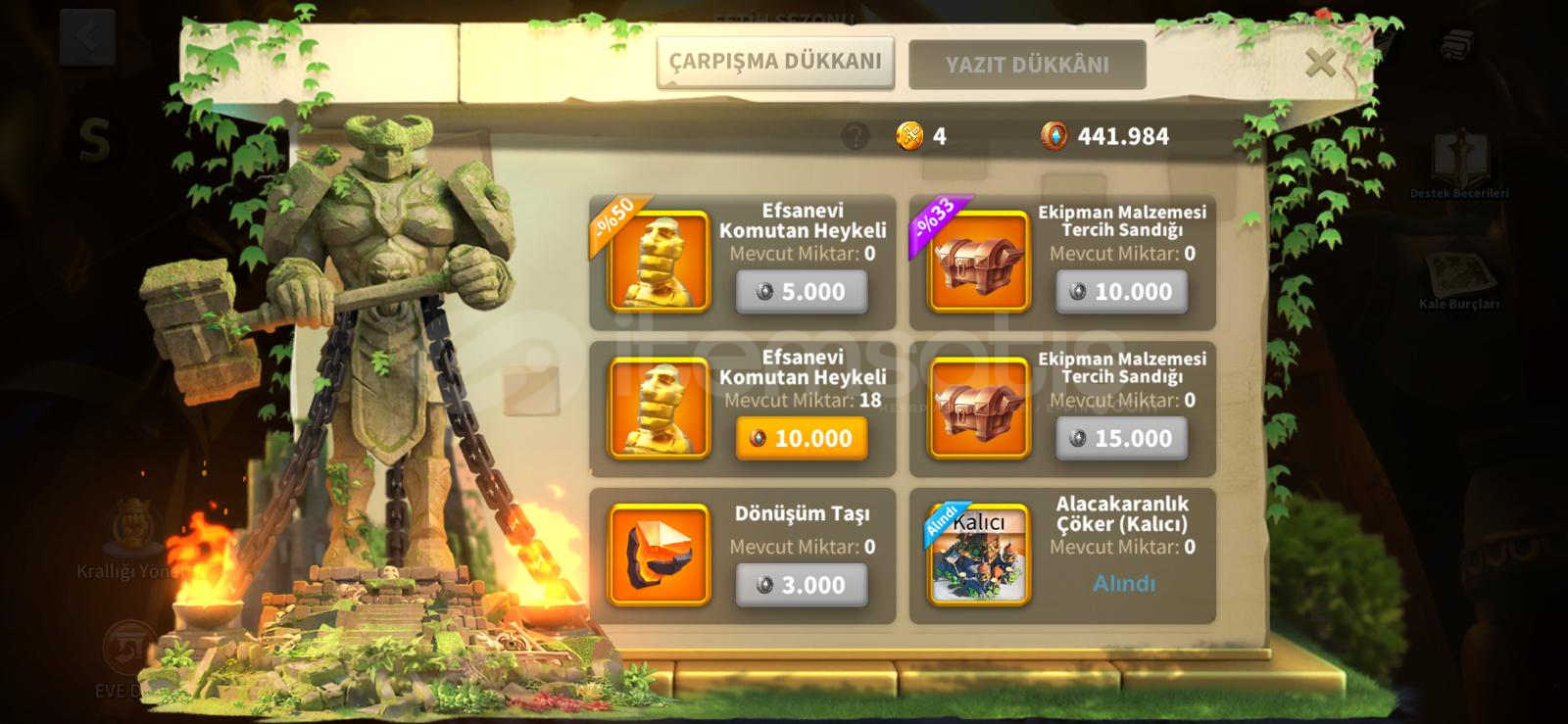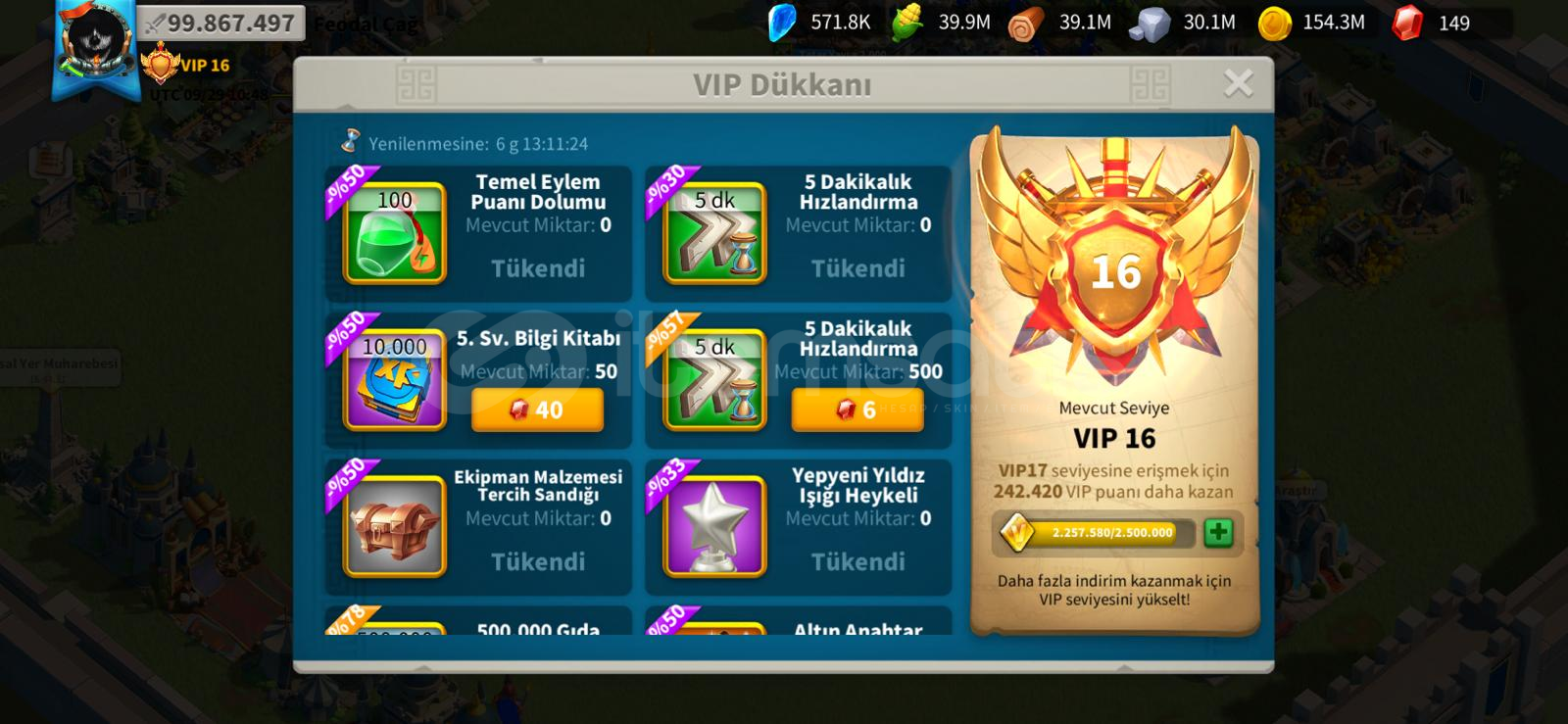 VIP 16 - 17 için 250k puan gerekiyor5 adet farm hesabı mevcut aynı krallıkta15B çantasında kaynağı mevcut30 pasaportu var 13 tane daha alacak birlil kredisi varAlacakaranlık ve İlahi mesken temaları mevcutKvk 450k sikkesi ve 4 tane sarı jetonu var34 sarı ekipman 3 aksesuar toplamda 13 kritikli ekipmanı mevcutUzmanlık komutanları toplam 23Huo QubingArthur PendragonQin Shi HuangBai QiAlexander NevskyWilliam Wallace...