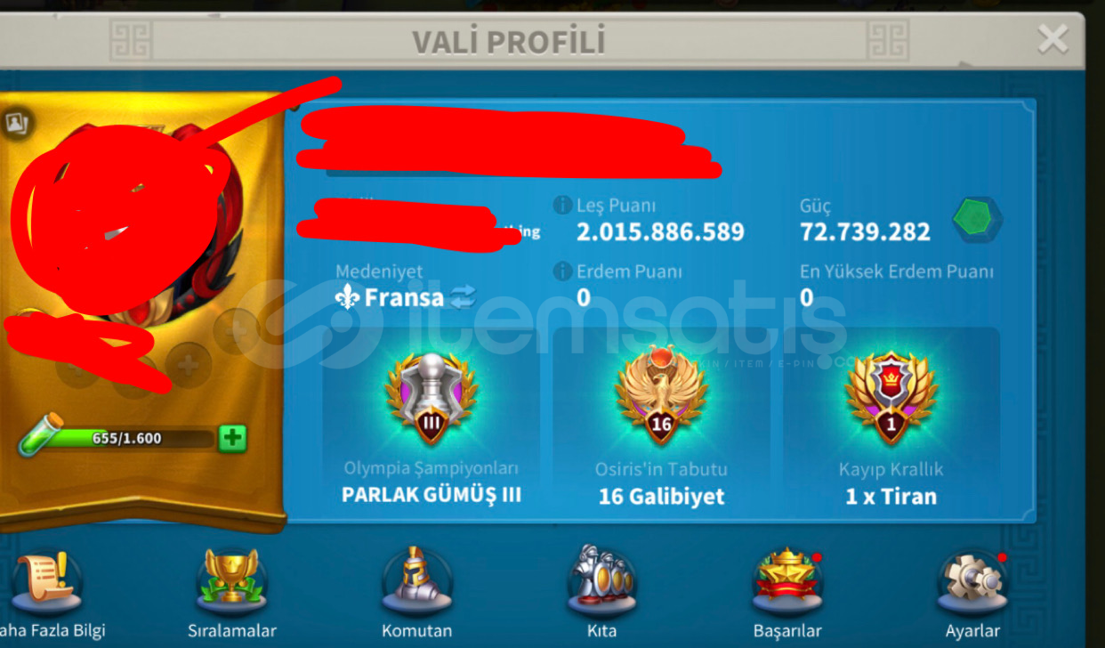 İLK GELEN ALIR! ★ Güç :76.000.000★ Leş Puanı :2B kp★ Wıp :15★ Hızlandırma :240 gün genel★ Kaynak :6b çantada 400 m farm hesaplarda ★ Pasaport :36★ Max Komutanlar : (HUO, Nevsky , Zhuge , Herman , jeanne , ragnar lodbrok ) arthur (5554) , scipio (5515) neredeyse 4 kıta ★ Efsanevi Ekipman :23efsanevi 5 kritik  ★ Bağlantı :Gmail ★ Efsanevi Te...
