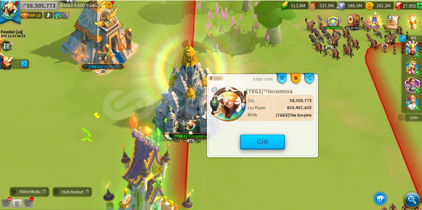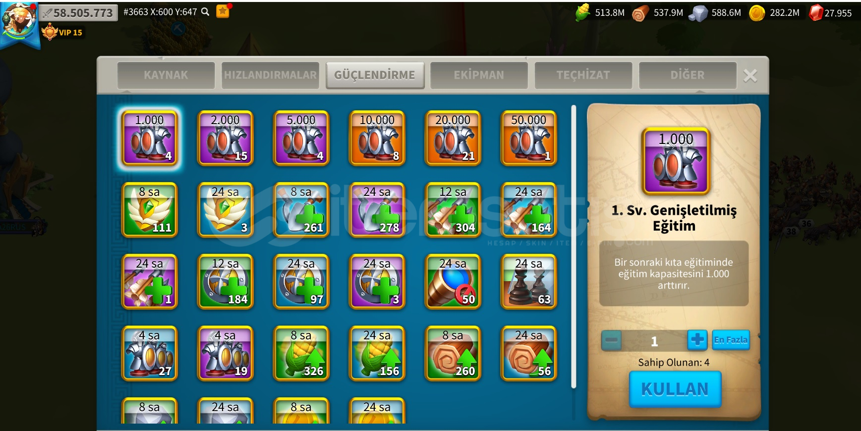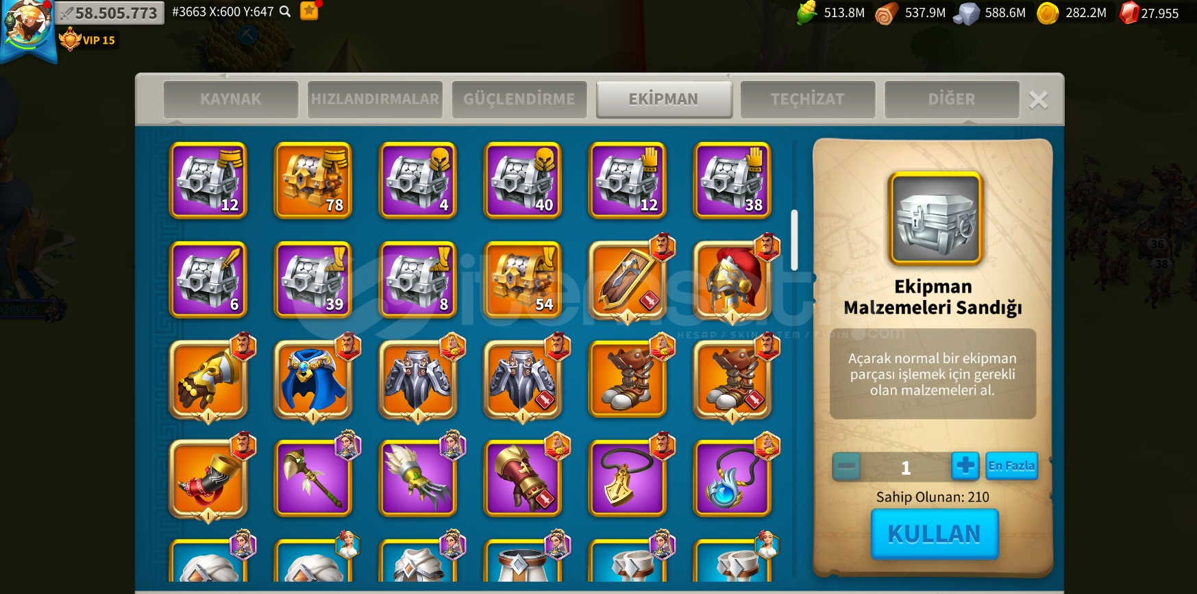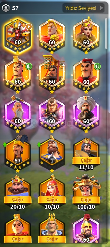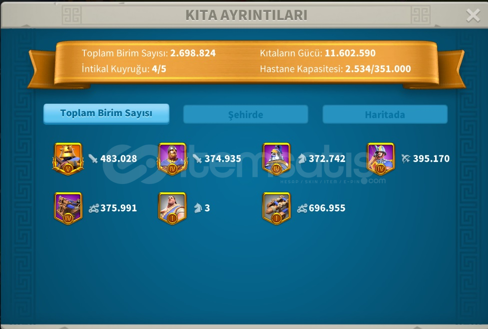 3663 Göçe Uygun t5 hesap(Piyade Hesabı) 58m Komutan: 5 Sarı (3 tanesi önemli) komutan full. -)Alex/Aethelfield - Bai qi/ Liu che - Qin Shi Huang/Zhuge Liang(5111) 465 sarı kafa çantadakafa için paket çekmek isteyen için açılmayı bekleyen 6 sarı komutan var ss i attım.farm komutanları yeterli seviyede fullenmiş durumda1 piyade seti sarı / 2. set yarım. Süvari ya da okçu i&cc...