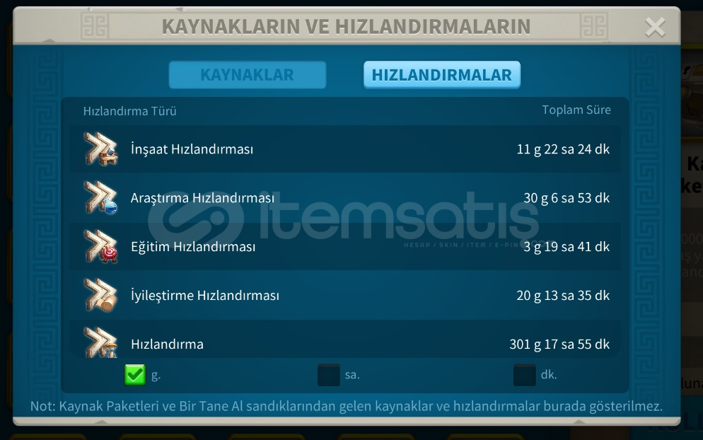 ⚡ Hızlandırma : 301g Genel Hızlandırma, 27g İyileştirme Hızı, 30g Araştırma Hızı, 3g Eğitim Hızlandırması, 11g İnşaat Hızlandırması
