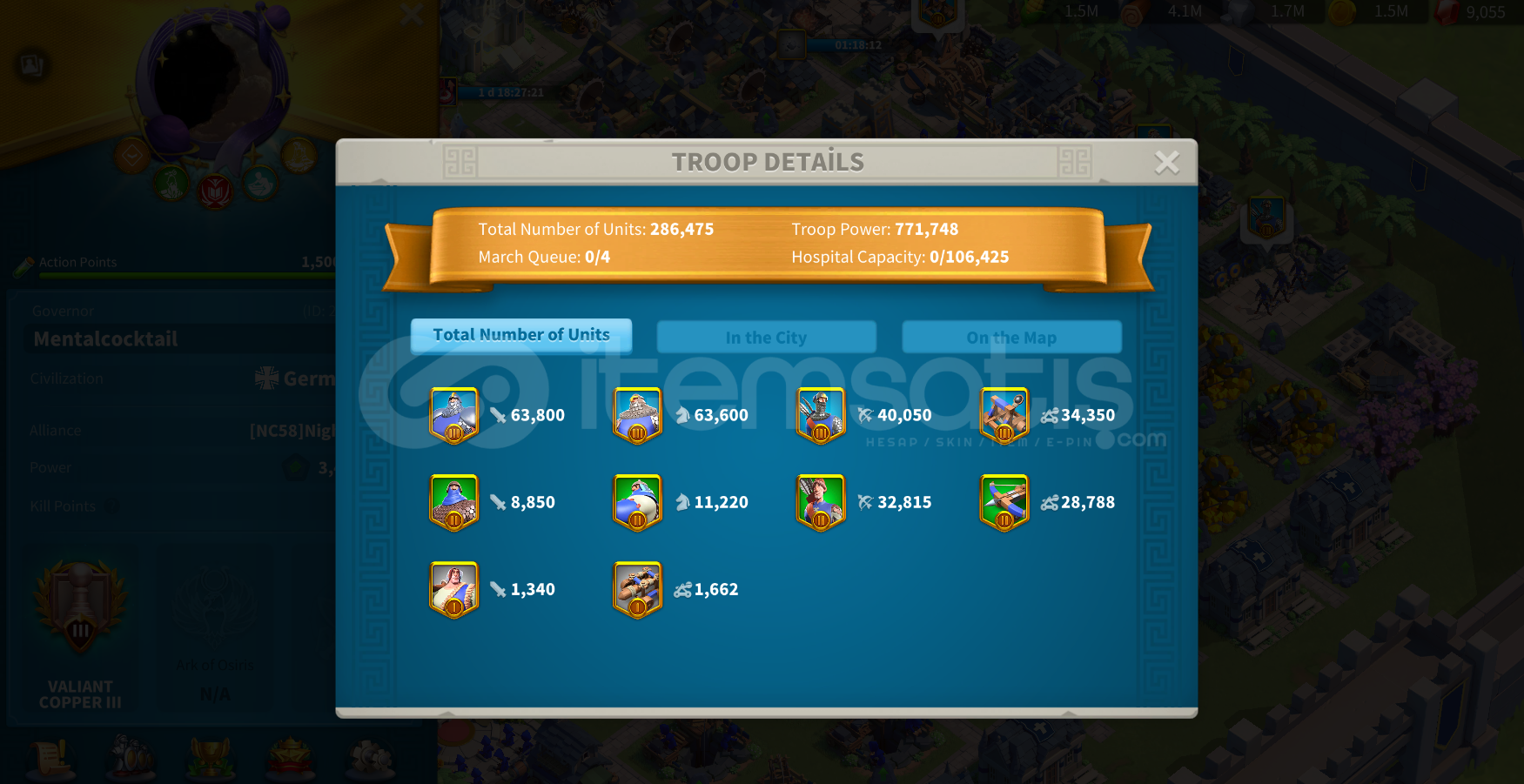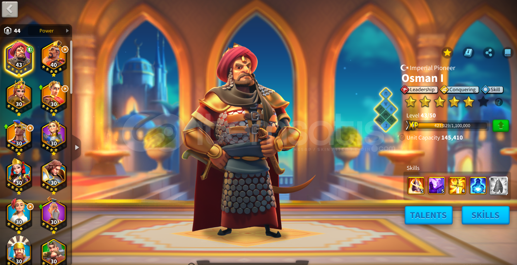 • Komutanlar: Osman I (43 Lv, 5-5-4-4, Mavi Set), Cao Cao (40 Lv), Aethelflaed (30 Lv). Hesapta Sun Tzu 30 ( 30 Lv, 4-2-2-1 ) ve +50 Mor kafa mevcut. Paket destekleri ile dilenen epic komutan fullenebilir.