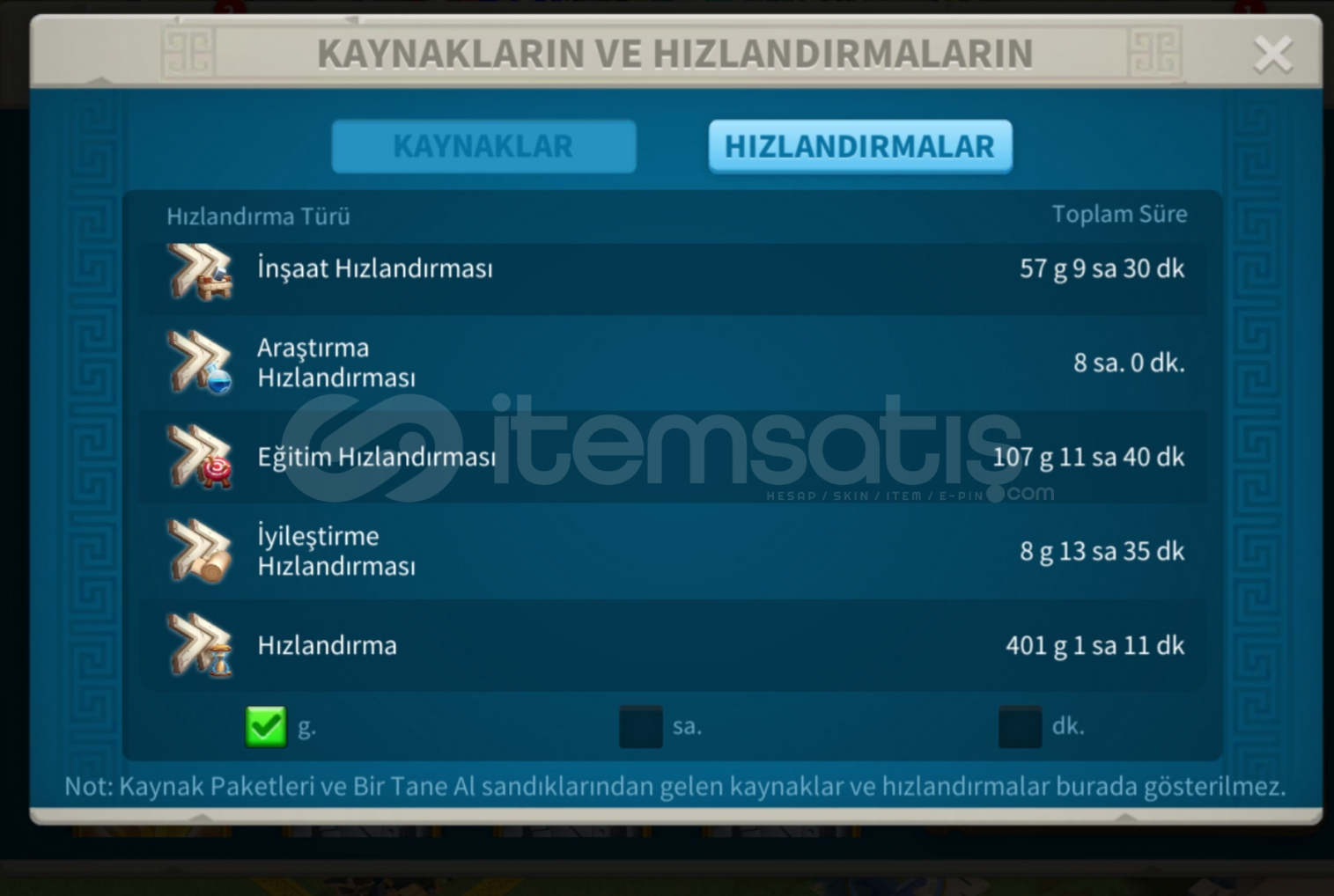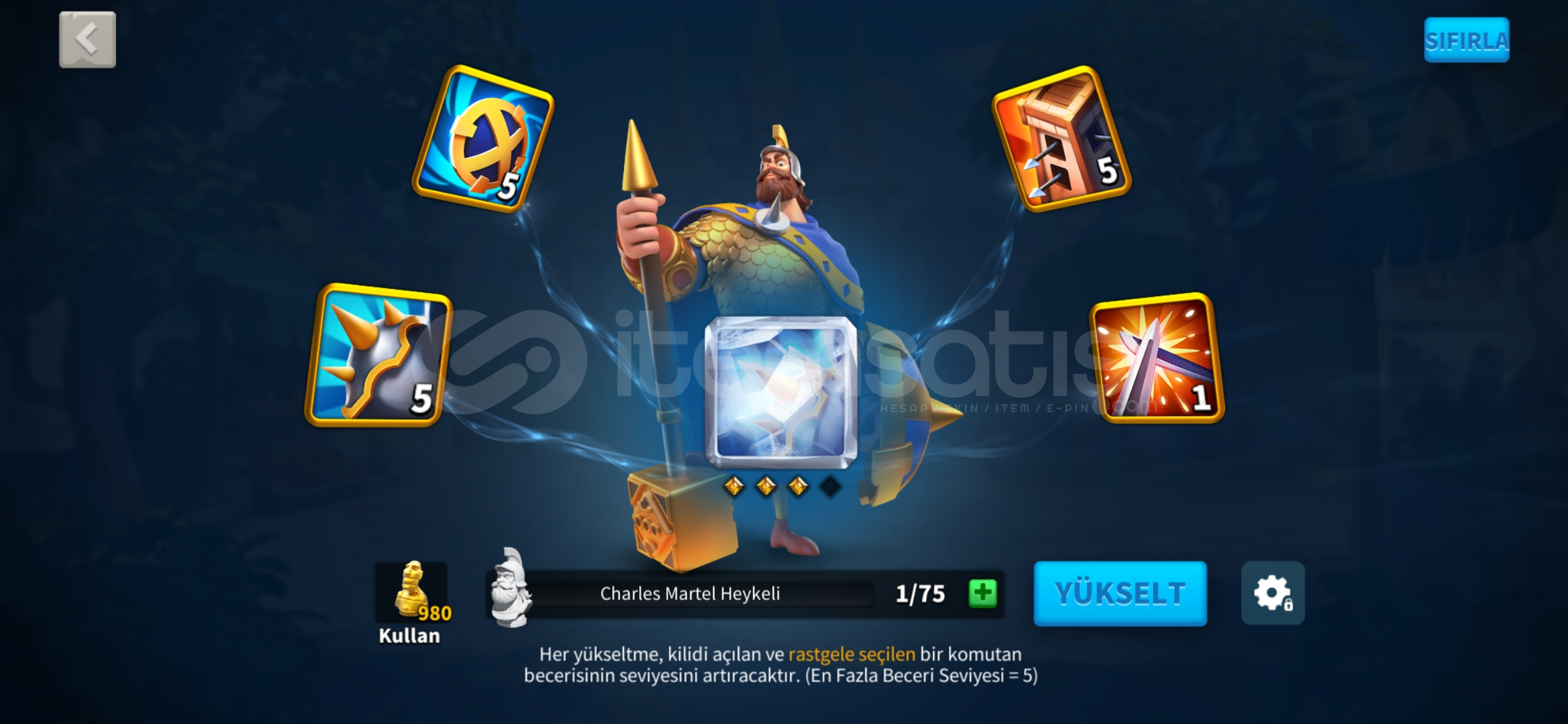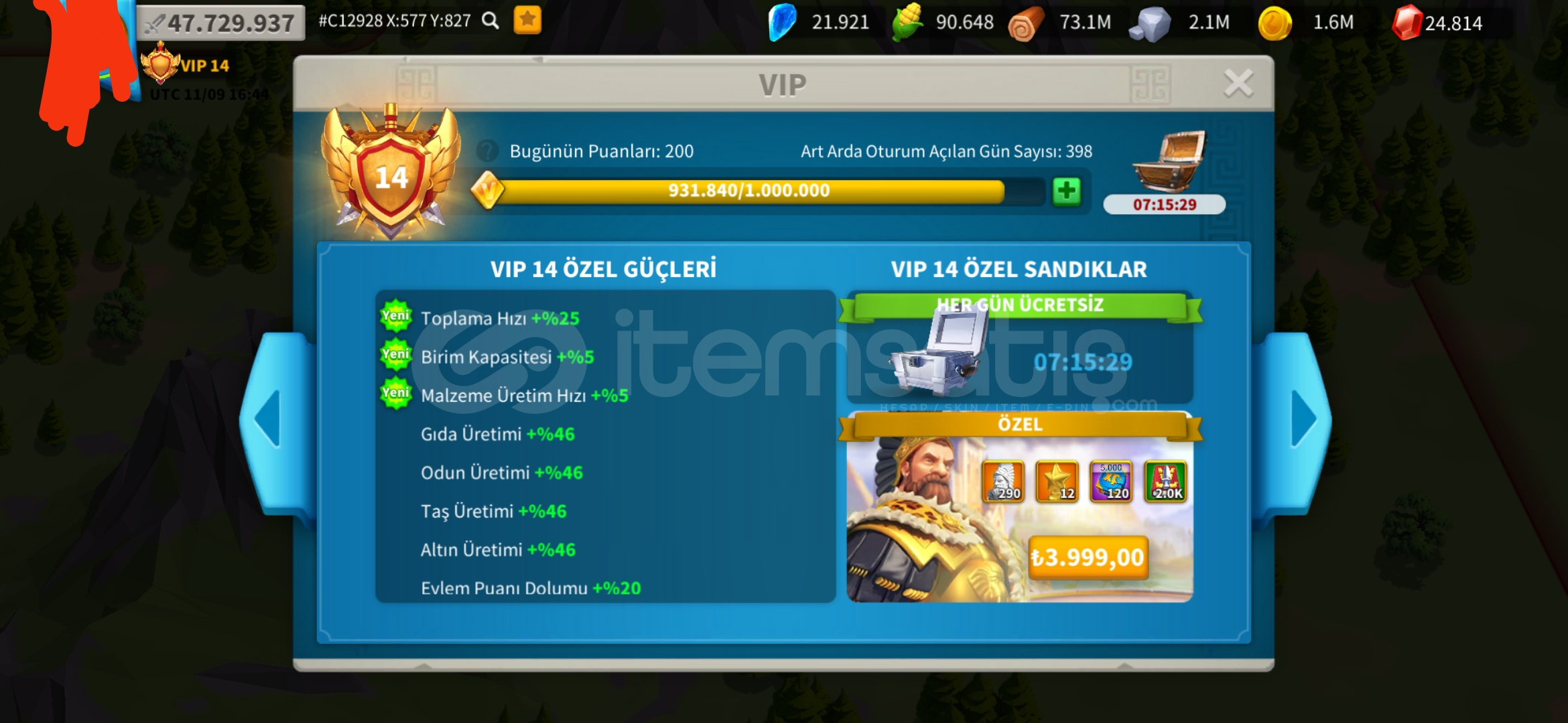 398 günlük hesapKVK 4 Dönebilen harika genç T5 hesap satılıktır.Alacakaranlık Çöker efsanevi kale teması vardır.(Beceri Hasarı +5)Hızlandırma ve kaynak resimlerde mevcuttur.980 altın kafa vardır.Vip 15 olmaya çok yakın.
