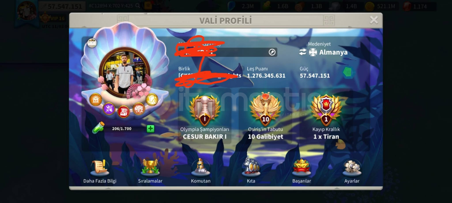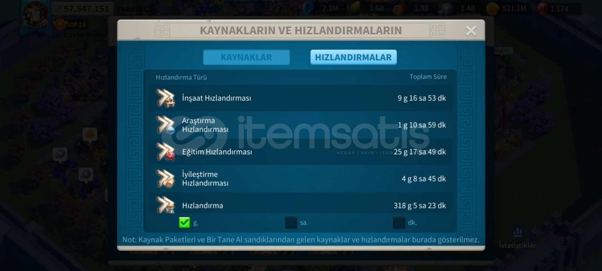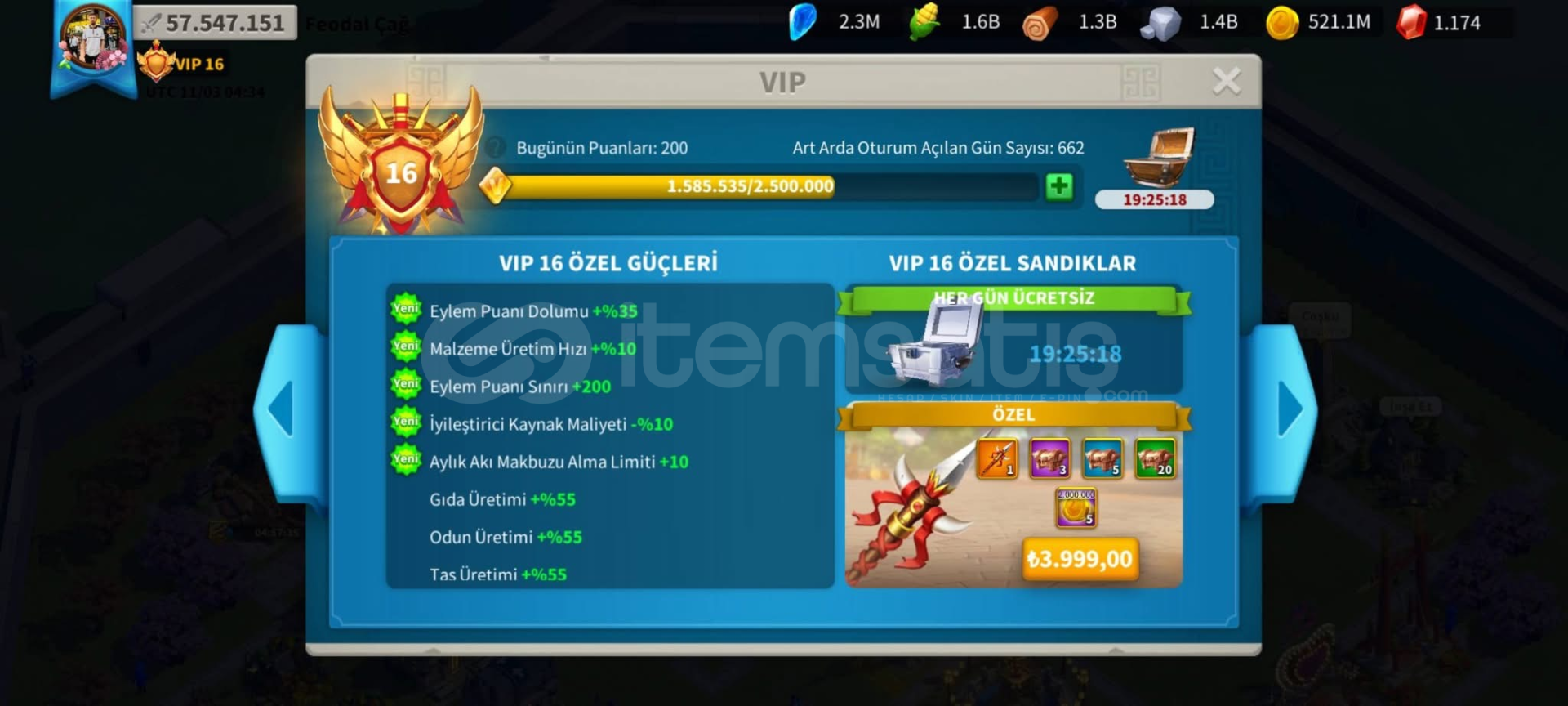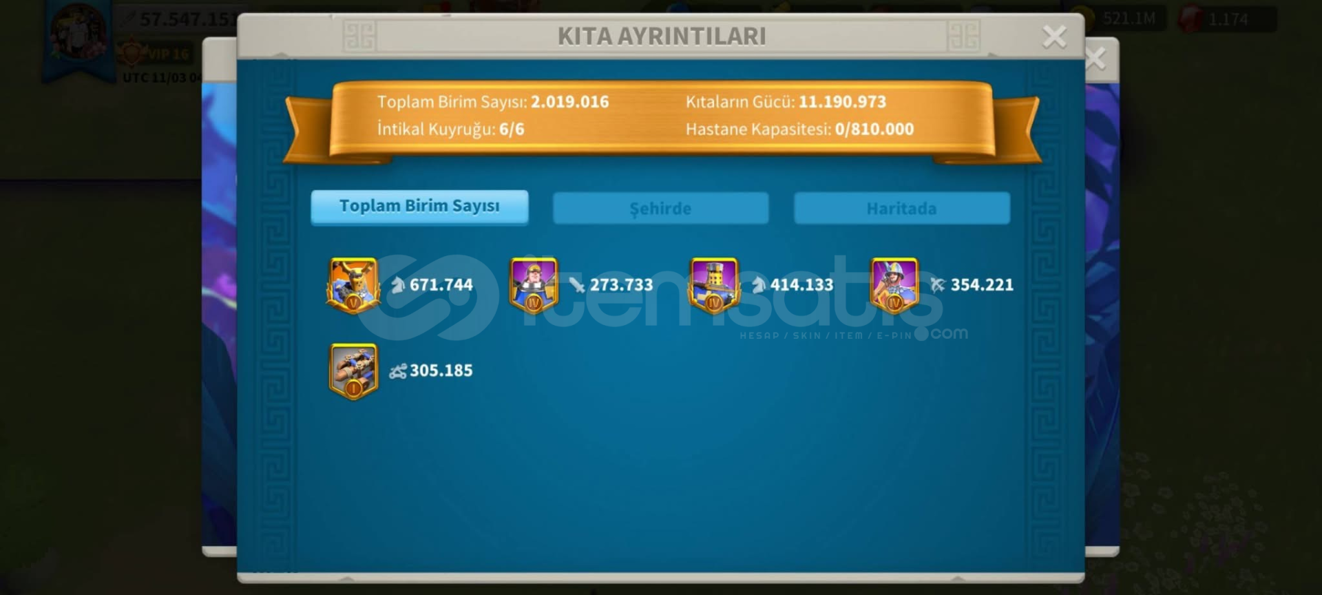 661 GÜNLÜK VİP 16 T5 RALY VE AÇIK ALAN HESAP! ● Full Komutanlar :Hugo Qubin ,Arthur ,Nevsky ,Jeaned Arc ,Atila ,Kleopatra ,ıshida mitsunari ,Heraklius 5-5-1-1, Qin Shi 5-5-1-1Subutay 5-5-5-4 mg de gelecek heykeller ve elindeki heykeller basılıp Subutay da fulenilir● Güç :57M + 13M+9M farm hesabı ● Hızlandırma :318 GÜN GENEL, 25 GÜN eğitim● Rss : Total 6B 3 gün sonra KVK...