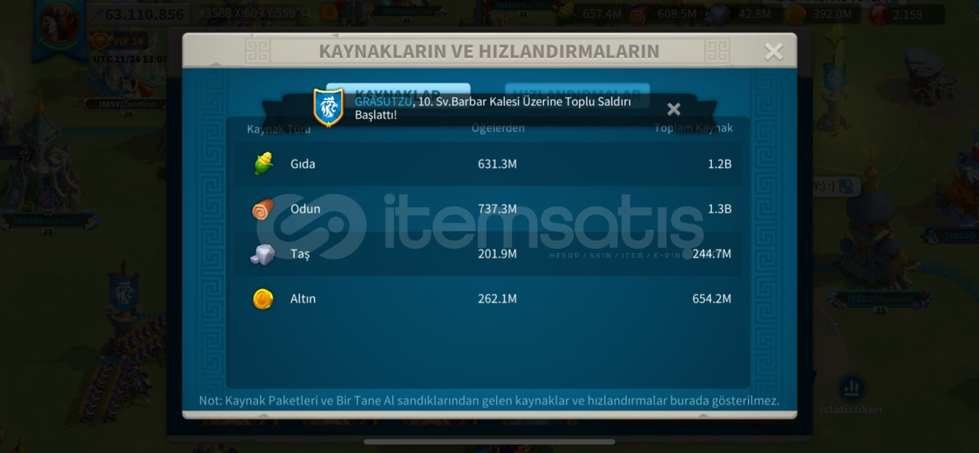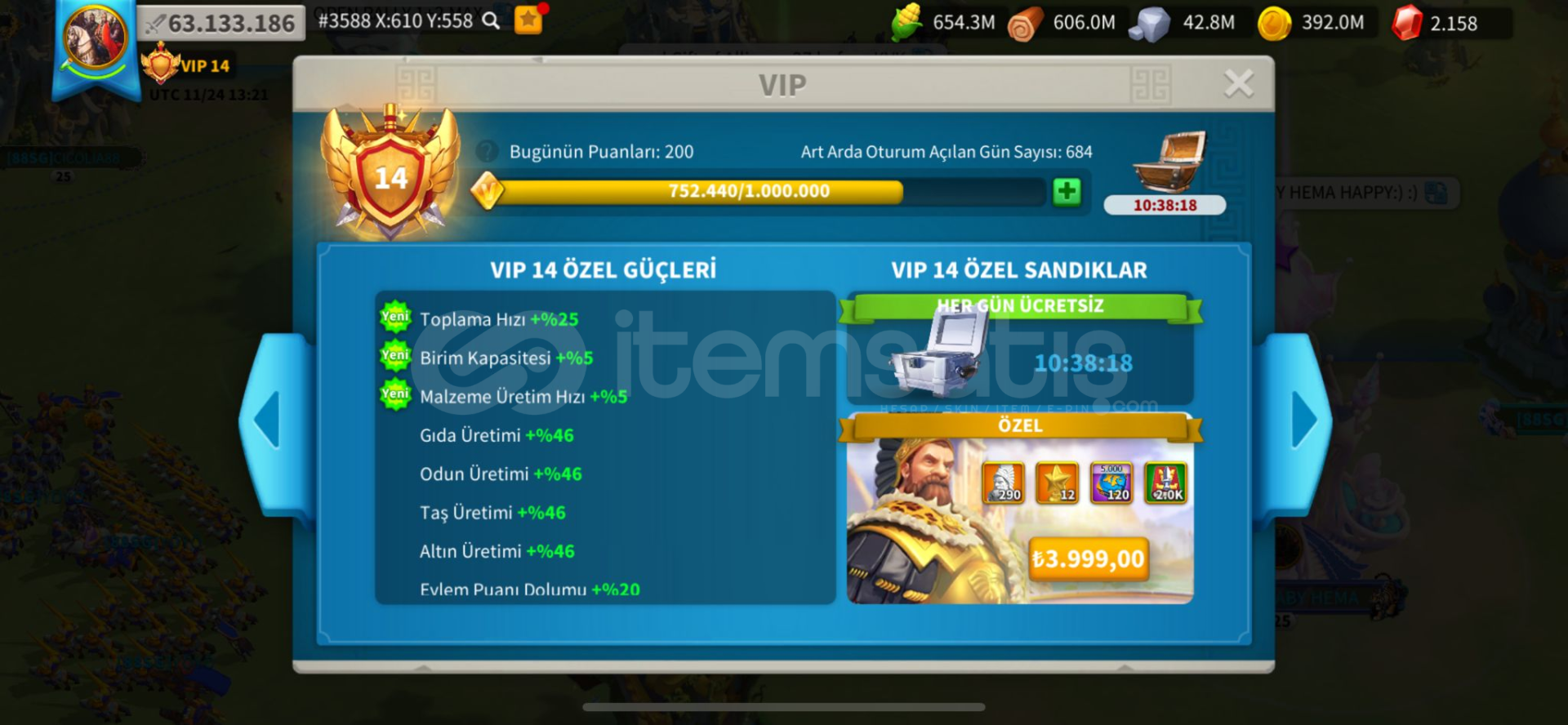 63M VİP 14 | T5 3 TANESİ AÇIK GENÇ KRALLIK 3588 + 1 FARM HESAP 15M GÜÇ + 500M KAYNAK | KAYNAKLI HESAP | 1.150 KP 70 GÜNLÜK HIZ (SAĞLAM HESAPTIR.)ACİL SATILIK!!!