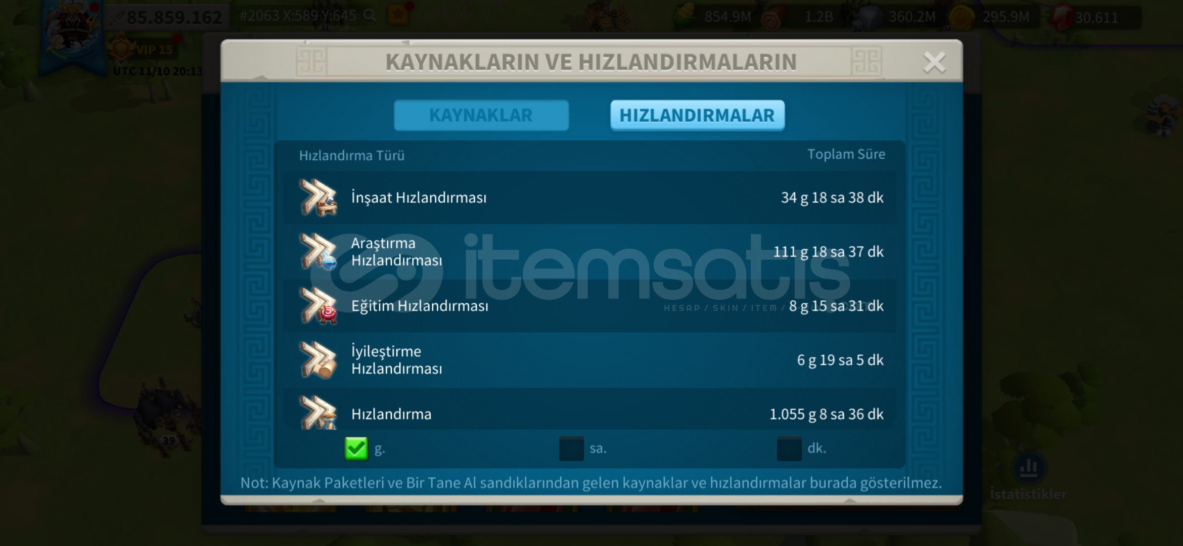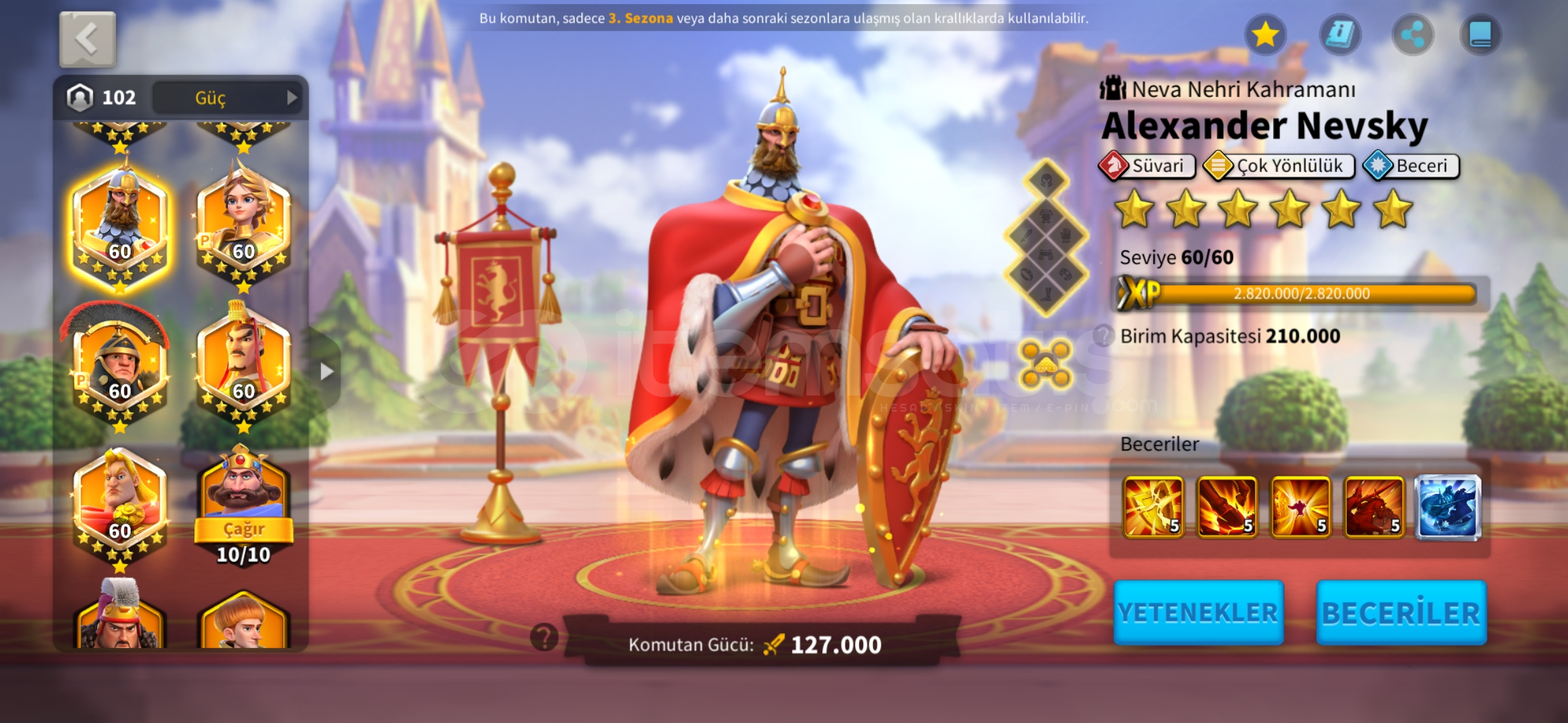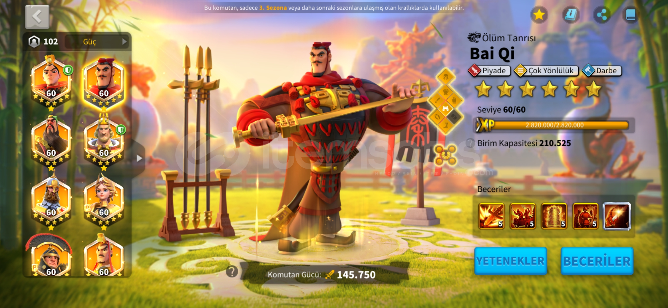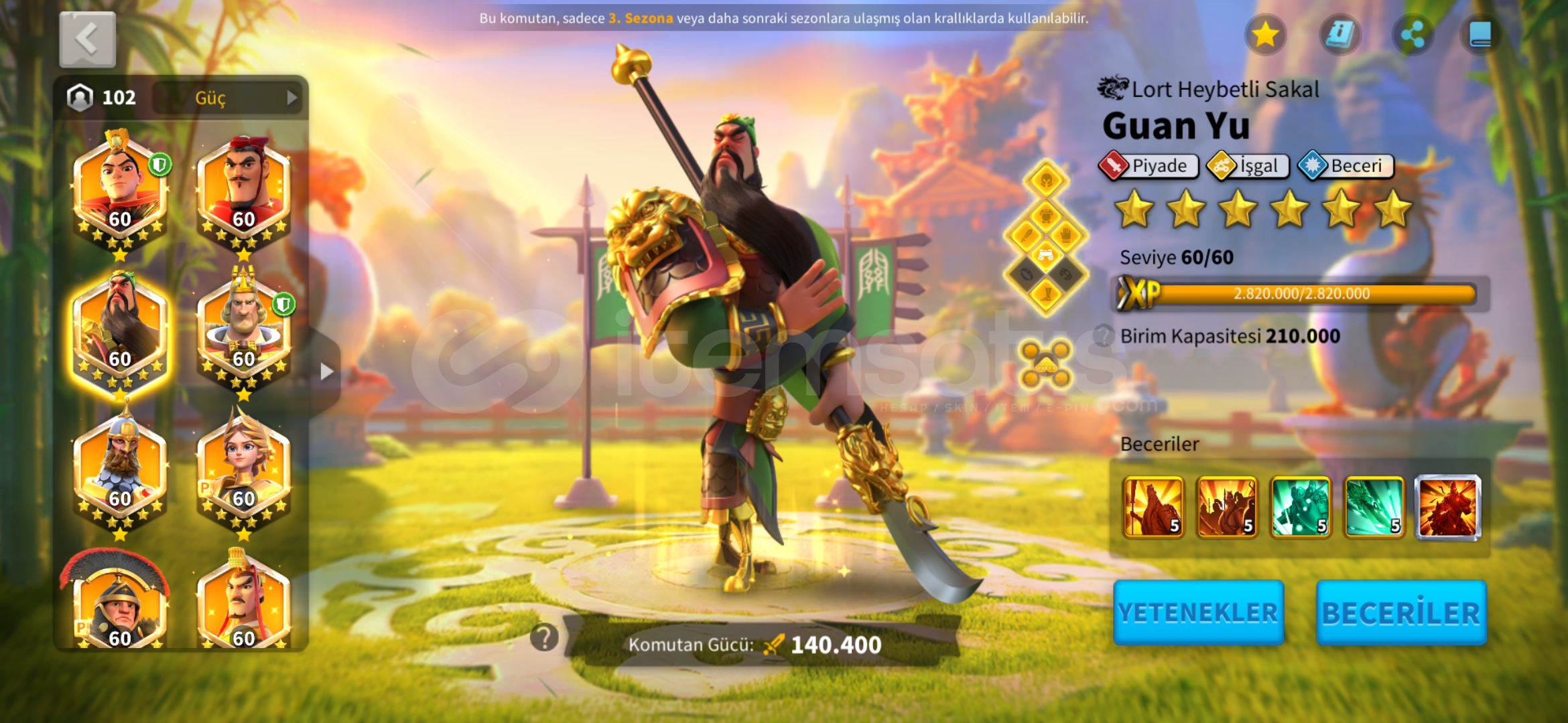 *_VİP15 TATİL BİLETİ İLE HAZIR GÖÇ EDEBİLİR T5 MİX HESAP !★Güç : 85 M★Gün : 1239★Vip: 15★Komutan: Jeanna Prime - Huo - Liu Che - Arthur - Bai - Guanyu - İskender - Nevyks - Africanus - Aetfield + T.K★Şehir Temaları (yalnızca efsanevi) ; Peoseidiyonun mabedi (30gün) zamanın kumları (15 gün)★Pasaport ; 27 tatil bileti verilcek★İttifak kredileri...