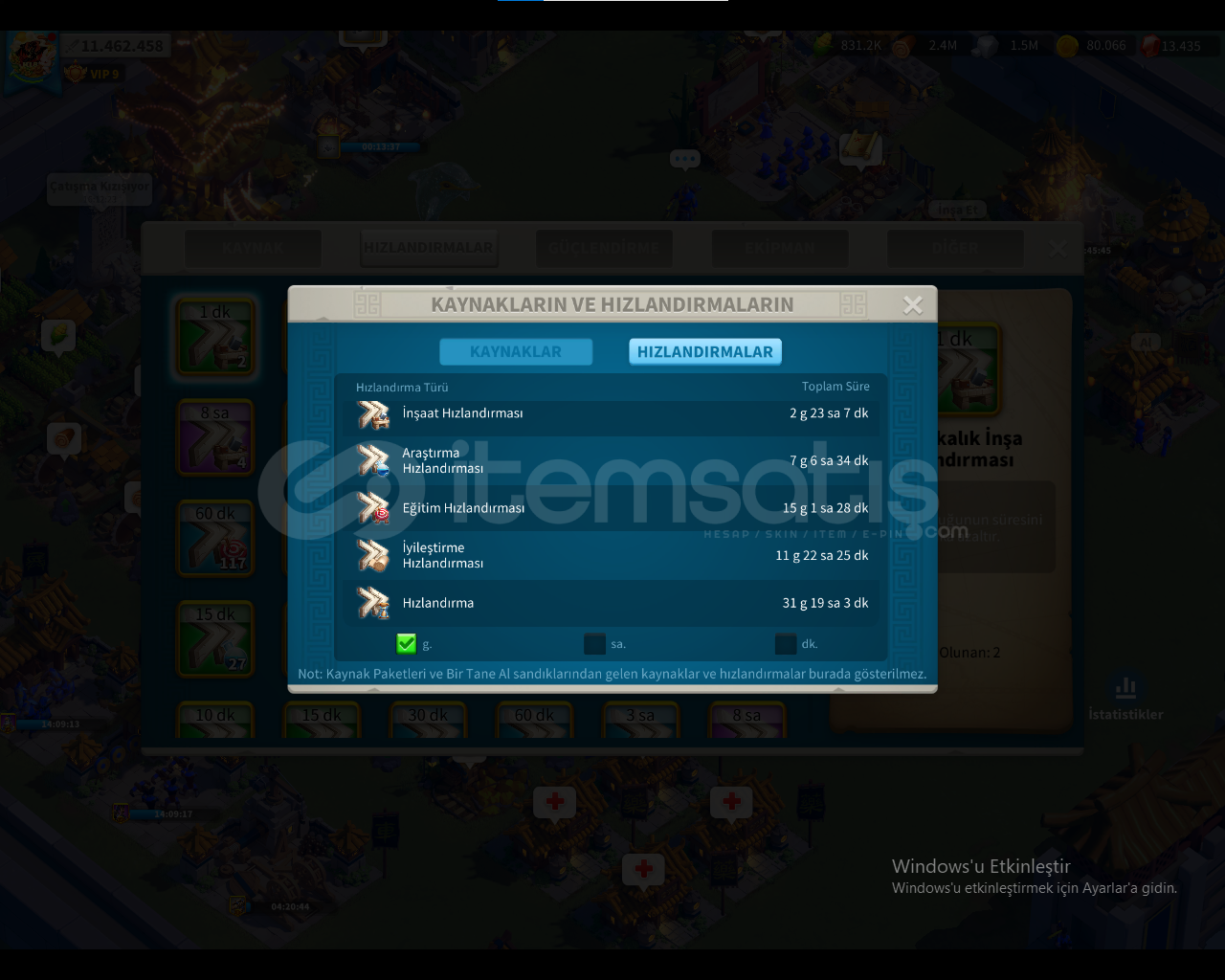 31gün genel hızlandırma 3 gün inşaat 7.5 gün araştırma hızlandırma 12 gün iyileştirme 15 gün eğitim hızlandırması vardır