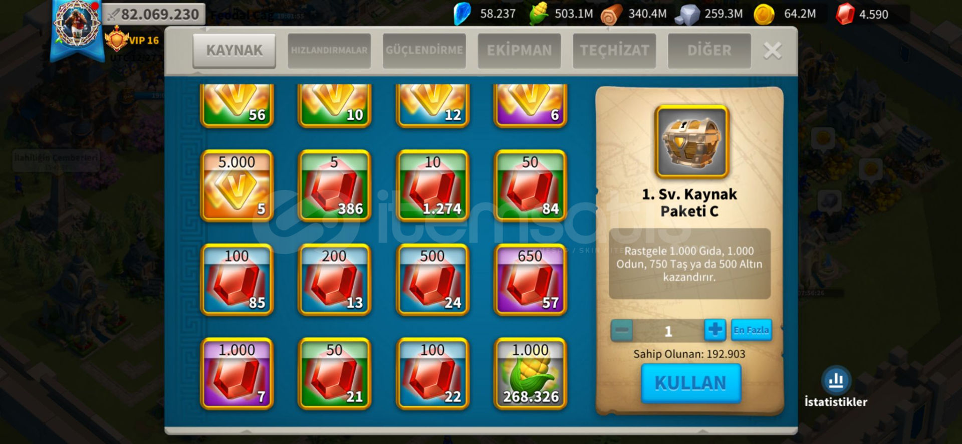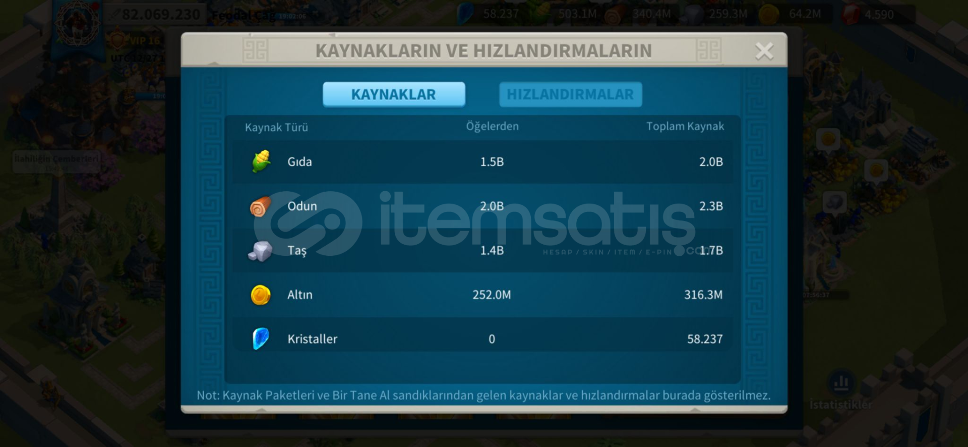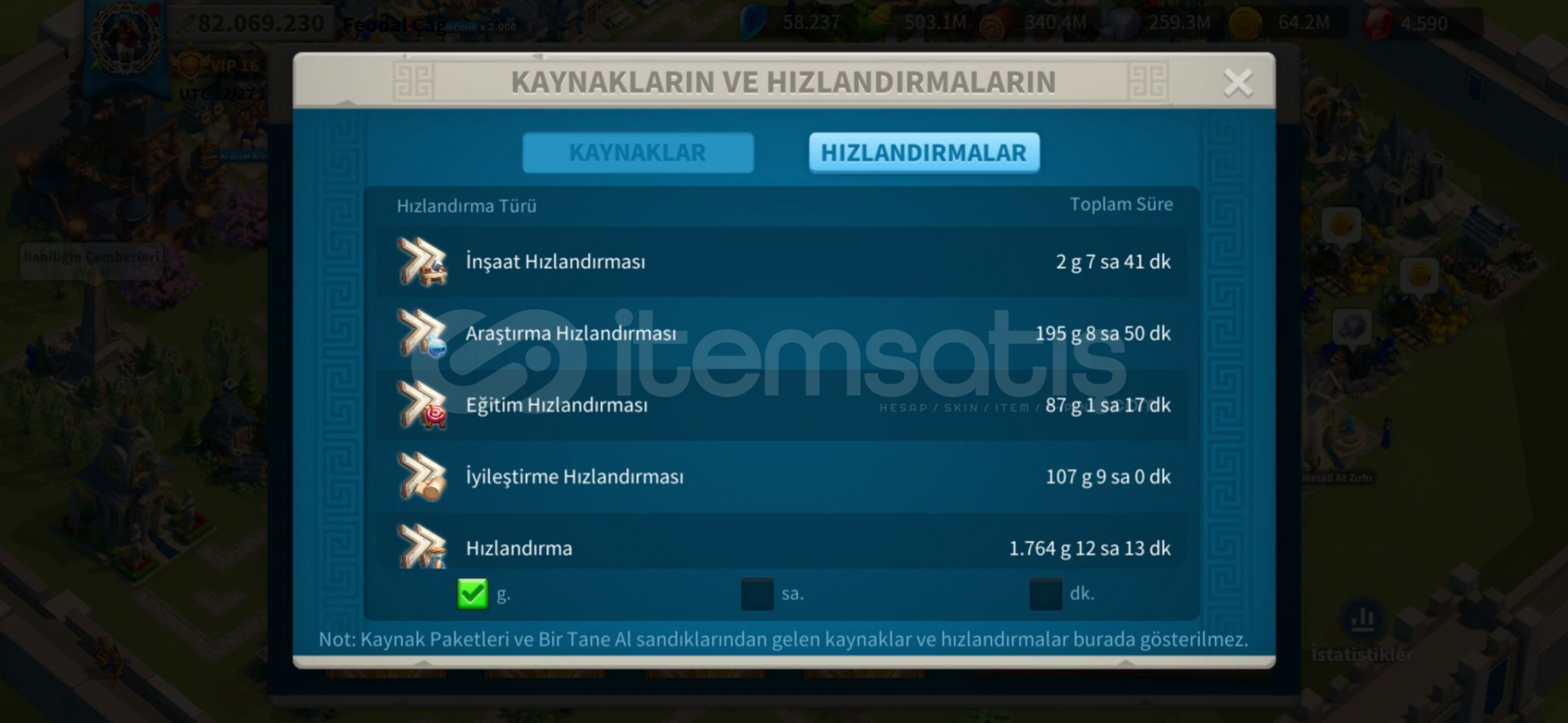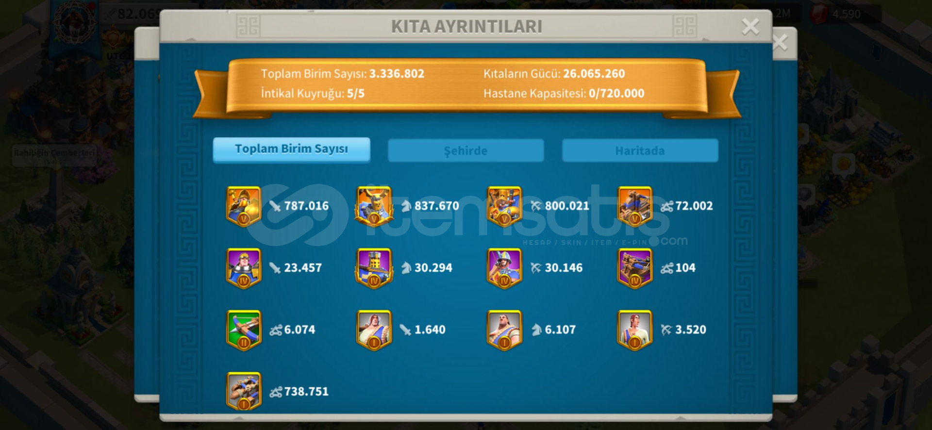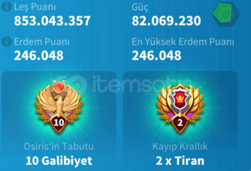 ● Full Komutanlar : huo ,zhuge, liu che, arrthur, scipio,boudica, jeanne,hermann, minamoto, gorgo, cao,nevsky, xiang yu, ysg, martel● Güç : 82m● Hızlandırma :toplam 2k gün● Kaynak (RSS) : toplam 6.5b ● Eylem Puanı (AP) : 160k● Öldürme Noktaları :850m● Ölen Birlik :21m● VIP Seviyesi :16● Pasaport :15● Gümüş Kredi :5m+● Altın Heykel : 300● Efsane...