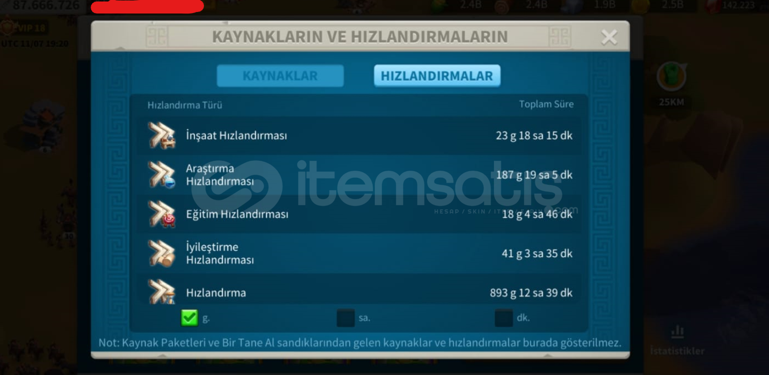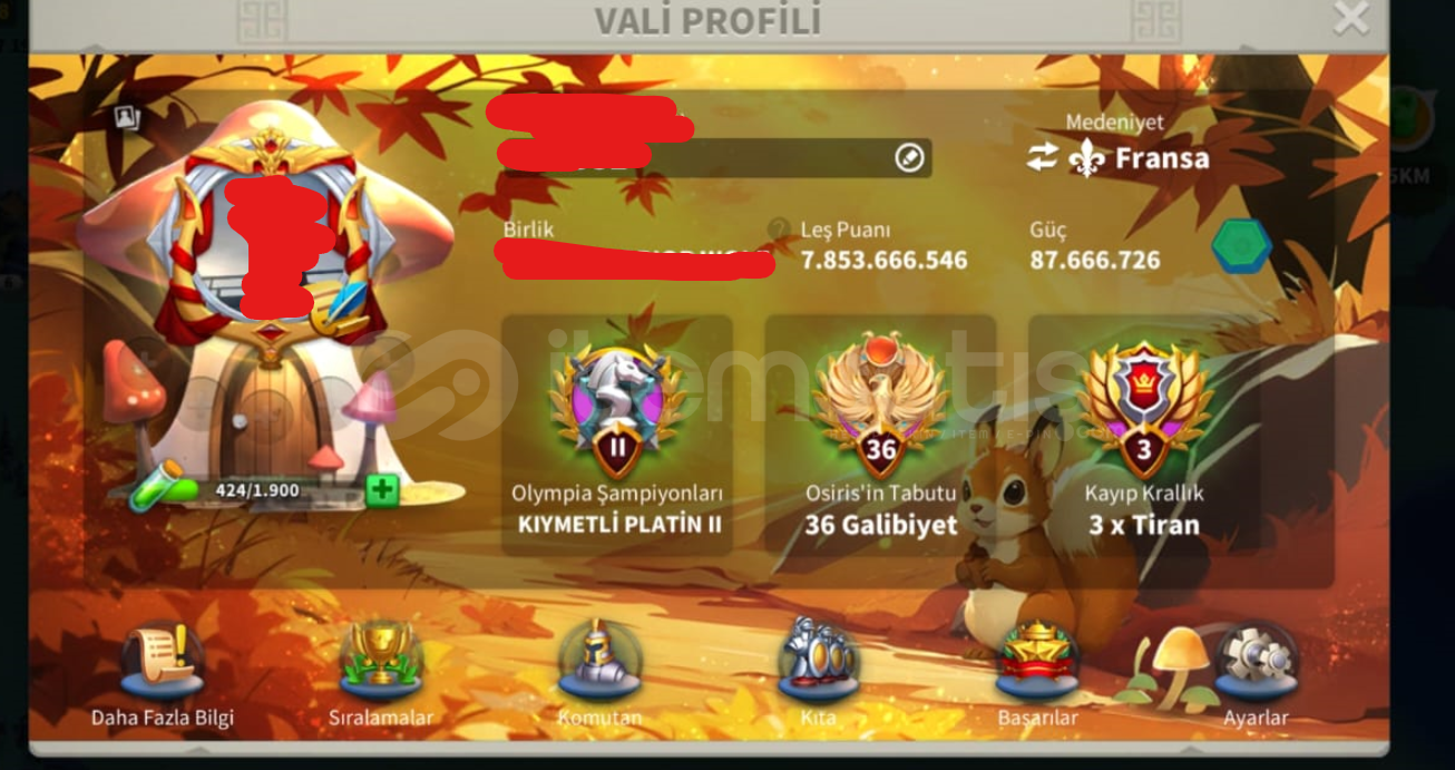 *• VİP :*18 (19'A 1,5 M) • GÜÇ : 87 M*• KİLL PUANI :*7,7 B KP*• FULLKOMUTANLAR :*Atilla – Nevyks – Africanus –TARIK BIN ZIYAD - Jeanna Prime –  Huo – Liu Che – Arthur Prime – Konstantine – Ysg – Cao – William – Richard – Minamato – Martel – Selehaddın – İskender – Guanyu –Hannibal Barca –Sandeok -ıs...