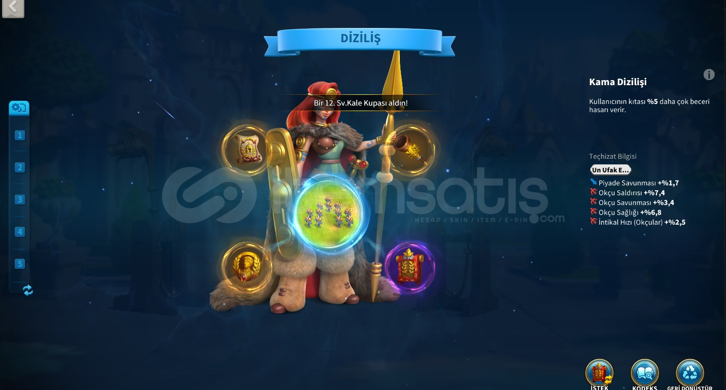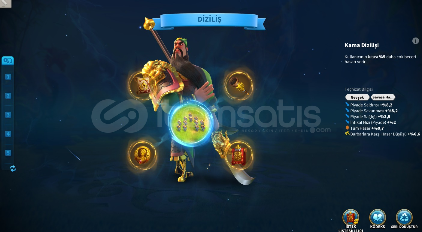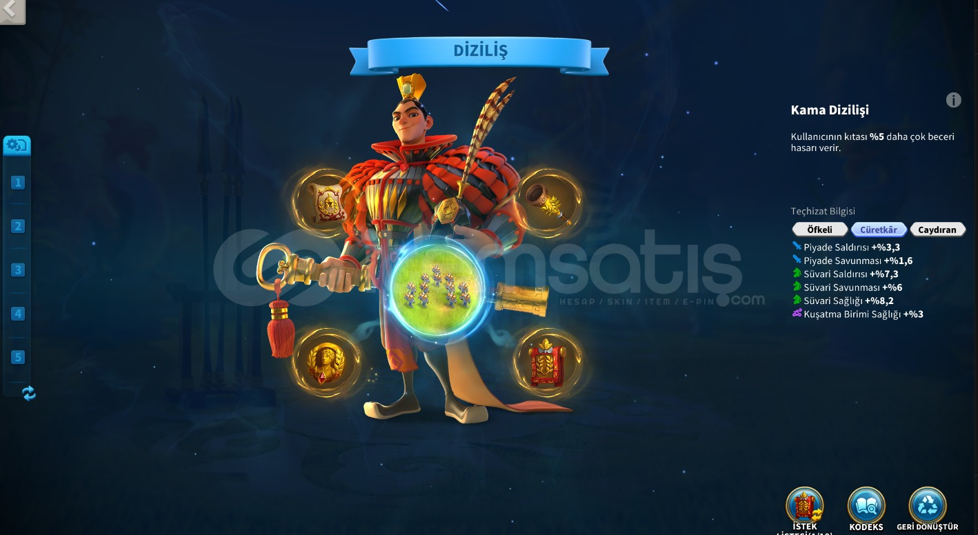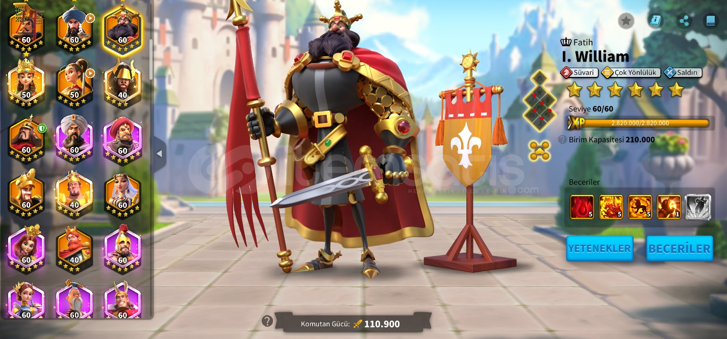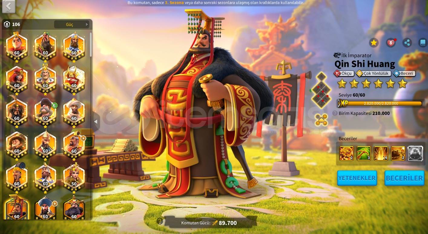 ★Güç :76.937.798★Vip: 15 --> (16'ya 370K)★Komutan:Qubing, Guan, Nevsky, BoudicaP, Arthur, Takeda, Xiang, JanZizka, Tarıq, Zhuge, Martel, Cengiz, Mehmet, Cao, Elcid, Aeth, T.K --> (William 5551, Saladin 5551, Qinshi 5311, Yss 5511 ve bir ton yarım komutan. ''Altın sandık komutanlarının hepsi 5553.'')★Pasaport ; 9★İttifak kredileri; 5.650M★Altın kafalar; 18★Ekipmanlar; 25/6 ---> 1 Adet V , 1 Adet IV ...