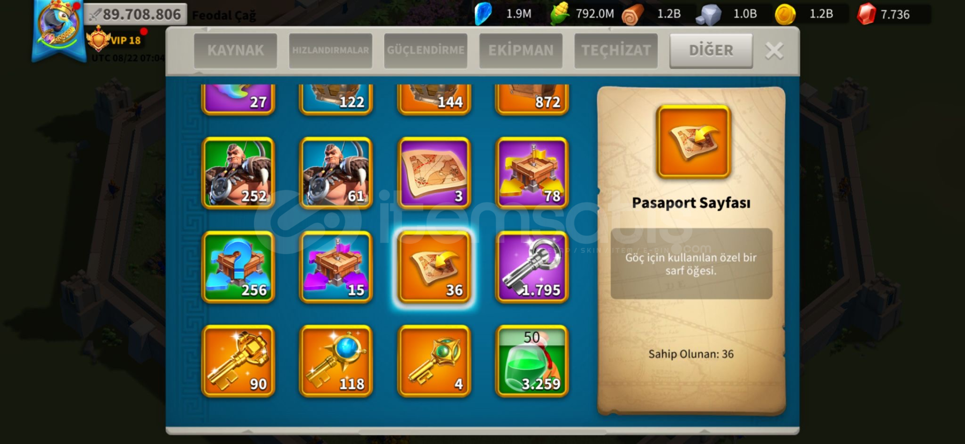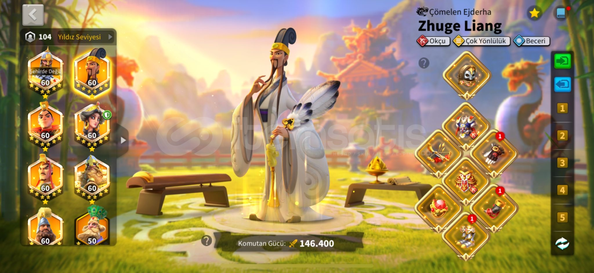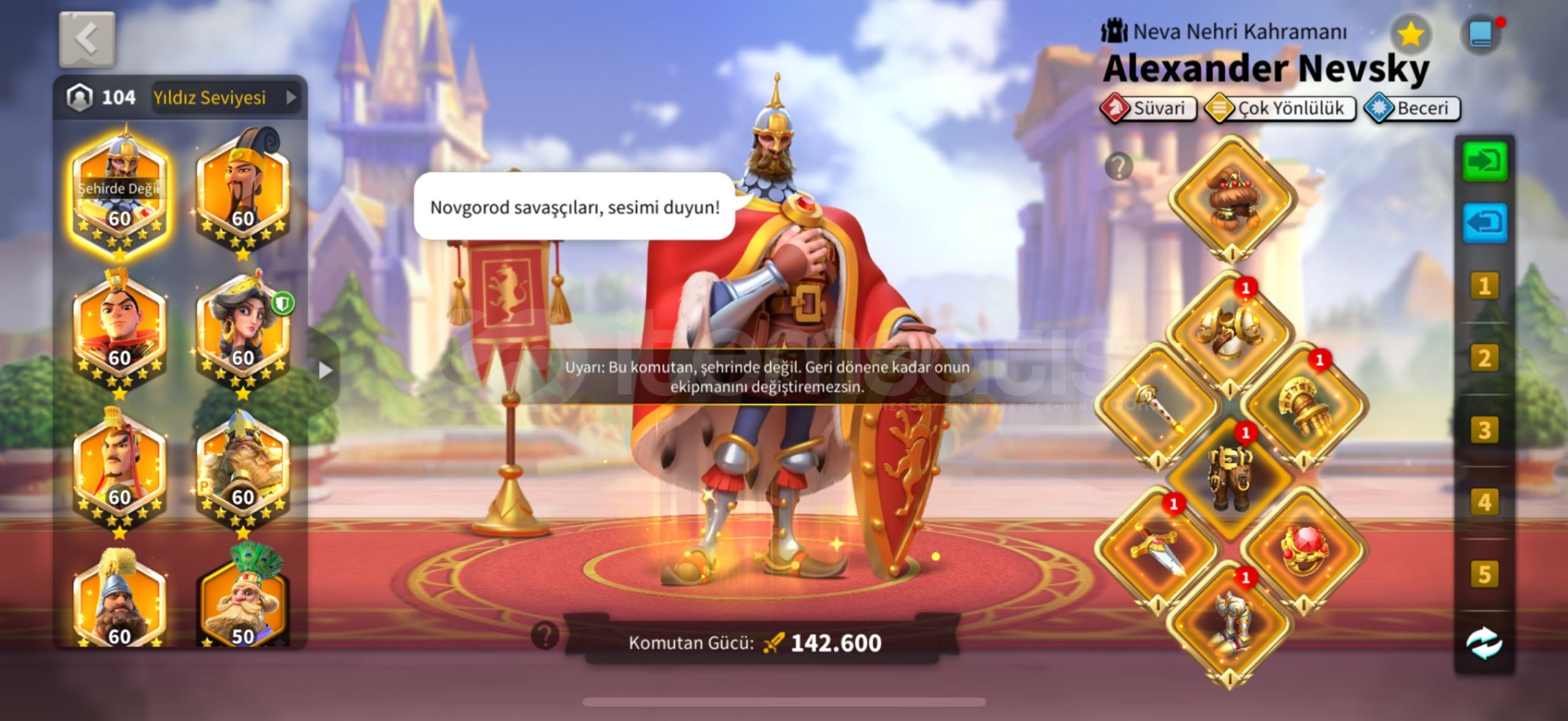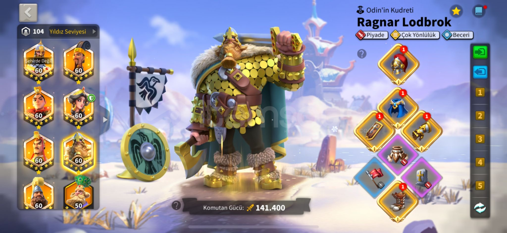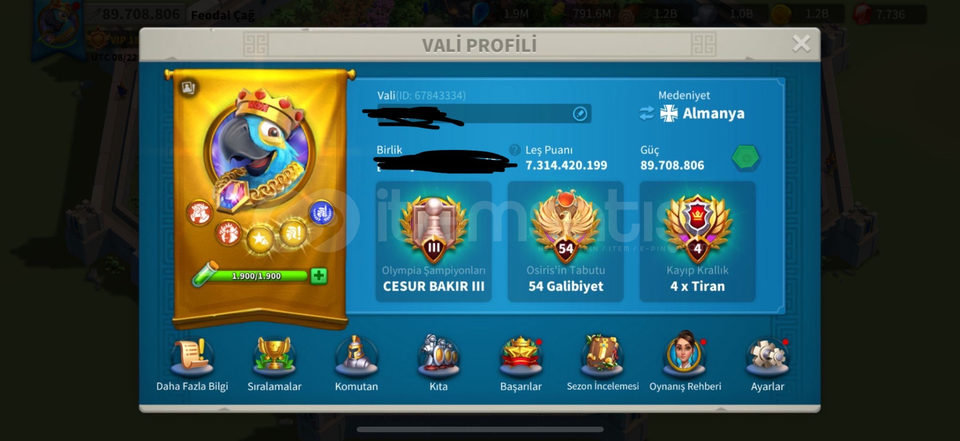 GÜÇ:88.807.806VİP:18KOMUTANLAR:Nevsky-Zhuge-Huo Qubing-Gorgo-Lui Che-Ragnar Prime-II.Philip-Boudica-Jeanna Prime-Saargon-Herman-Arthur-Konstantine-Ysg-Cao-Richard-Minamato-Martel-Selahaddin-İskender-Guan Yu-William-Harald-Scipio AfricanusŞEHİR TEMALARI(EFSANEVİ):Alacakaranlık-Aziz Peter Bazaliskası-Topkapı SarayıPASAPORT:36İTTİFAK KREDİSİ:30M(DÖNÜŞTÜRÜLEBİLECEK TASLAKLAR MEVCUT)ALTIN KAFA:3...